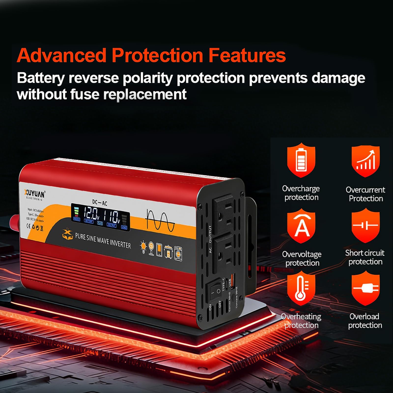 Smart LCD Display & Auto-Detect: Color LCD shows battery/output voltage and fault codes; auto-detects 12V/24V input and allows 50Hz/60Hz output switching for global compatibility, Battery reverse polarity protection prevents damage without fuse replacement; includes overload, overheat, overcharge, discharge, and short-circuit safeguards