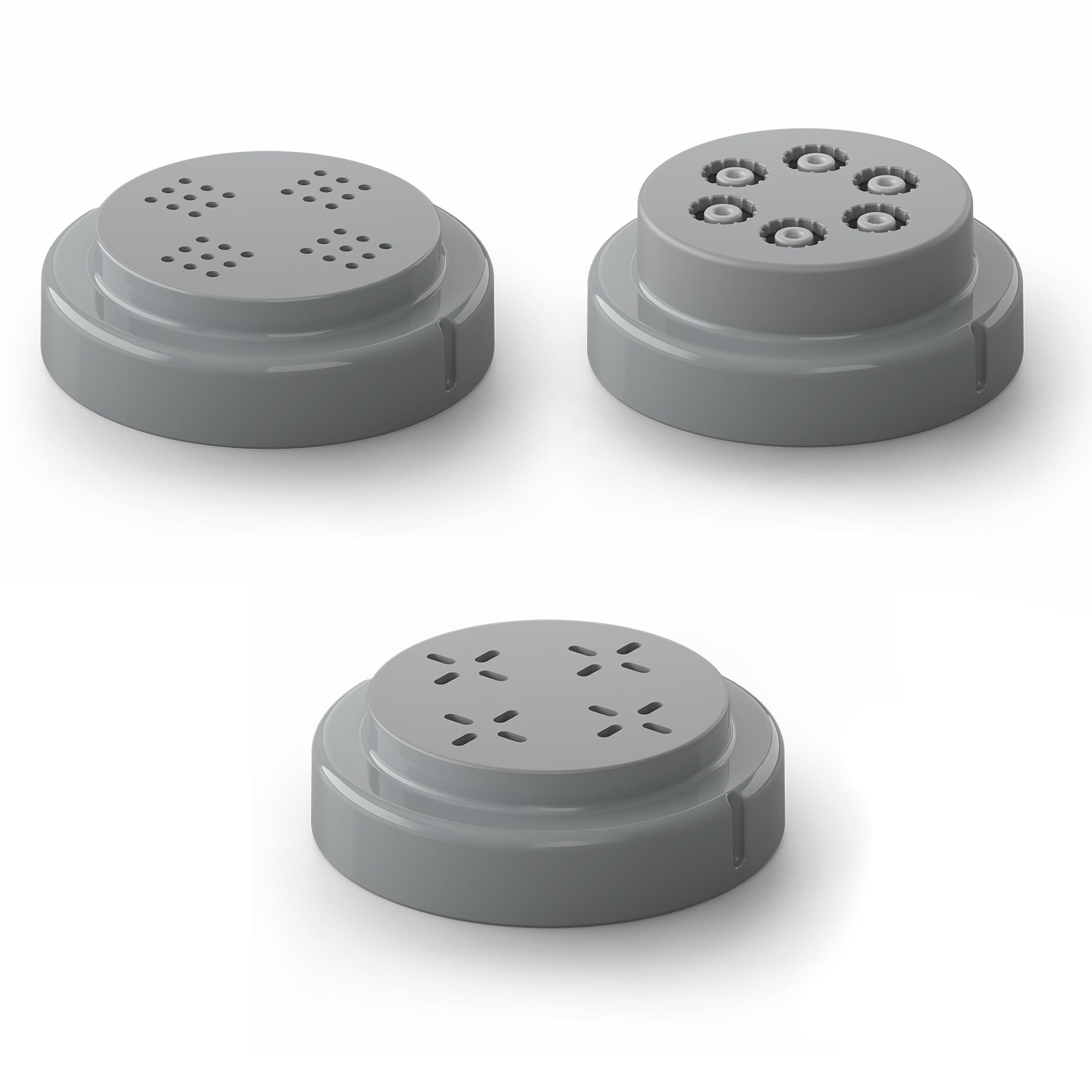 With the machine there are 3 default classic shaping discs for Spaghetti, Penne and Fettuccini. The special shaping discs enable a double extrusion process to assure smooth pasta and noodles consistently