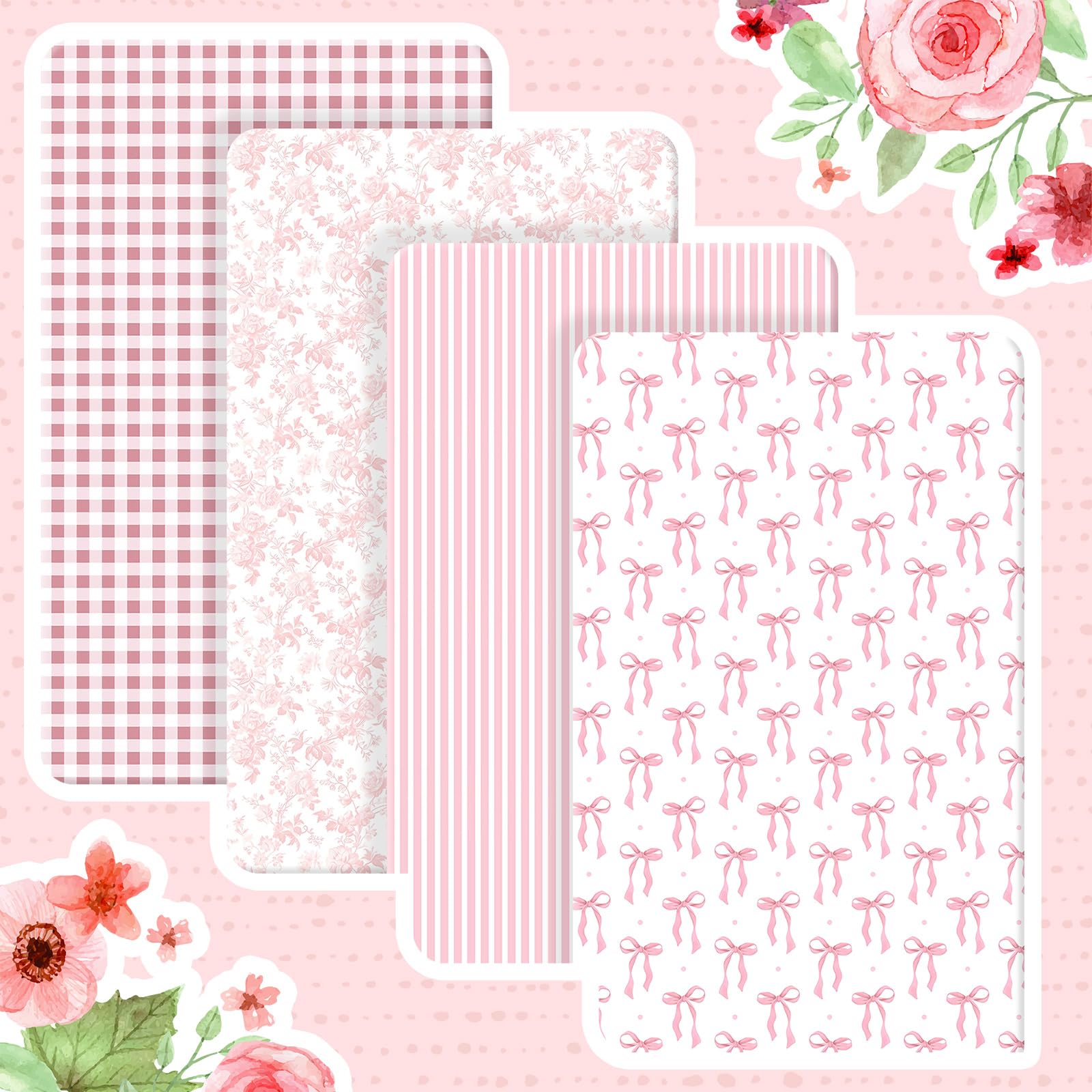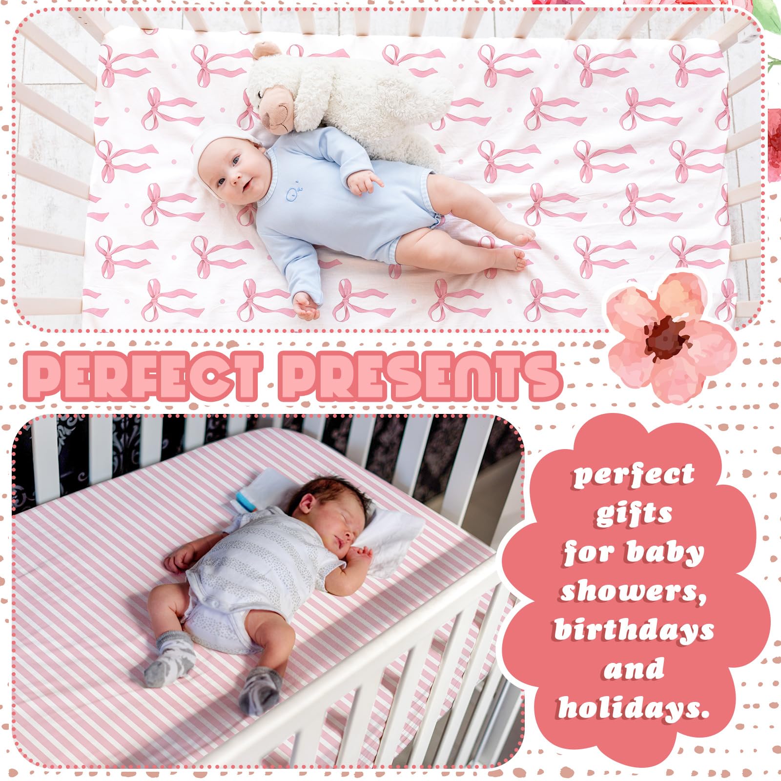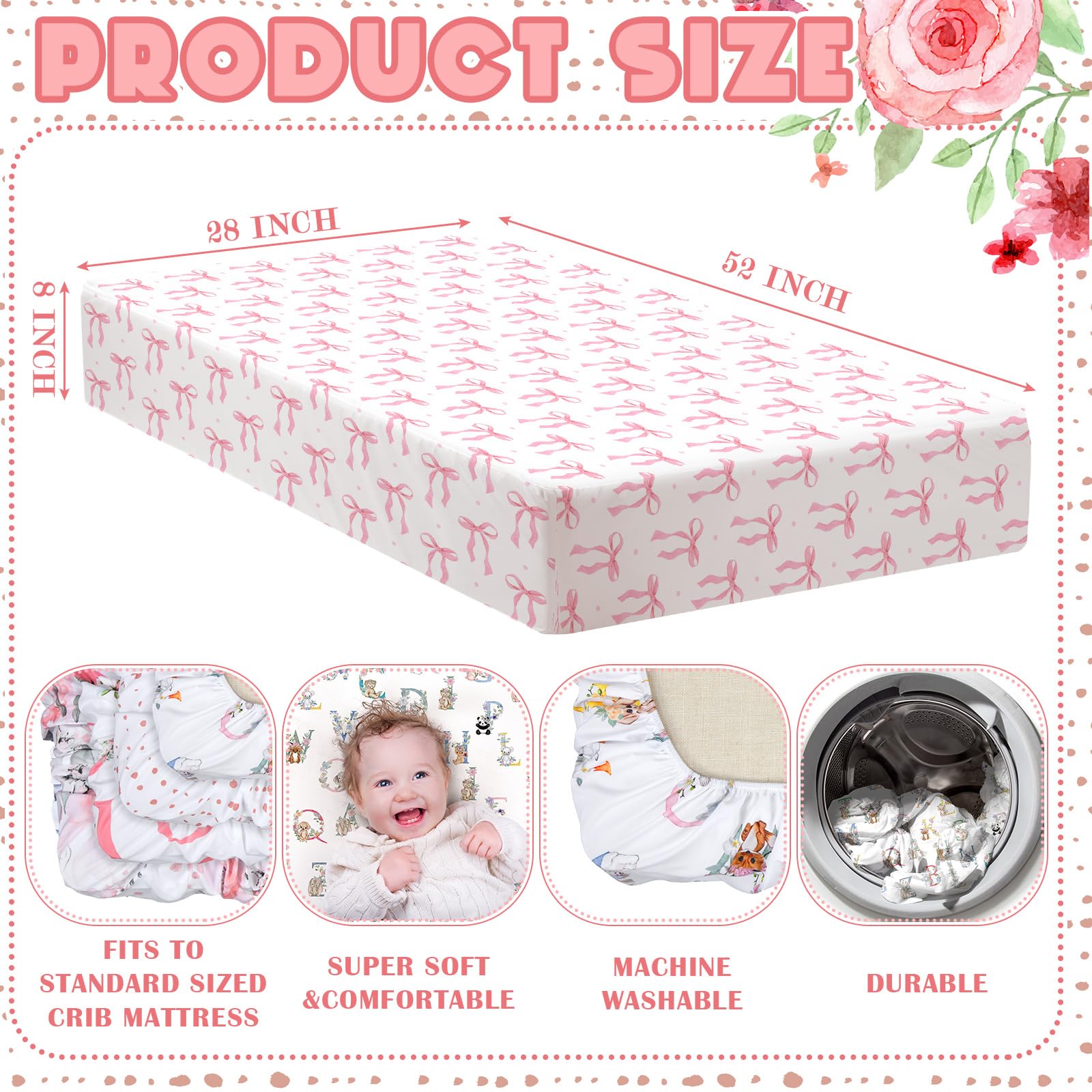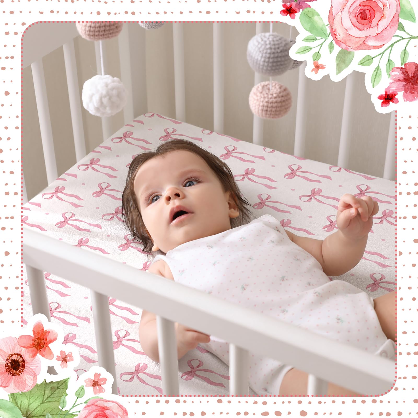 Peryiter 4 Pack Crib Sheets Girl Soft Baby Bed Sheet Set 52'' x 28" Nursery Crib Sheets for Standard Bed for Nursery Decor Baby Boys or Girls(Pink,Coquette Bow)