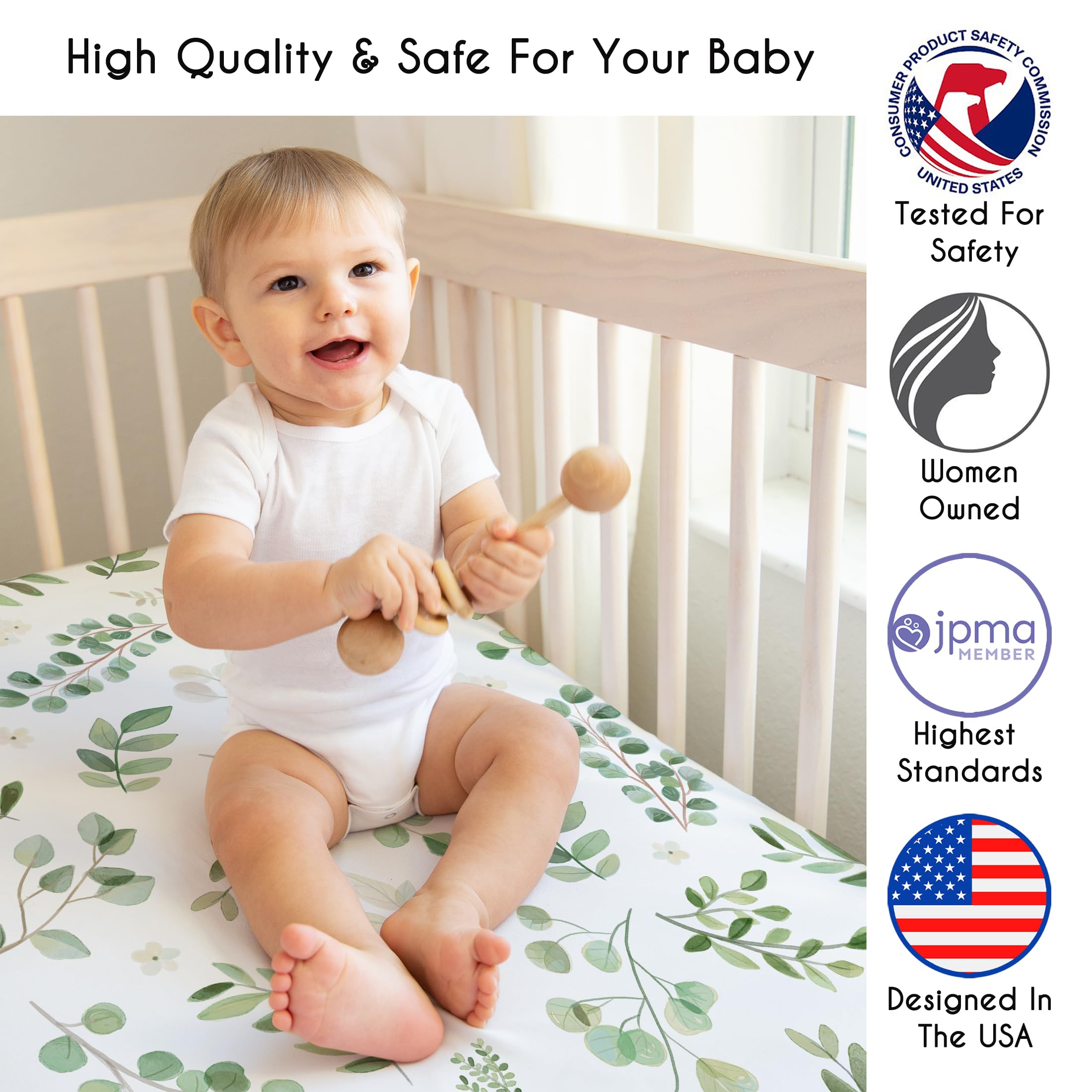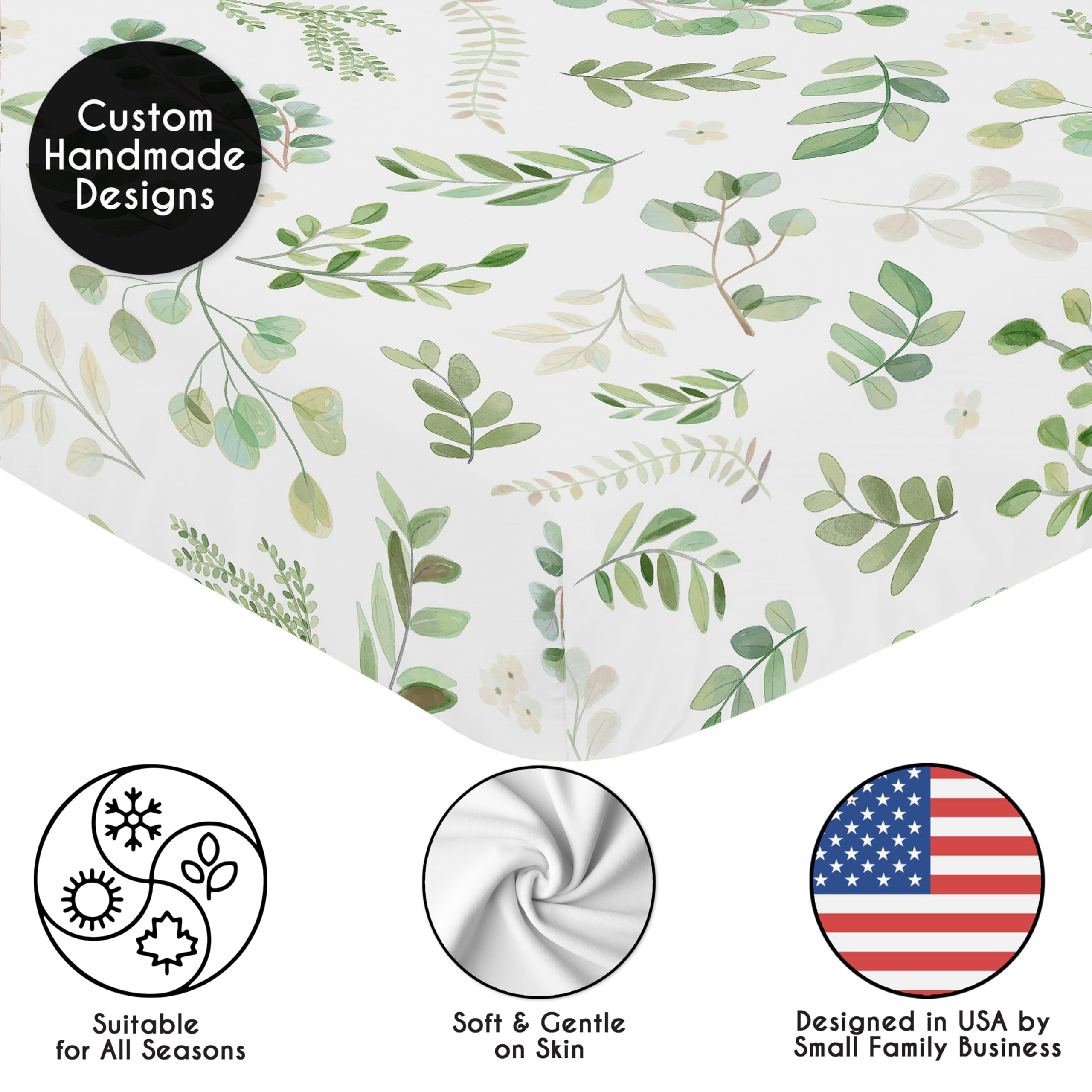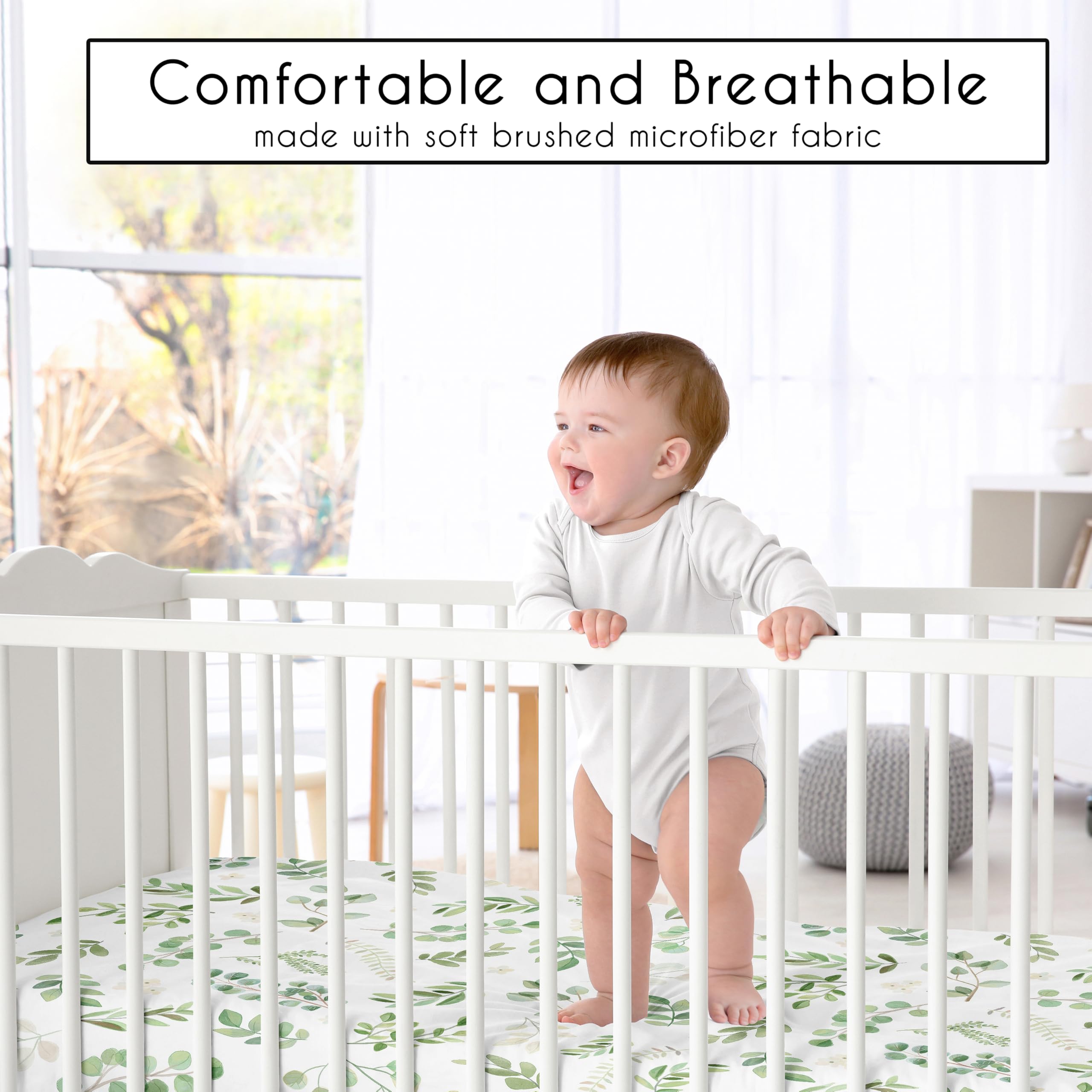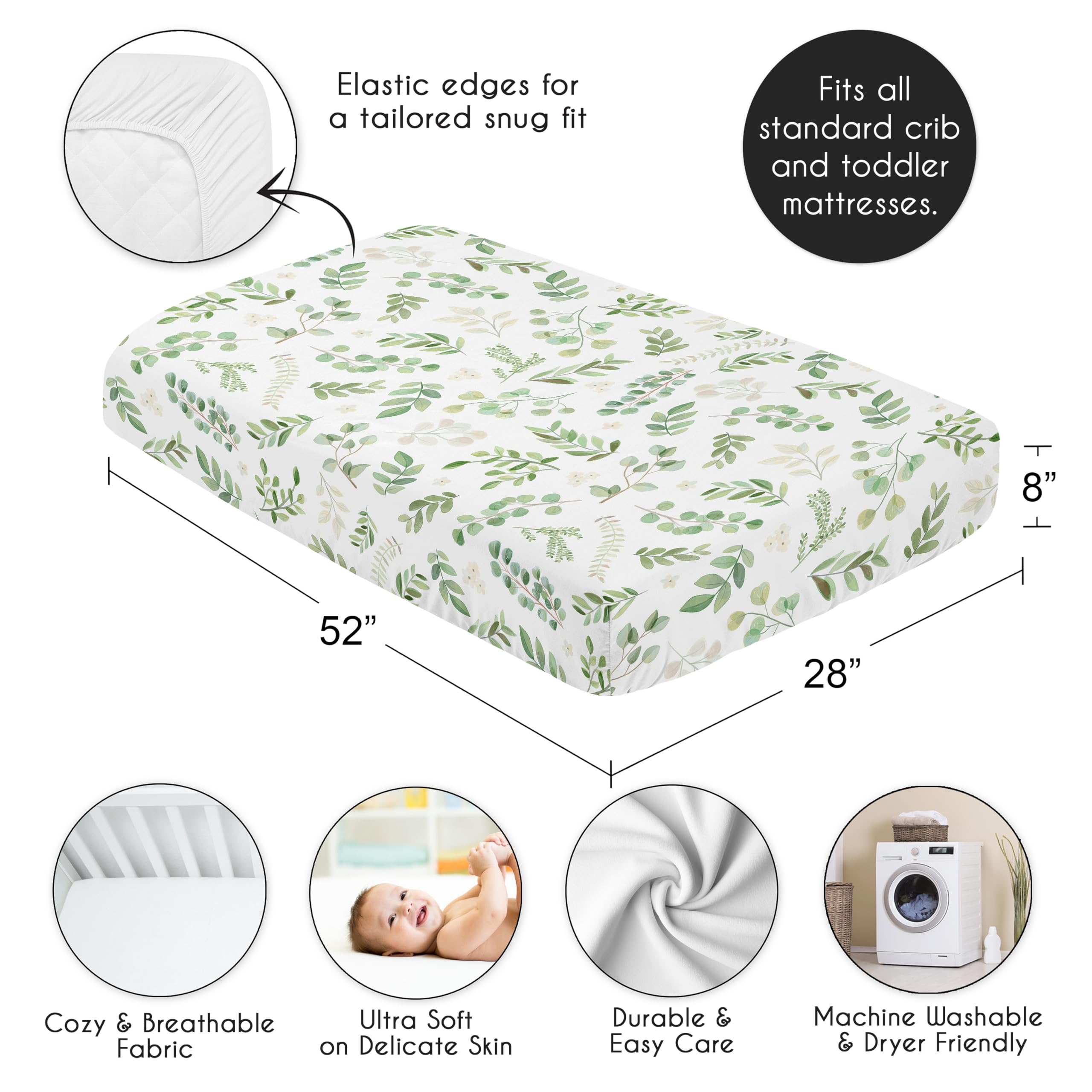 SNUG FIT: Includes (1) Fitted Crib Sheet 52in. x 28in. x 8in. Our newborn standard crib sheets fit snugly, with premium elastic sewn around the entire bottom edge for a secure fit on most standard sized cribs and toddler beds, to reduce shifting & bunching. This brushed microfiber crib sheet features a design of a gender neutral watercolor, sage green and white woodland, botanical, tropical, bohemian, garden leaf floral print & is gentle on delicate skin to foster a soothing sleep environment.