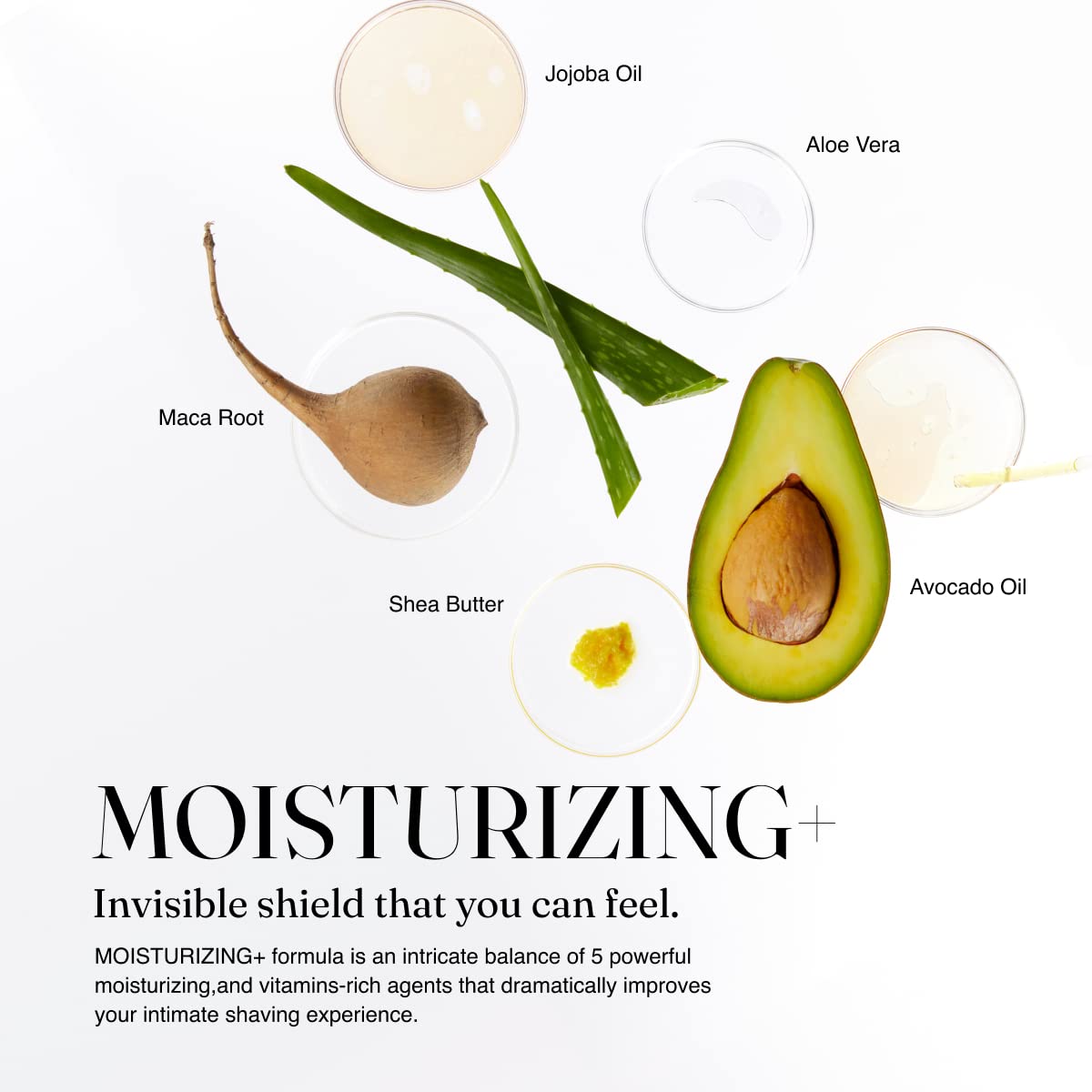 MOISTURIZING+ FORMUA - Formulated with 5 powerful moisturizing, and vitamins-rich agents that dramatically improves your intimate shaving experience; Jojoba Oil / Avocado Oil / Aloe Vera / Shea Butter / Maca Root.