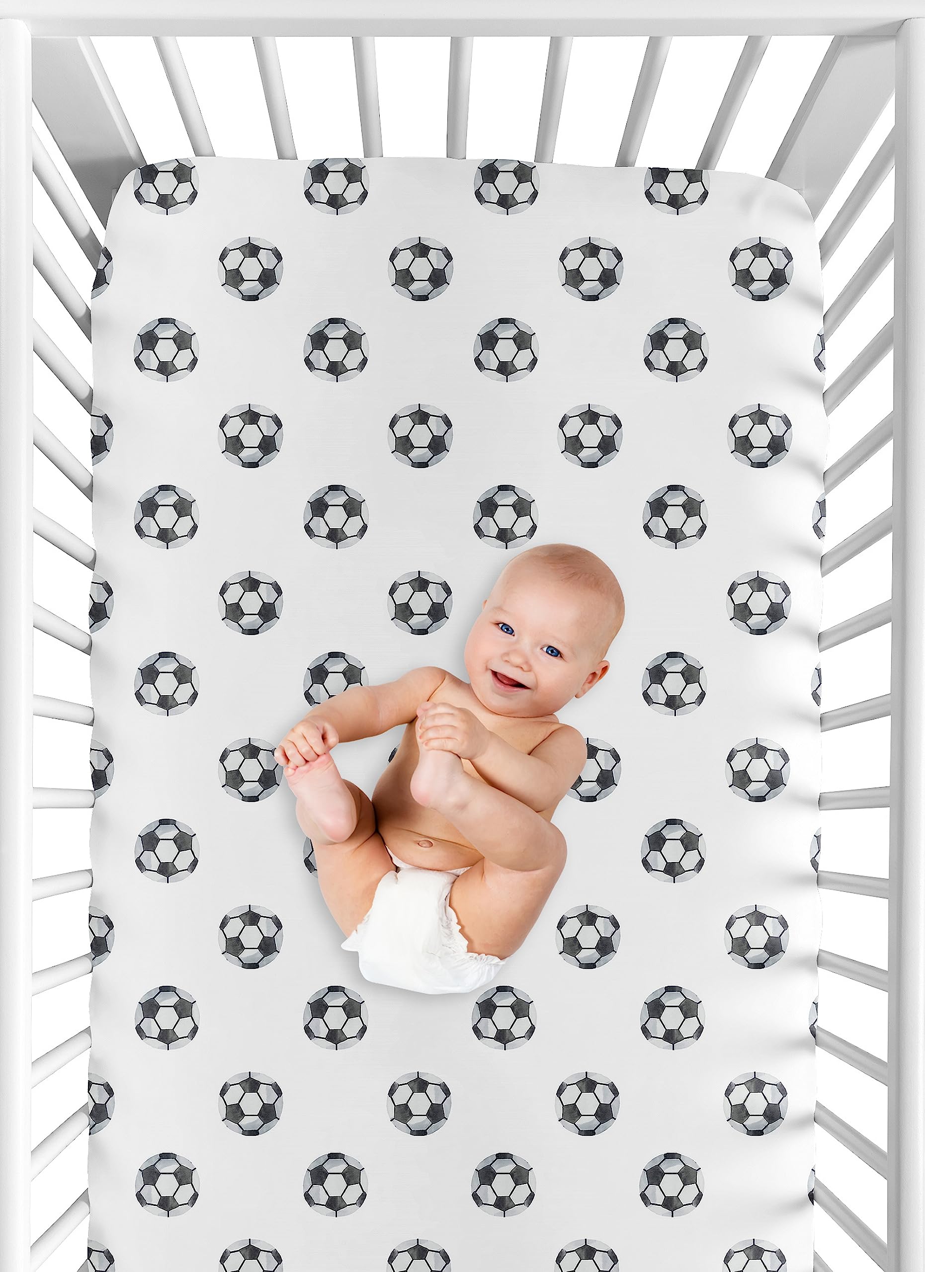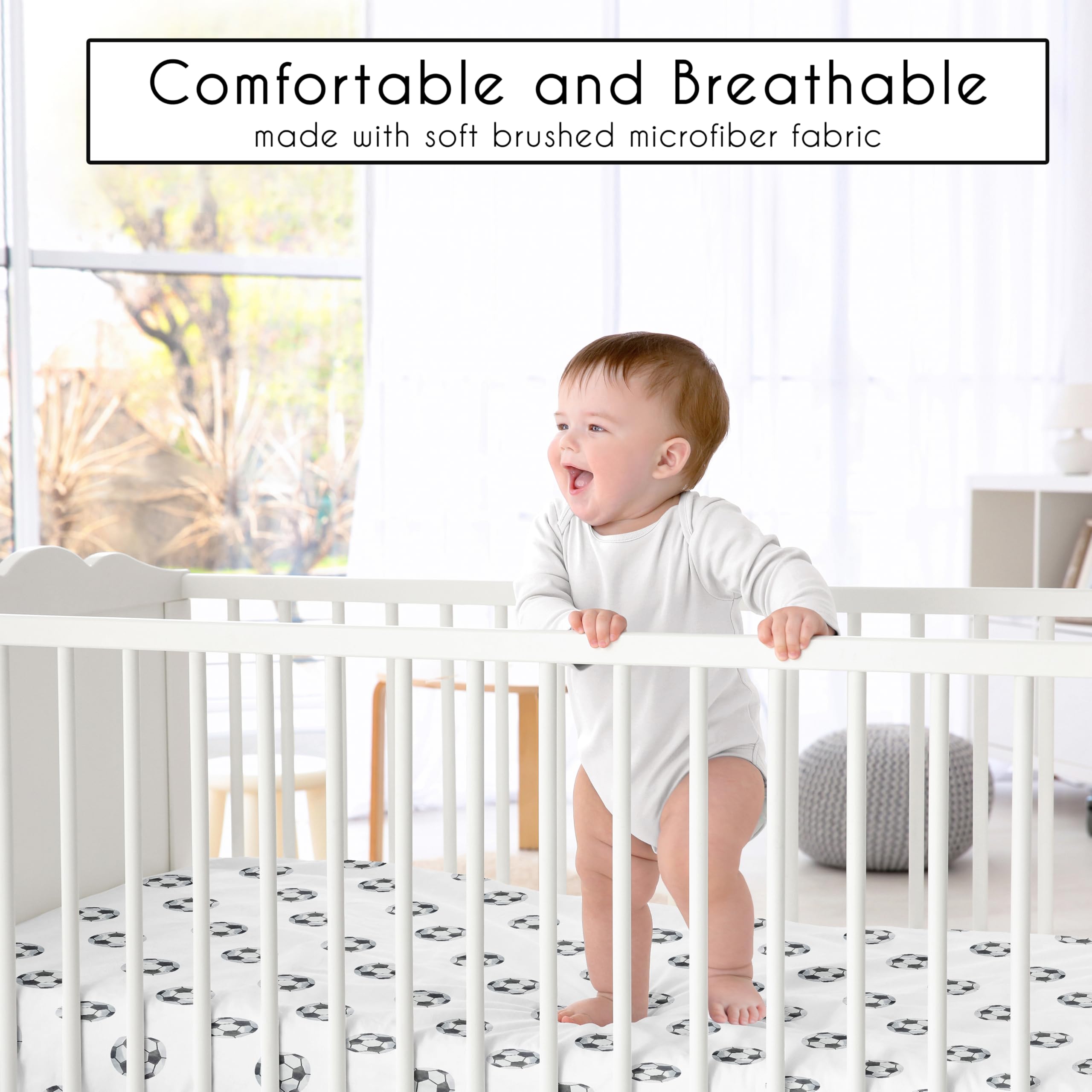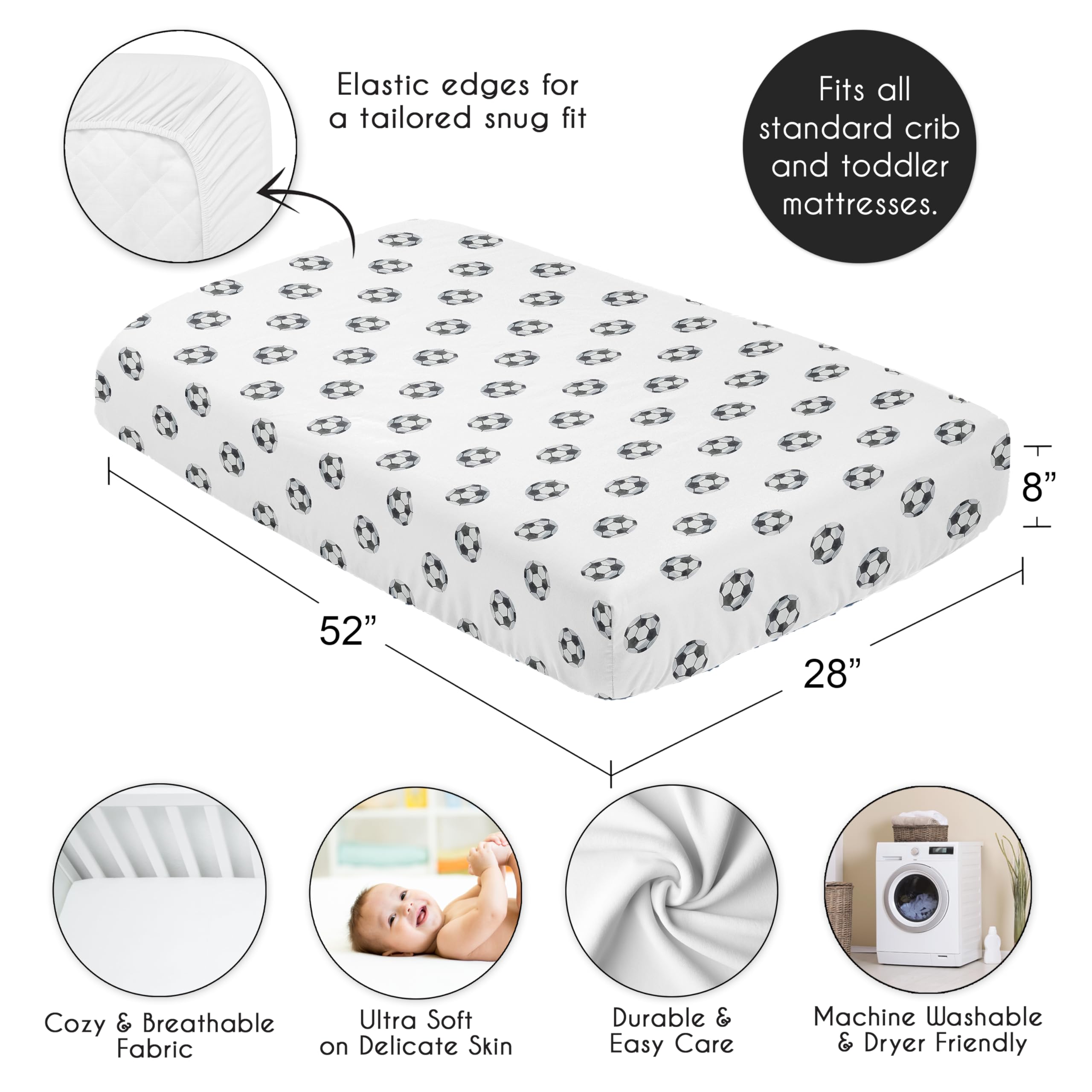 SNUG FIT: Includes (1) Fitted Crib Sheet 52in. x 28in. x 8in. Our newborn standard crib sheets fit snugly, with premium elastic sewn around the entire bottom edge for a secure fit on most standard sized cribs & toddler beds, to reduce shifting & bunching. This brushed microfiber crib sheet features an exclusive design of a black and white soccer balls print for the watercolor stars, sport themed Vintage Sports Theme Collection & is gentle on delicate skin to foster a soothing sleep environment.