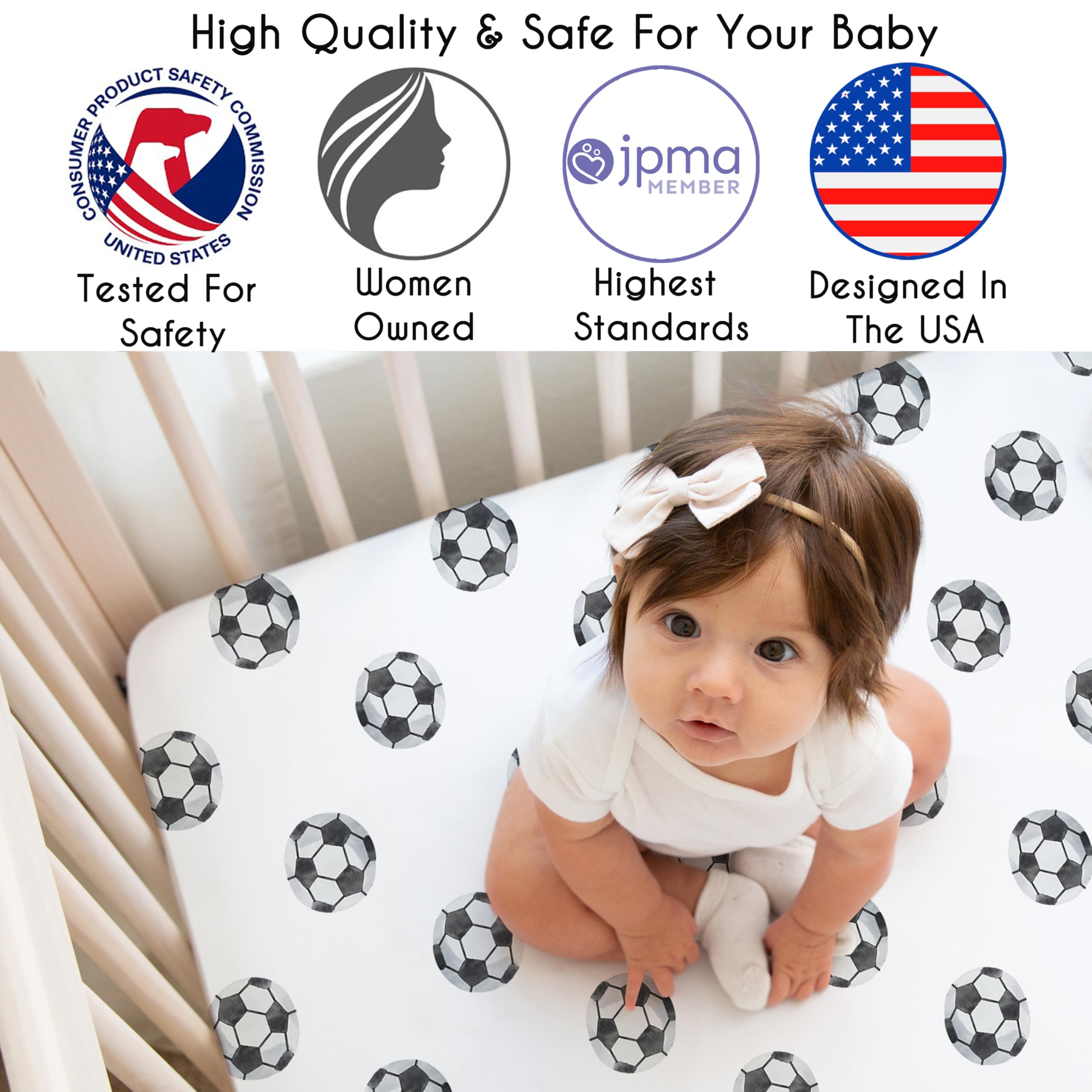DESIGNED IN THE USA: By real parents who understand the need for comfort, practicality, and style. Sweet Jojo Designs is a small, women owned business. The mom's on our team know a crib mattress sheet is first priority for your baby essentials to ensure a restful night of sleep. We use top fabrics and designs to create soft crib sheets that are stretchy & comfortable for your infant or toddler. We've studied the latest trends in soccer crib sheets for baby boy to bring you the finest product.