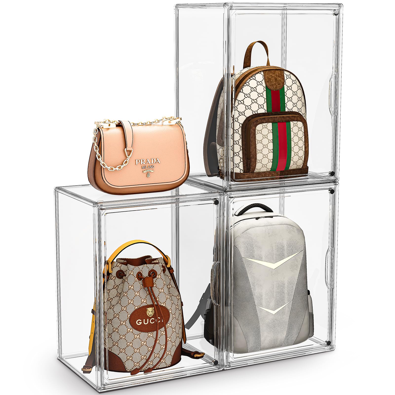 HIGH TRANSPARENCY & MAGNETIC DOOR DESIGN - The handbag storage organizer provided 360 clear view of your favorite bags, all-round perspective display. With magnetic door, easy to open and close the purse containers, find the right shoes in seconds without opening all box, save your time, stylish and elegant.