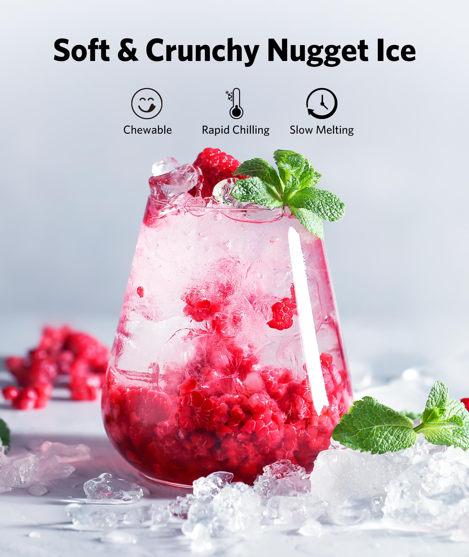 Crunchy Chewable Nugget Ice: With the nugget countertop ice maker, you can make ice as delicious as crushing ice at home and enjoy it anytime, anywhere! Enjoy your summer drink faster and with less melting with ice makers countertop nugget ice cubes. Unlike bullet ice and square cubes, nugget ice melts slowly and cools drinks quickly, preserving the original flavor of cocktails and other beverages