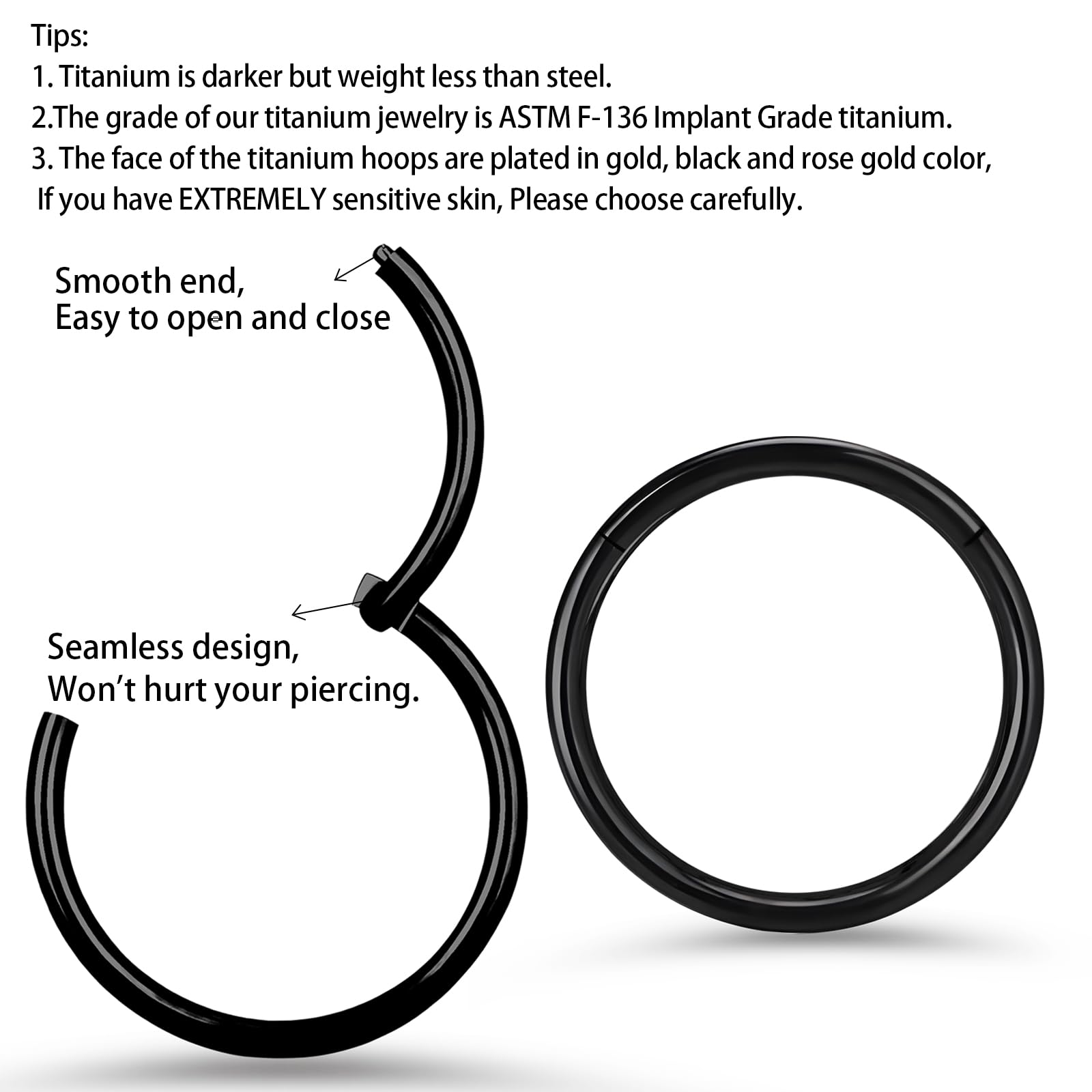 Hypoallergenic Titanium Nose Rings Hoops: Made of Premium ASTM F-136 Implant Grade titanium, lead and nickel free. Titanium nose hoops is more suitable material for very sensitive skin people than 316L surgical steel nose ring, more safe and healthy. What's more, the weight of titanium nose rings are 50% less than stainless steel, more comfortable to wear everyday.