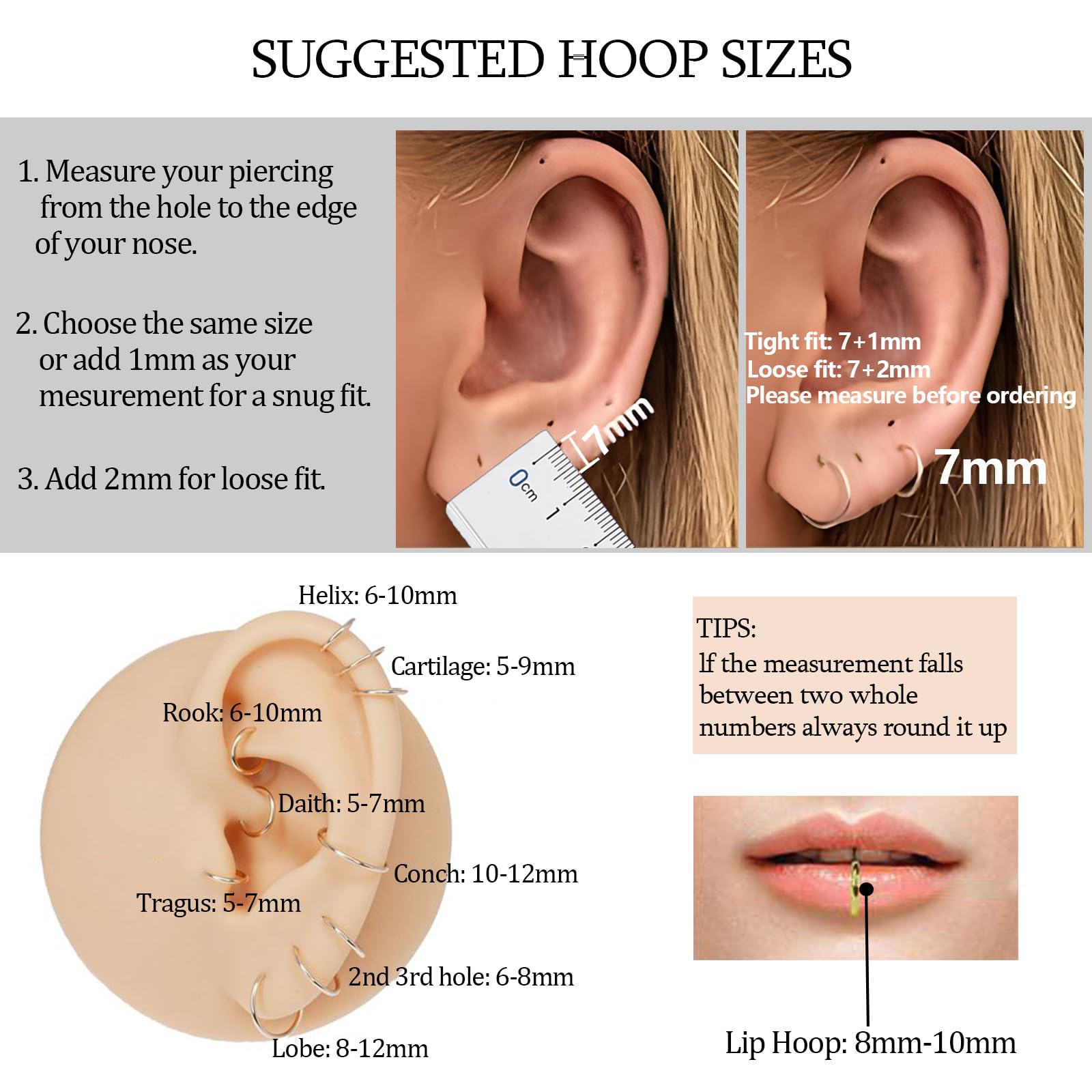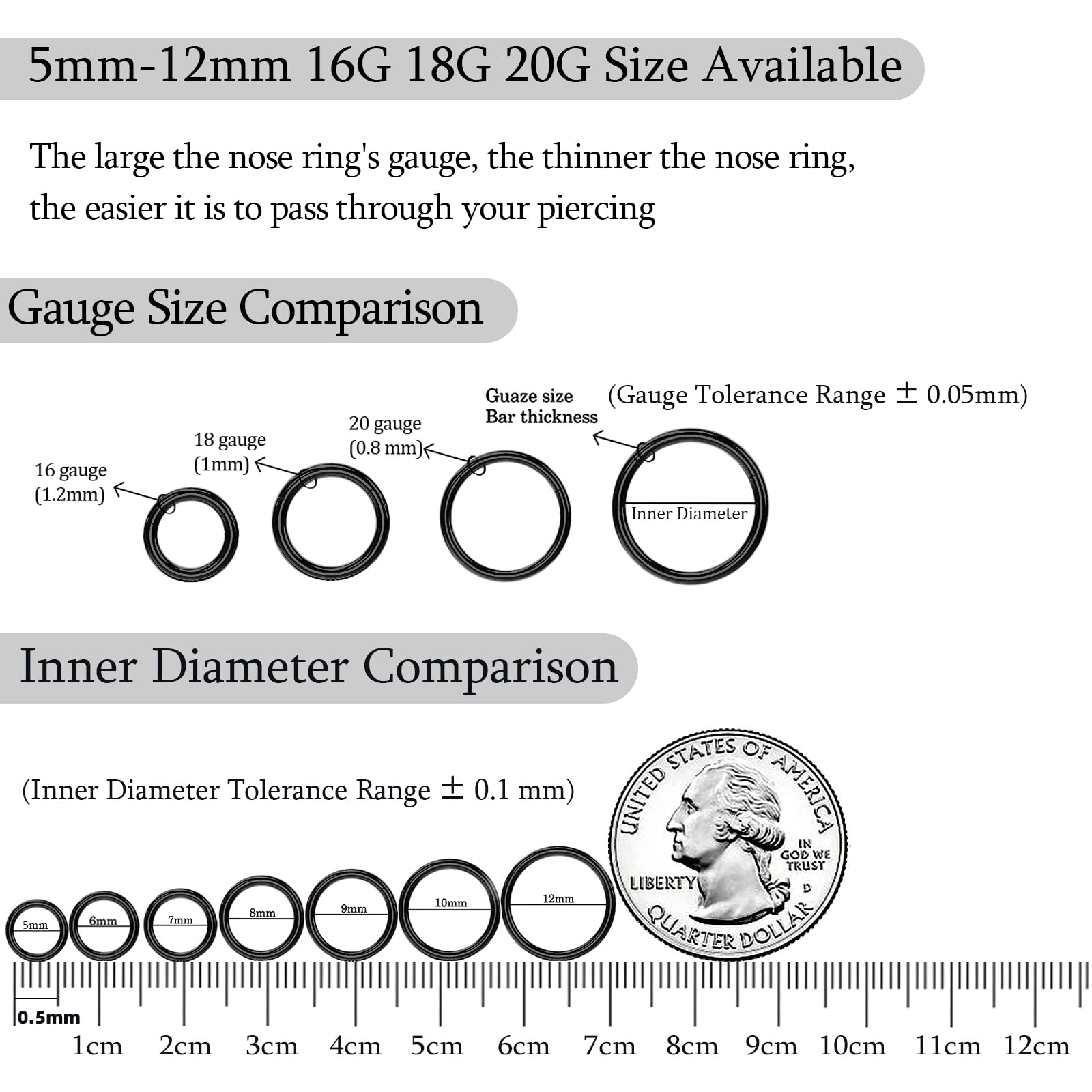 2Pcs 10mm Nose Ring Hoop:g (Theg is the size of the piercing hole): 20G=0.8mm thickness. Inner Diameter: 25/64" (10mm). Please choose yourg and diameter hoop for your nose piercing or ear piercing needs.