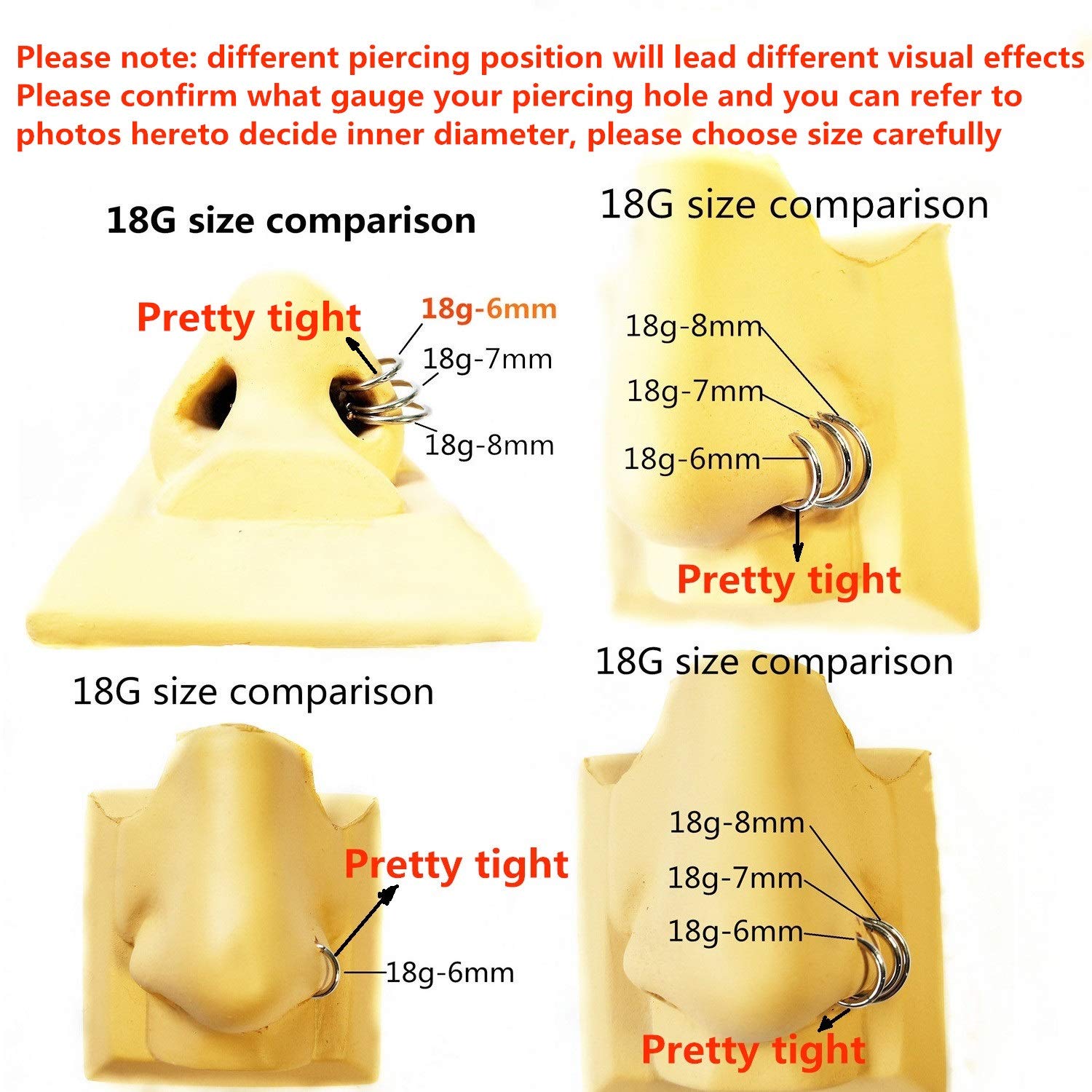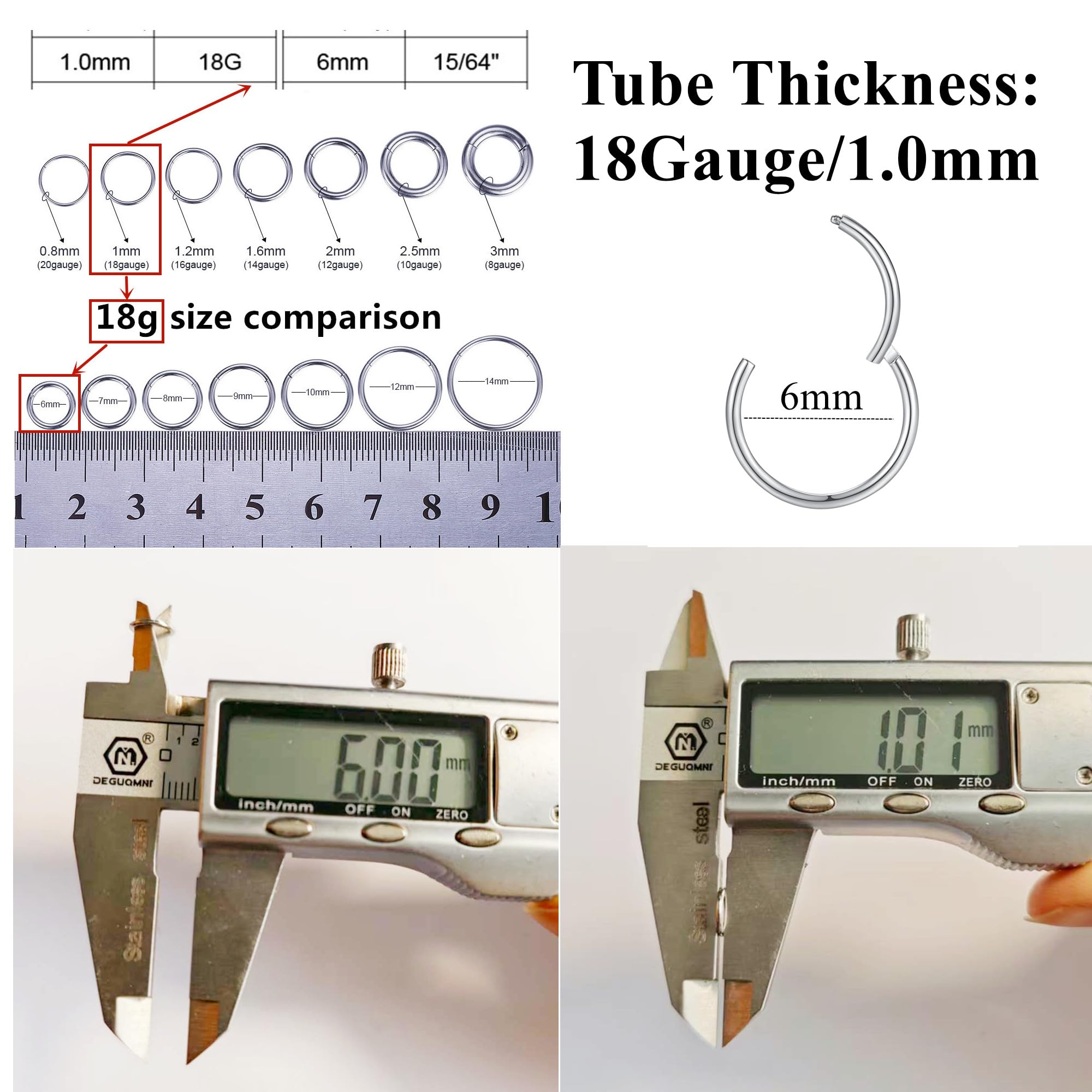 Sold individually Nose Hoop Ring/Earring Hoop Size: 18 gauge (thickness: 1.0mm), inner diameter 15/64 inches(6mm ),Please note: 6mm is VERY SMALL!!! VERY TINY!!! Please choose your gauge and diameter hoop for your nose piercing needs.It has a smooth closure that doesn't slipped or opened. It's still tight after long-term use.