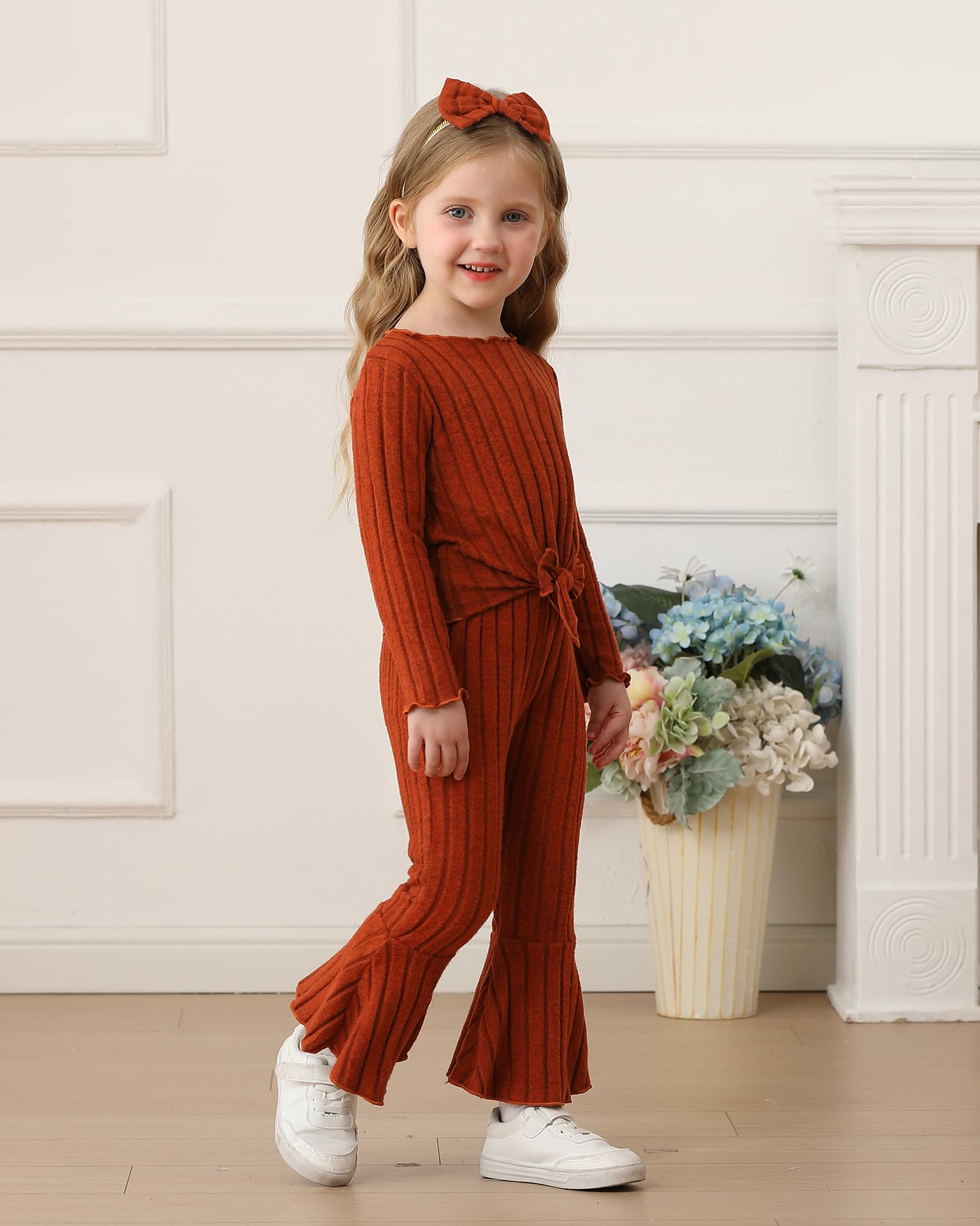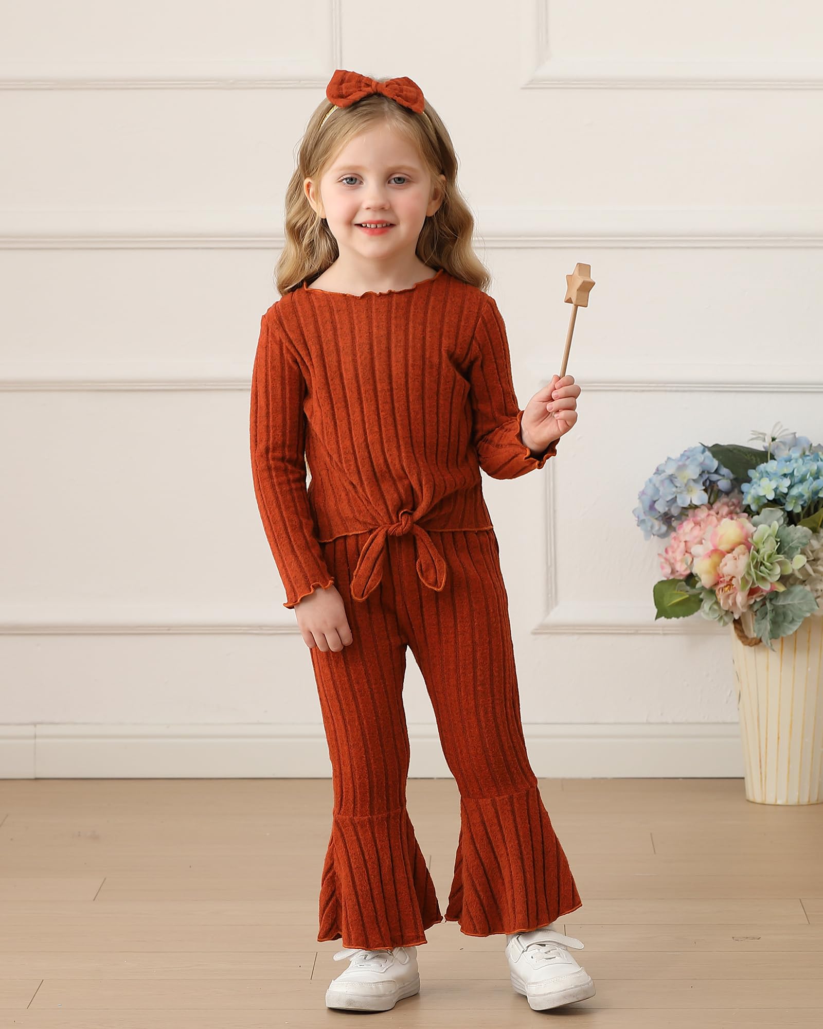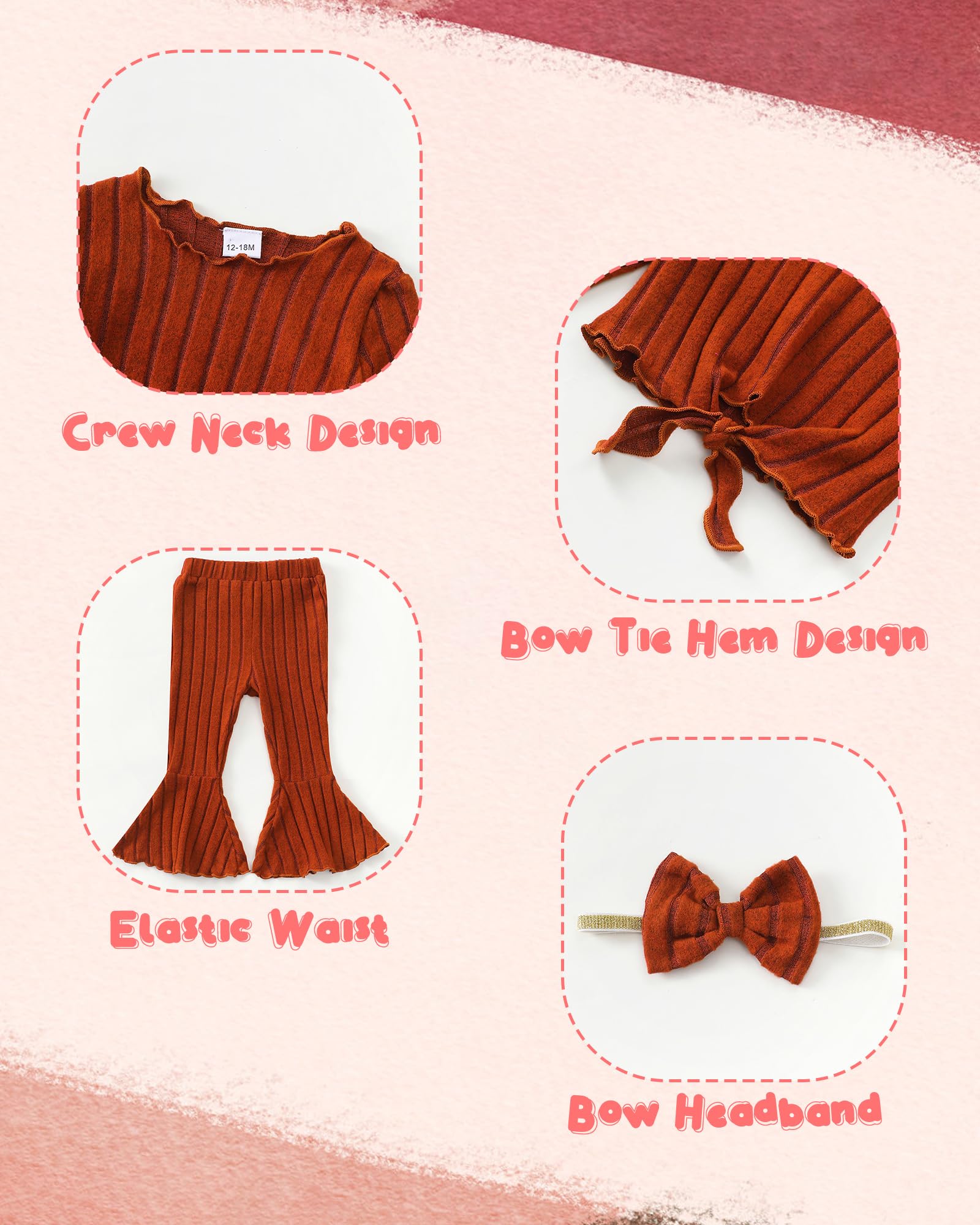 Design: The cute baby girl clothes includes a ruffle solid color long sleeve shirt with bell bottom pants and an adorable bow tie headband. The solid color and pull on closure make it simple yet stylish, perfect for spring, fall, and winter wear.