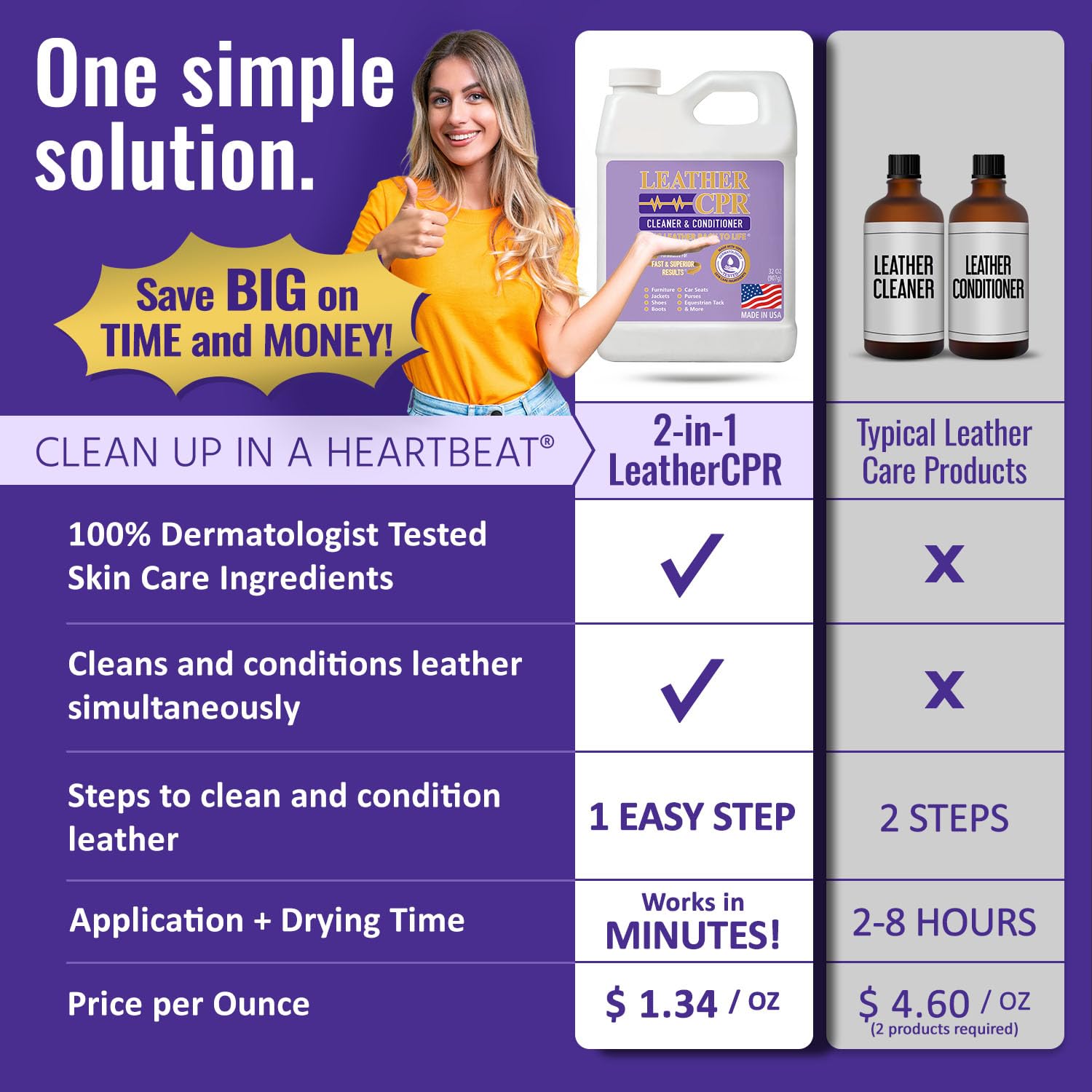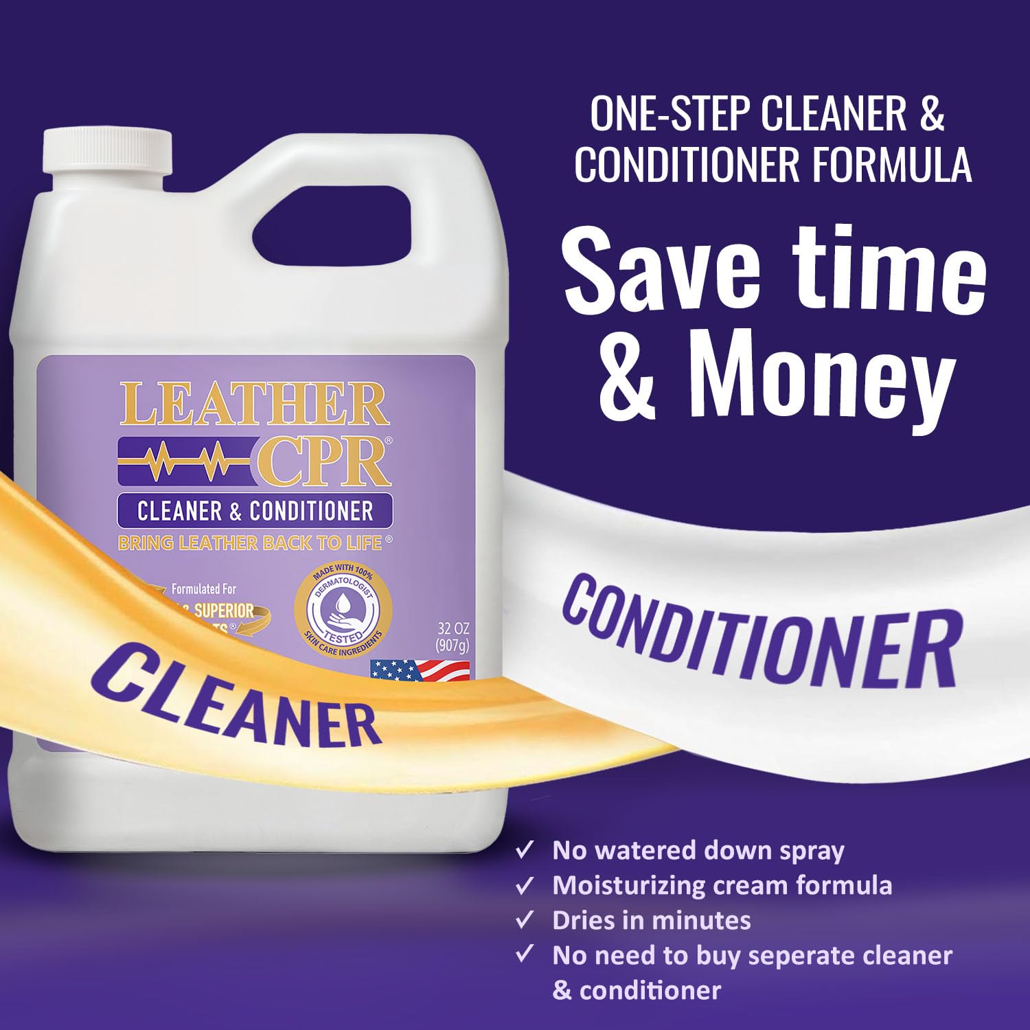 Fast & Simple One-Step Process: Leather CPR Cleaner and Conditioner makes cleaning fast and easy. Our leather care products cleans and conditions in one easy step to keep your leather products soft and supple for years of enjoyment. No more long process of soaking your leather with a watery spray. Eliminate your waiting time with our leather cream; also good as a car leather cleaner and conditioner, boot cleaning kit, leather restorer for couches, & leather purse conditioner for designer bags.