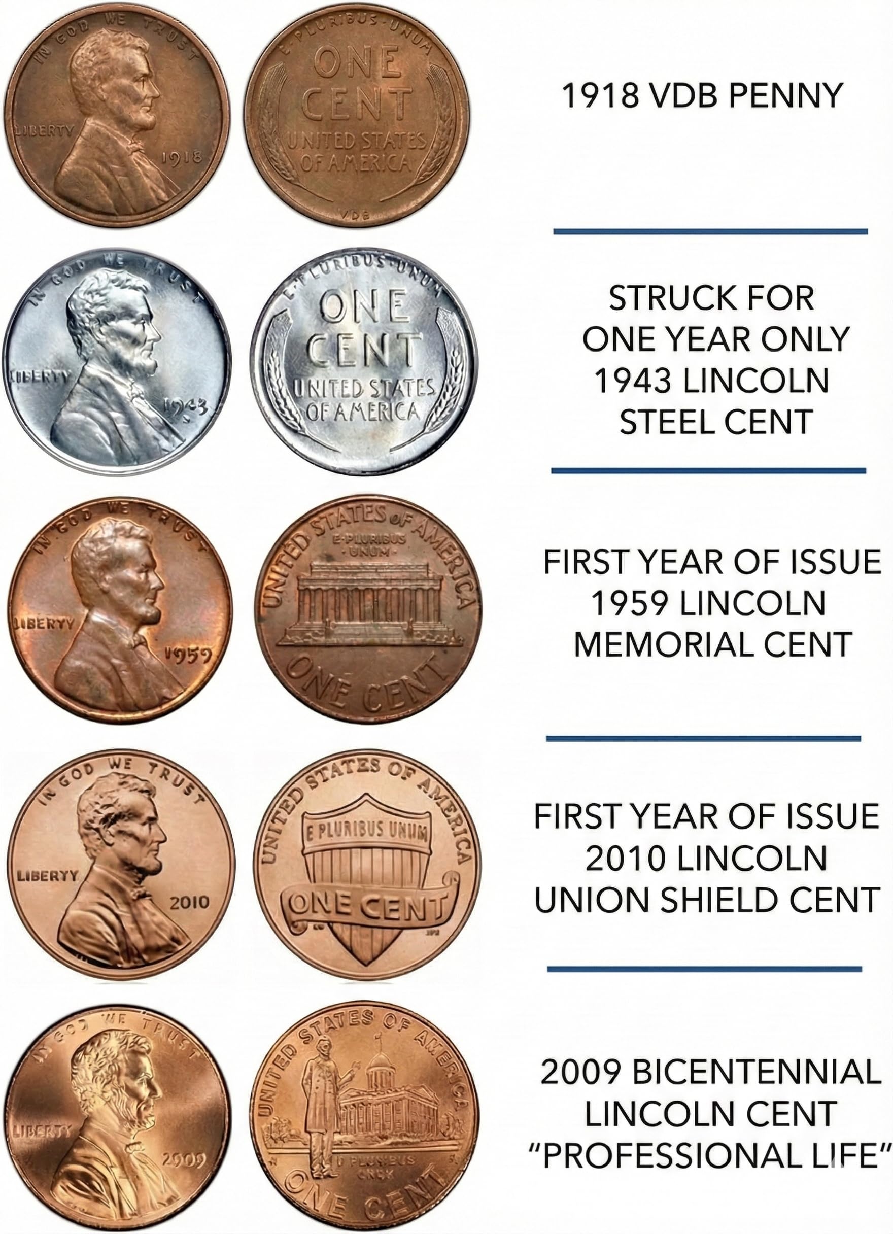 Complete Design Timeline – Includes: 1910-1917 Wheat (VDB removed), 1918 VDB, 1943 Steel, 1958 Last Wheat, 1959 First Memorial, 1982 Last Copper, 1982 Zinc, all four 2009 Bicentennials (Kentucky, Indiana, Illinois, Washington), and 2010 Shield.