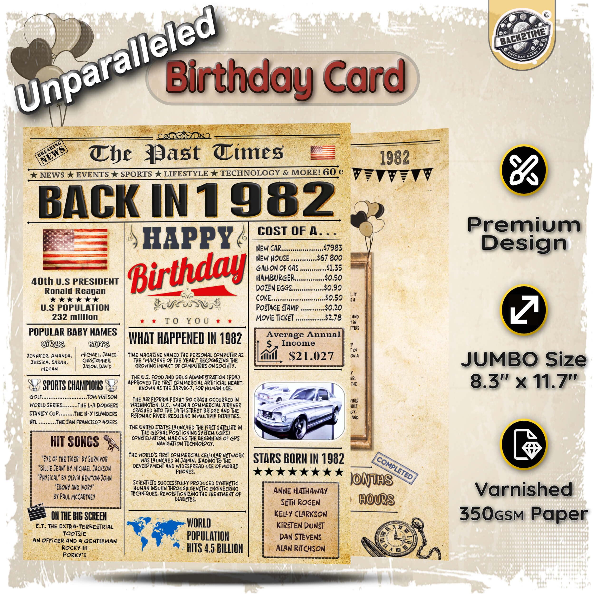 ๐ FUNNY BIRTHDAY CARD + EXCLUSIVE ENVELOPE ๐ Enjoy a beautifully printed Back in card that's entertaining to read, featuring a special bonus on the back with intriguing stories or lesser-known facts from that year. The interior offers space for personalized messages, designed with an aged appearance and elegant decorations to enhance the vintage feel. The included envelope boasts a unique design ideal for mom and adult born in 1982. Birthday Cards for Women, Birthday Cards for Men.