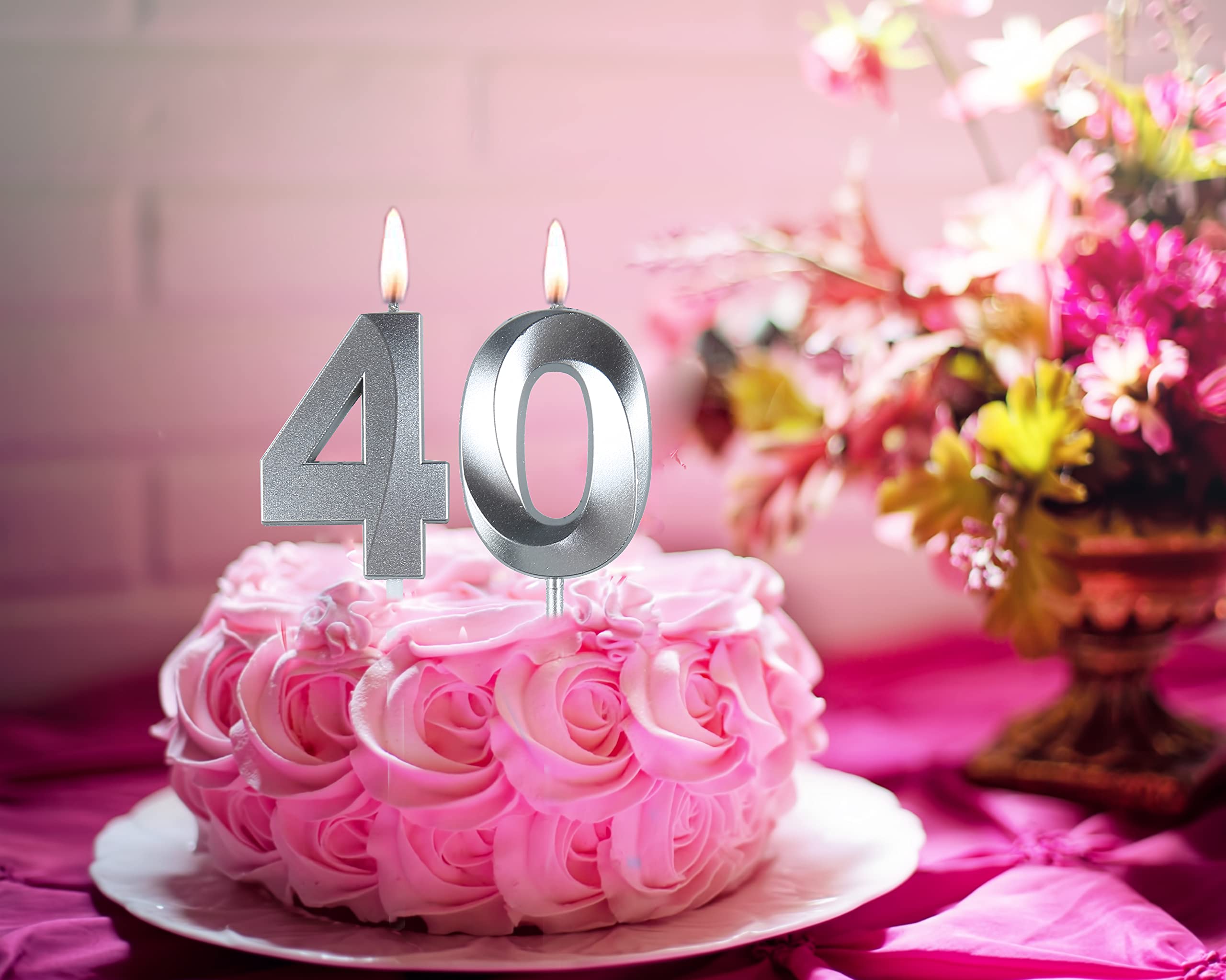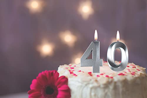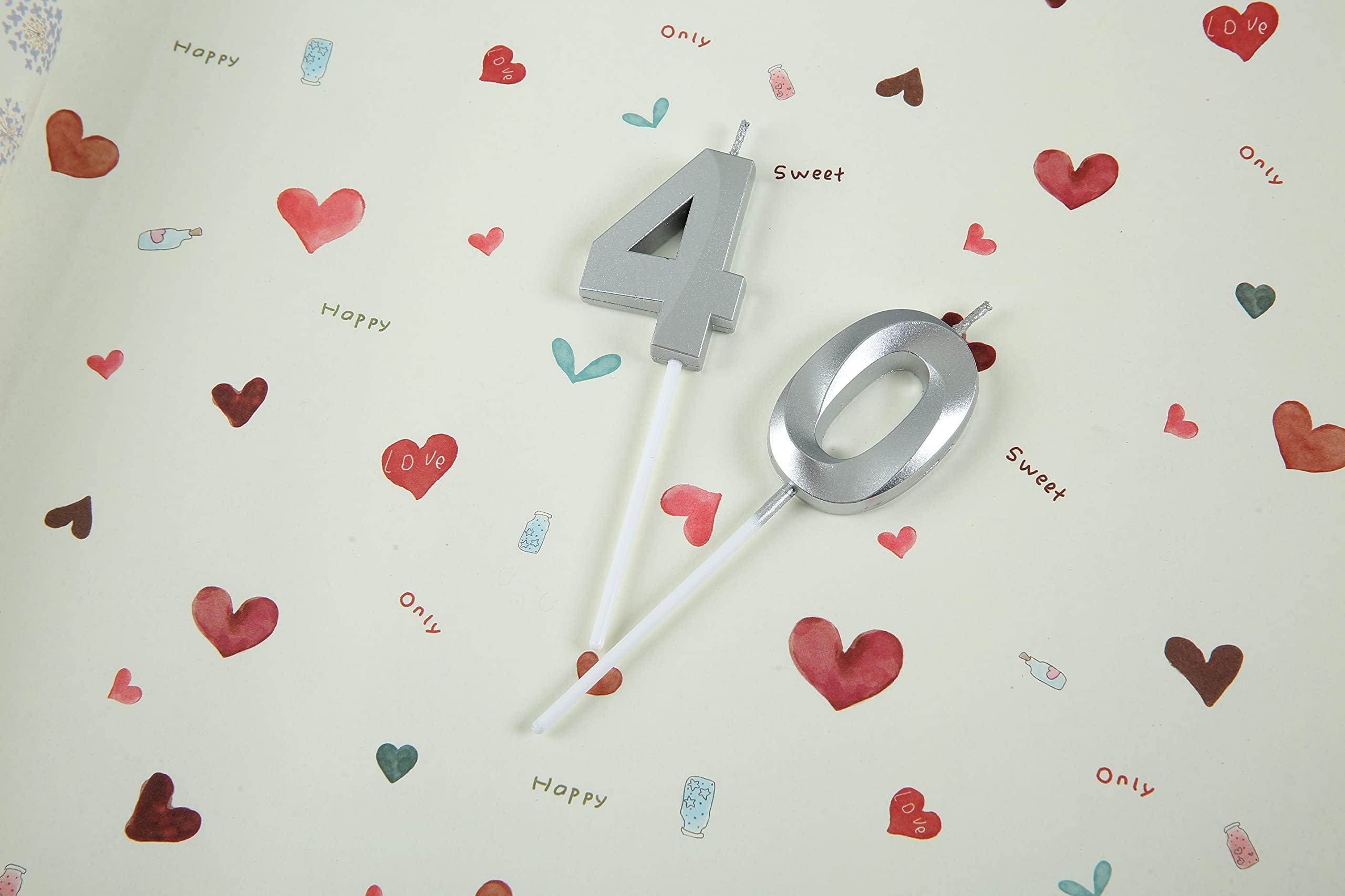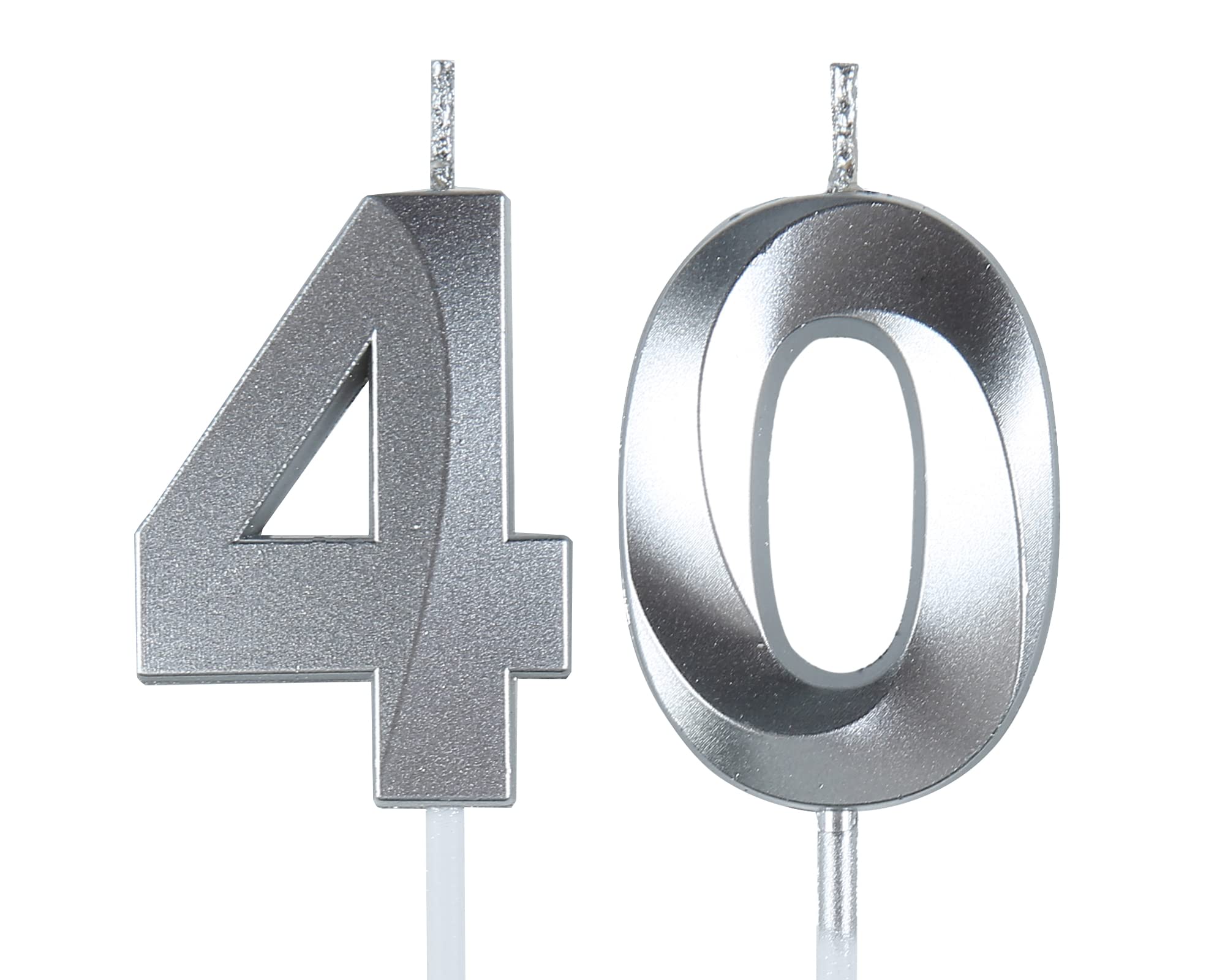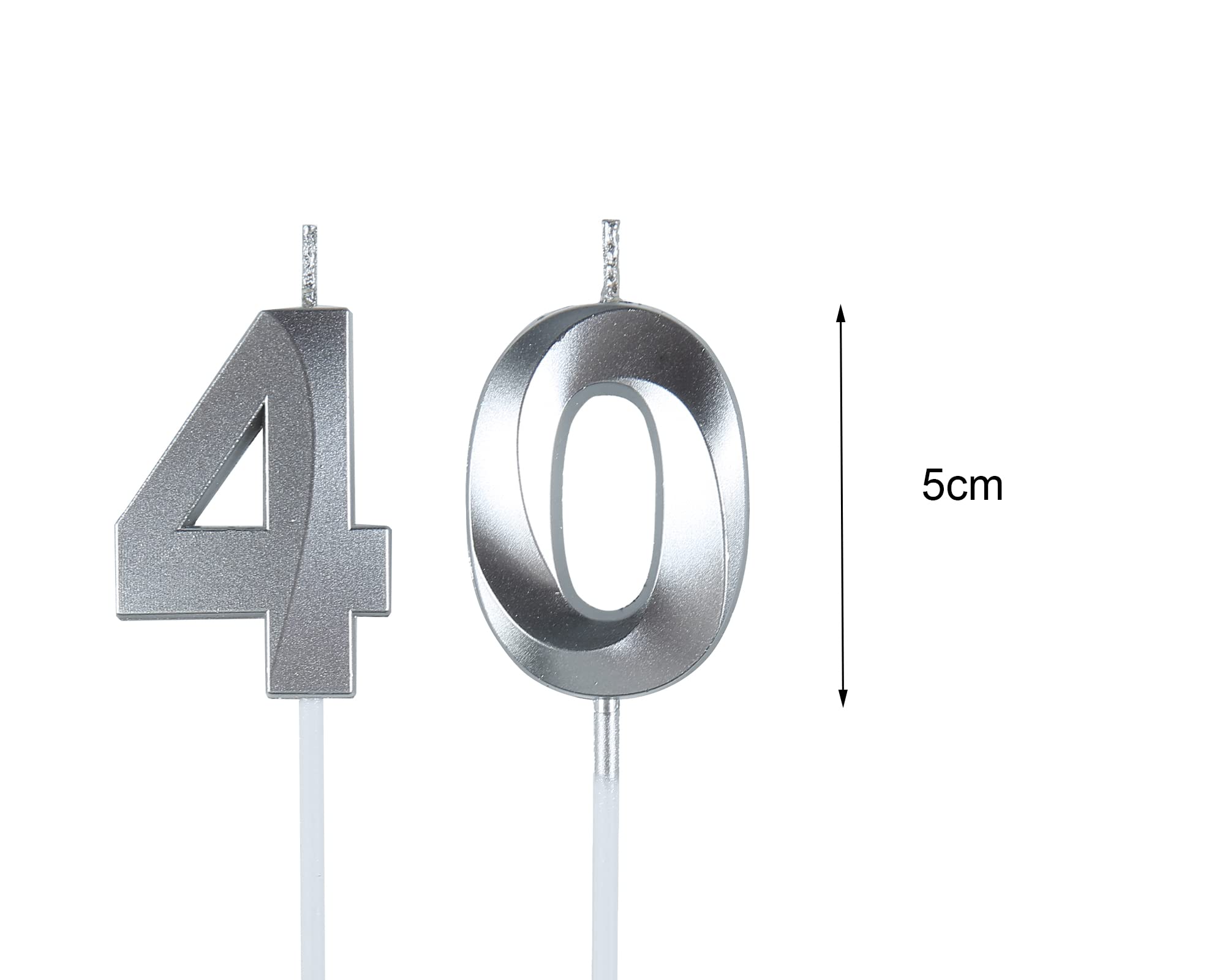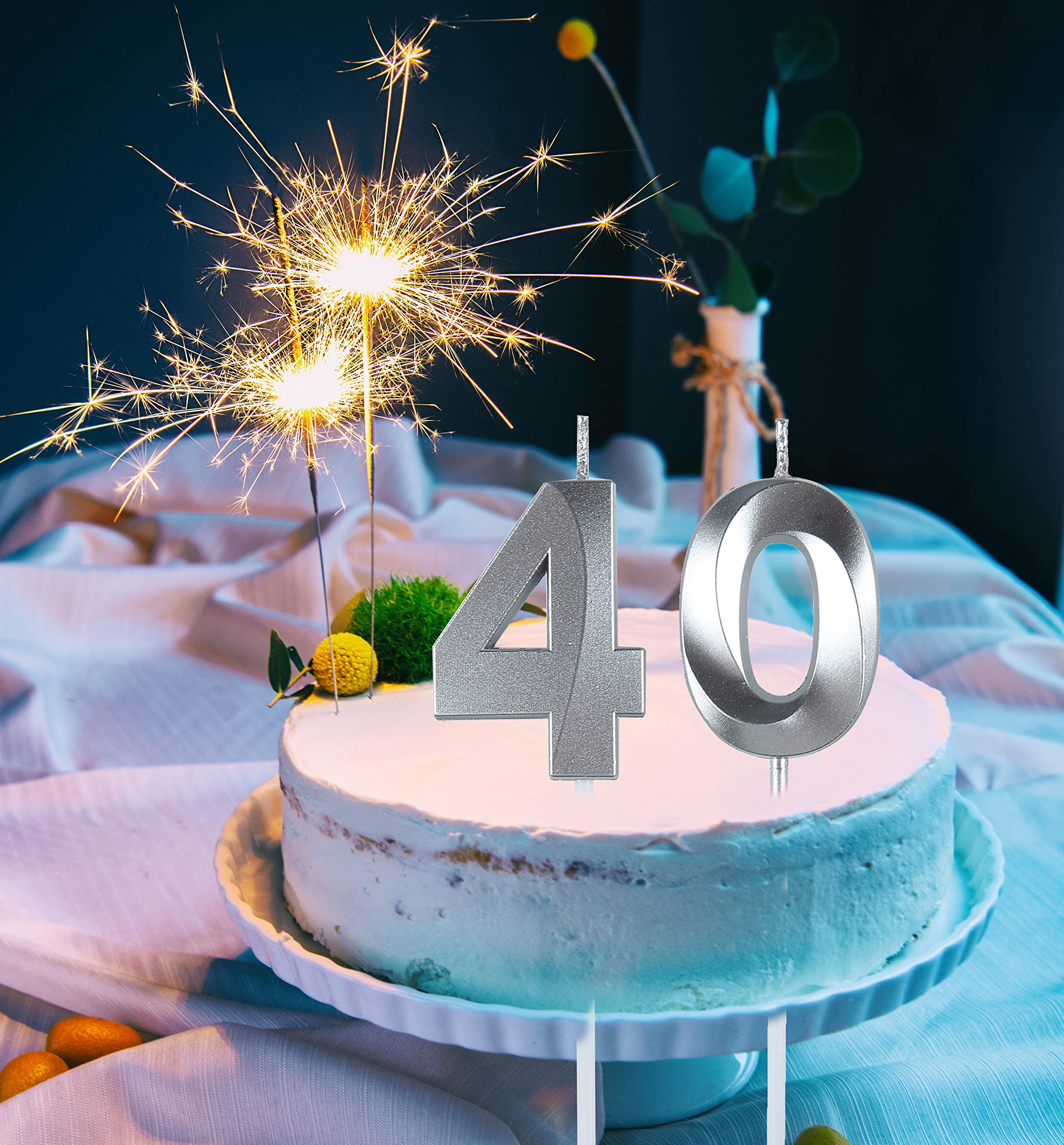 INSTRUCTIONS: Size: Width:1.3 in. Number height: 1.9 in. Total height: 4.8in Color : Glitter Silver Material : quality wax ,smokeless and non-toxic Burning Time :approx 4-5 minutes Package included:2 Pcs ,Silver Number 40 birthday candles PLEASE NOTE: Please keep the candles in shade away from the fire and make sure the size match to your birthday cakes