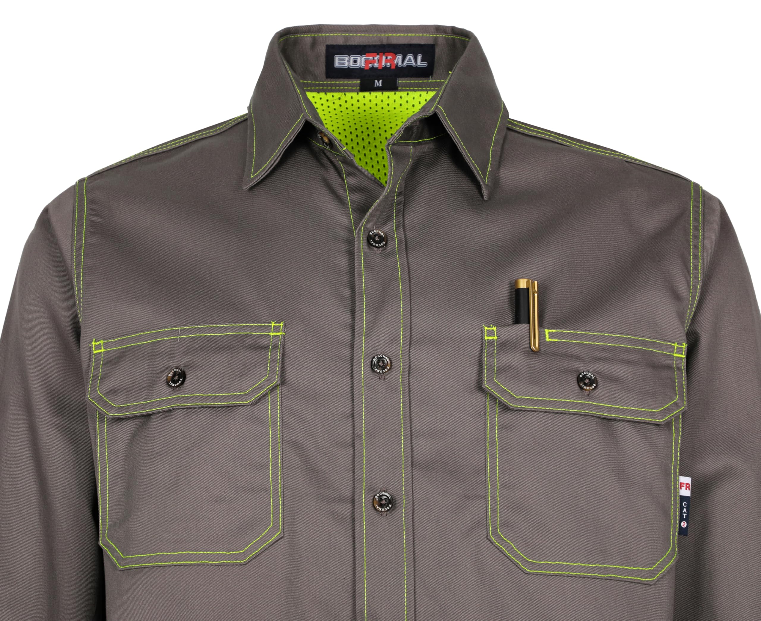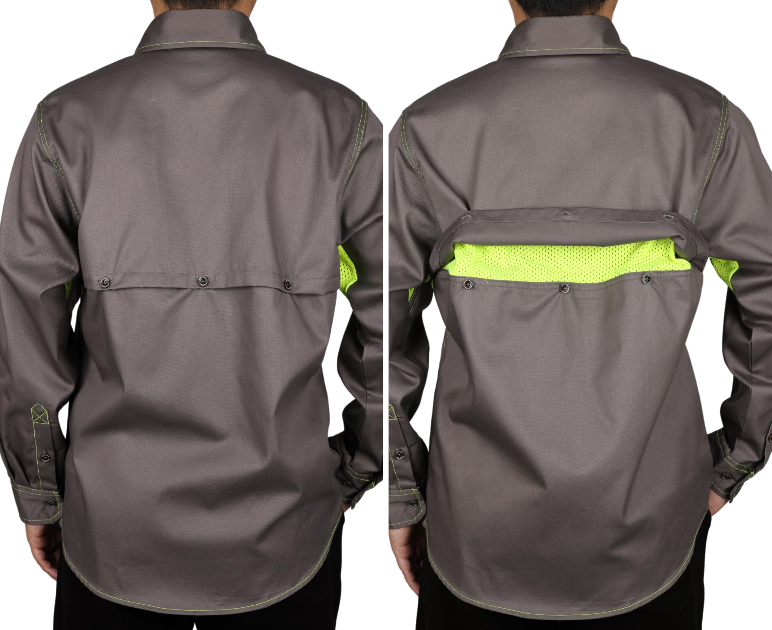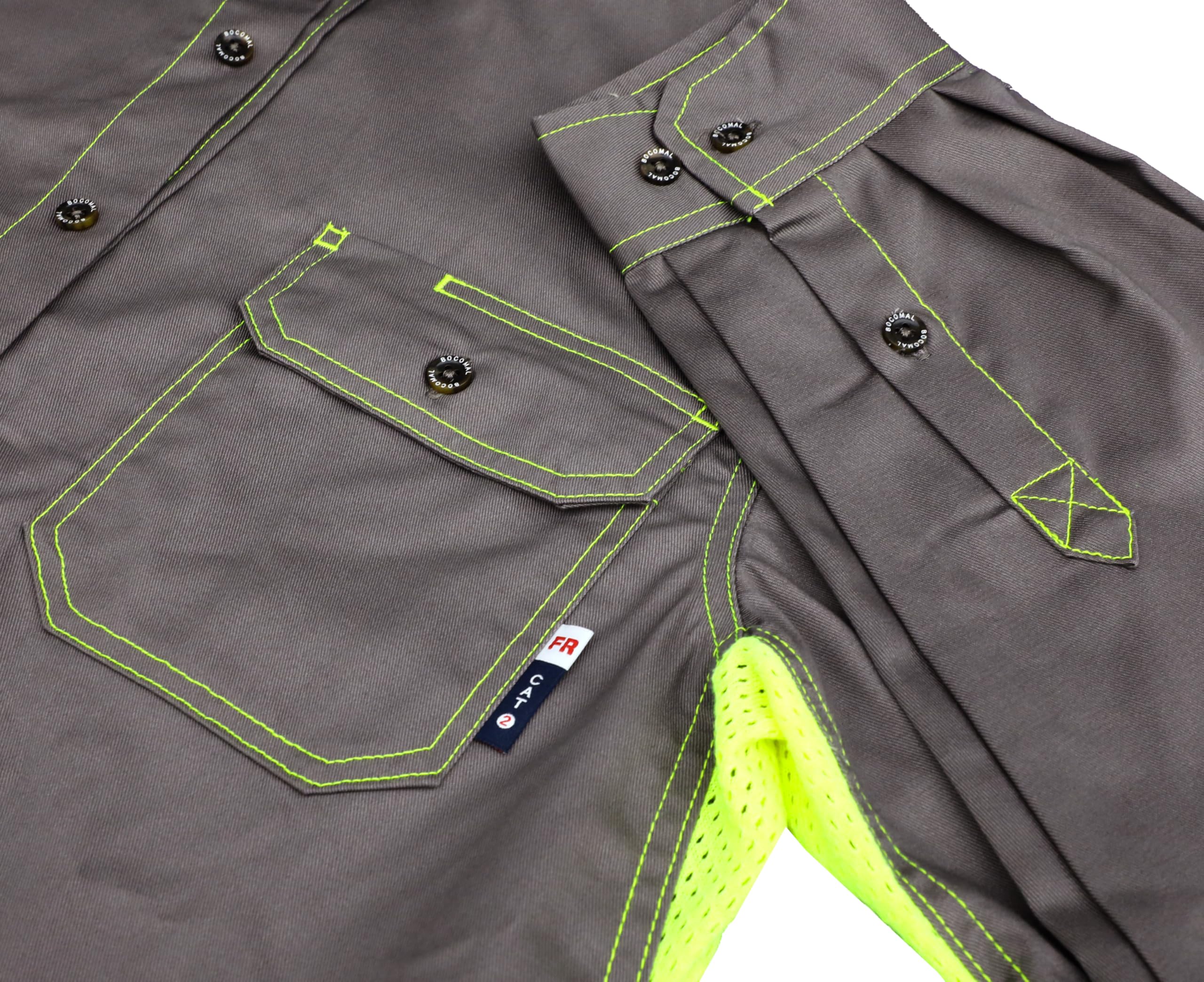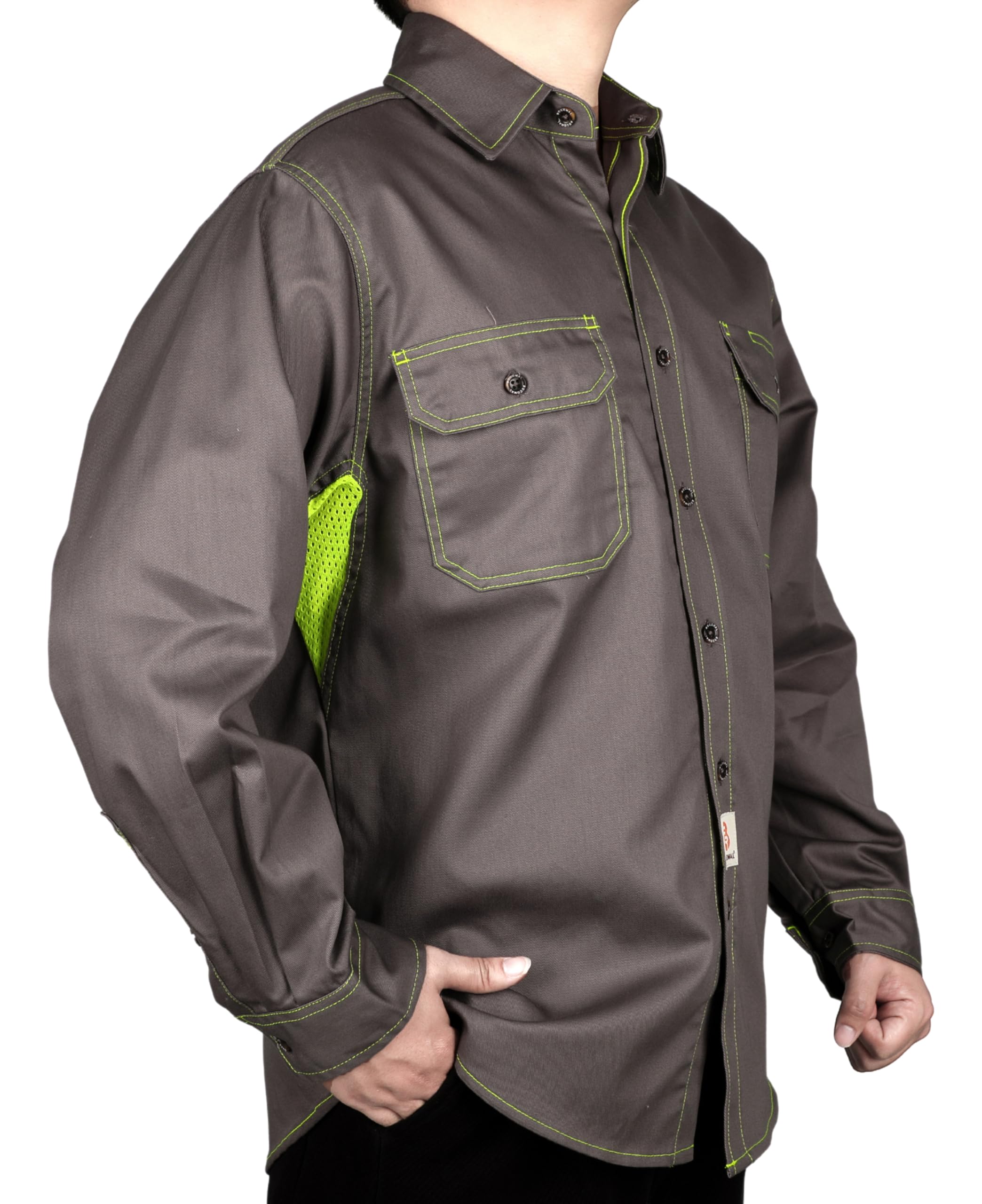 This Men's Flame-Resistant summer work whirt is built for safety and comfort on the job.Designed with breathable Vented mesh panels under the arms and back(button clousure) for better airflow, it keeps you cool during tough tasks in summer hot days.Made from lighgtweight 6.5 oz 100% cotton fabric,Modacrylic/Cotton Blend mesh,it offers reliable flame-resistant protection.The high-visibility yellow contrast mesh and stitching provide added safety in low-light conditions.