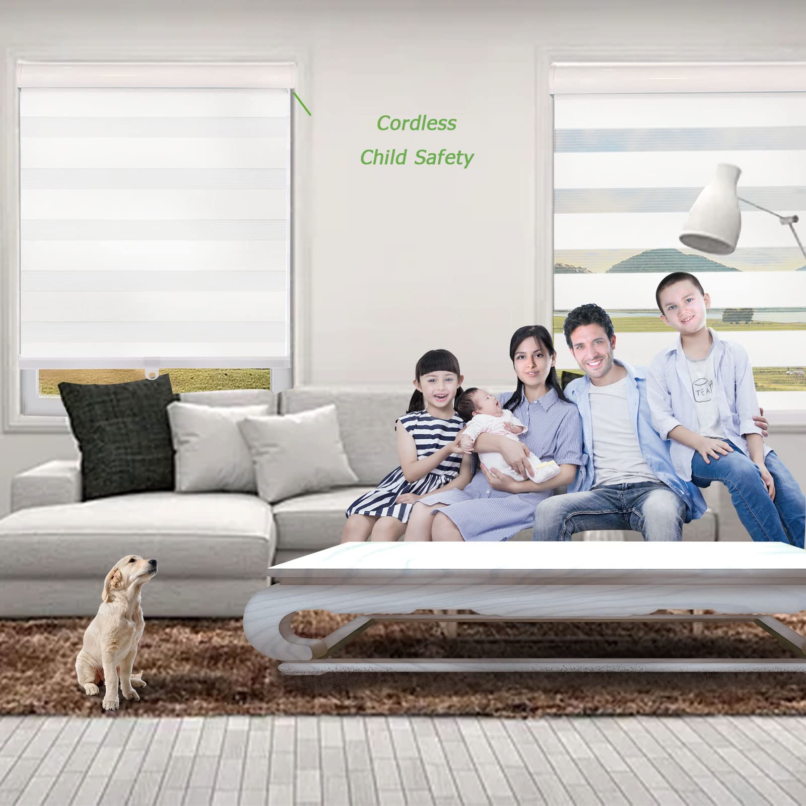 [UPGRADED CORDLESS DESIGN] Cordless design offers windows a clean, tangle-free look, reducing the safety hazards for children and pets; A handle at the bottom bar enables you to stop the shade at any length you want. Designed with a combination of sheer mesh & opaque fabric slats for Light filtering in day & night. Perfect for any room for Light filtering than Blackout function. Easy to install.