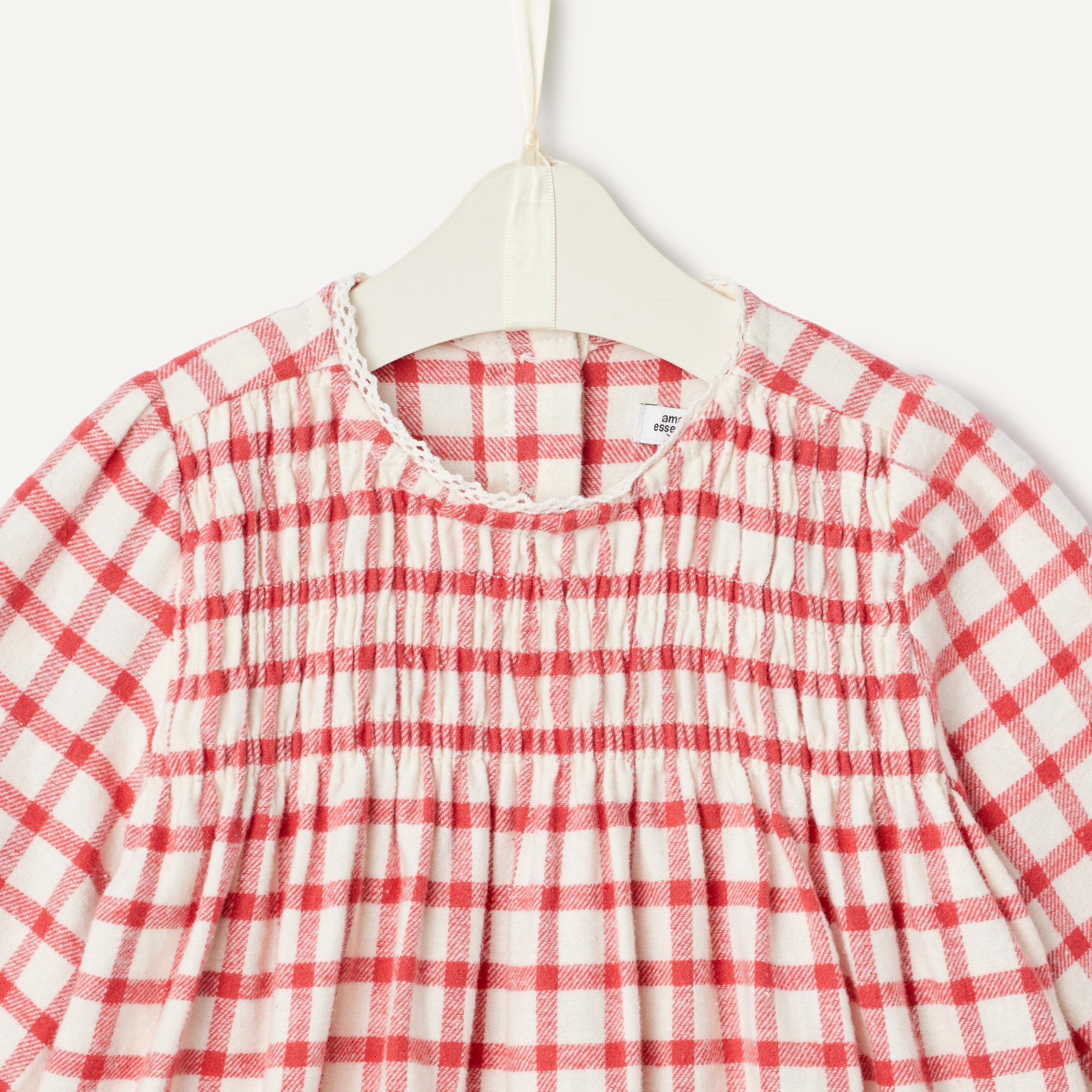 DETAILS: Smocked front bodice, delicate lace trim at neck and ruffle sleeve opening, button-back closure, and elastic waist pants with interior adjustability for a perfect fit