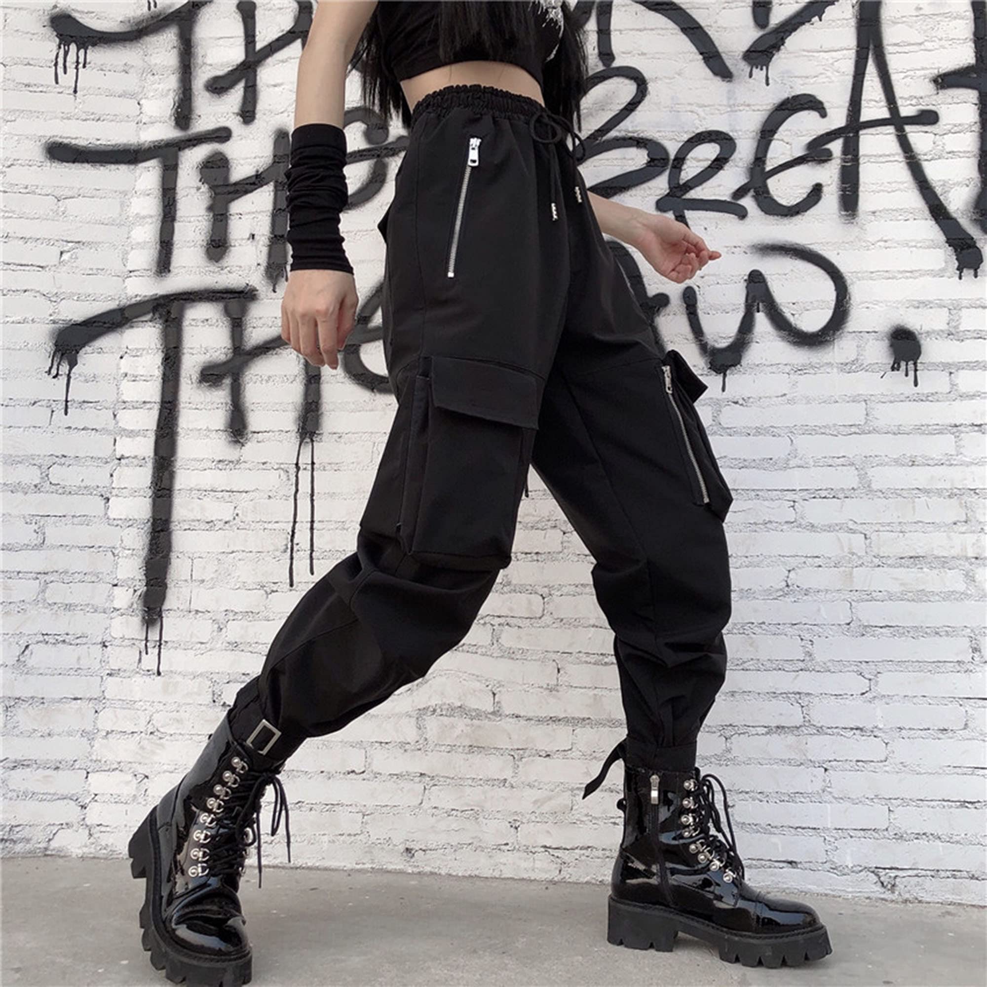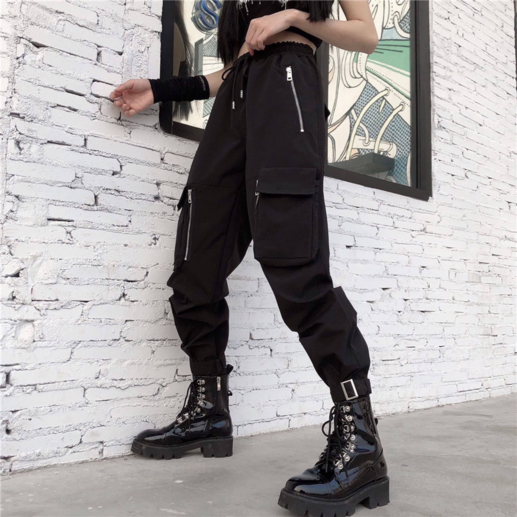 MEINVQIAOTI Black Cargo Pants Women Loose Chained Pants Multi-Pocket Multi-Zip Punk Goth Pants