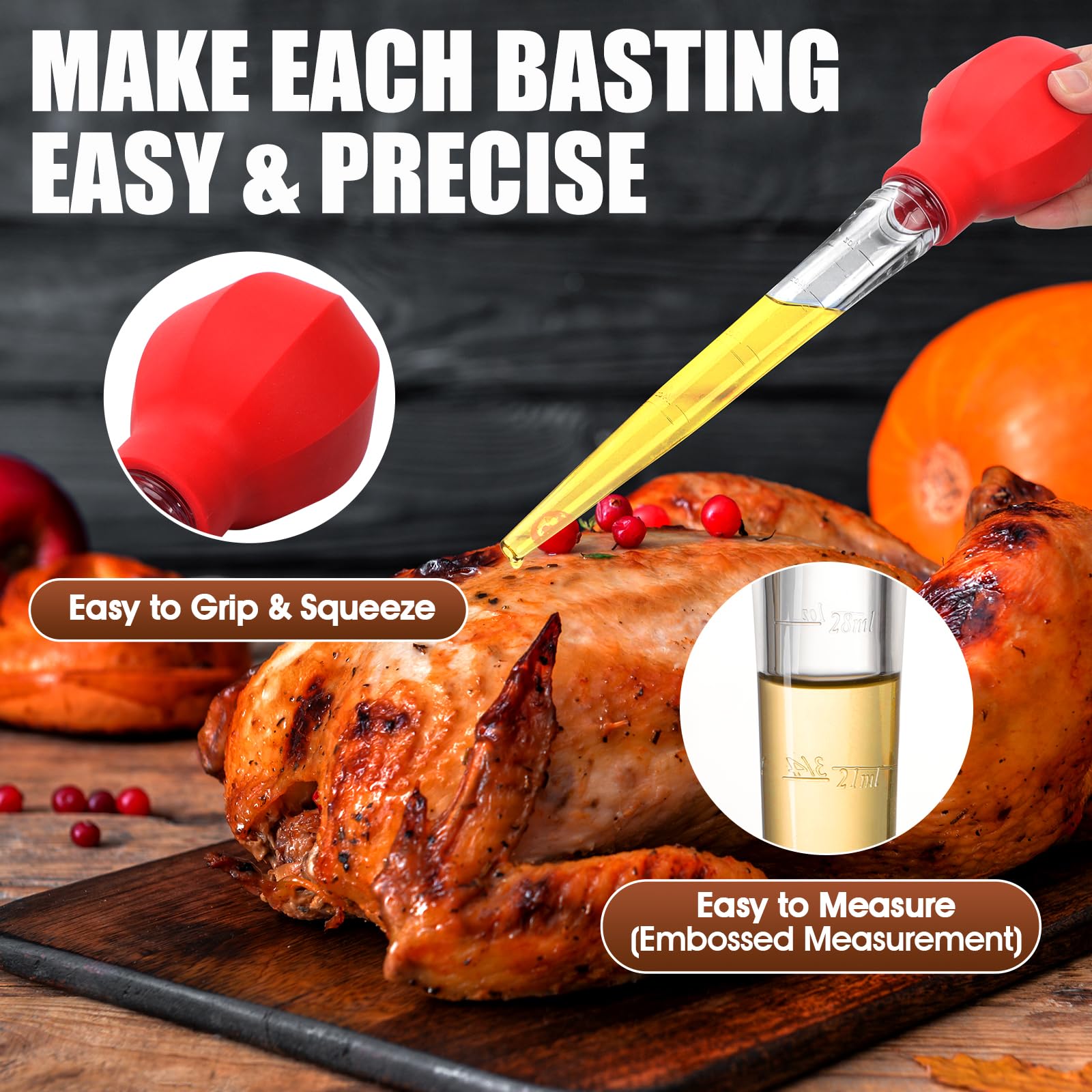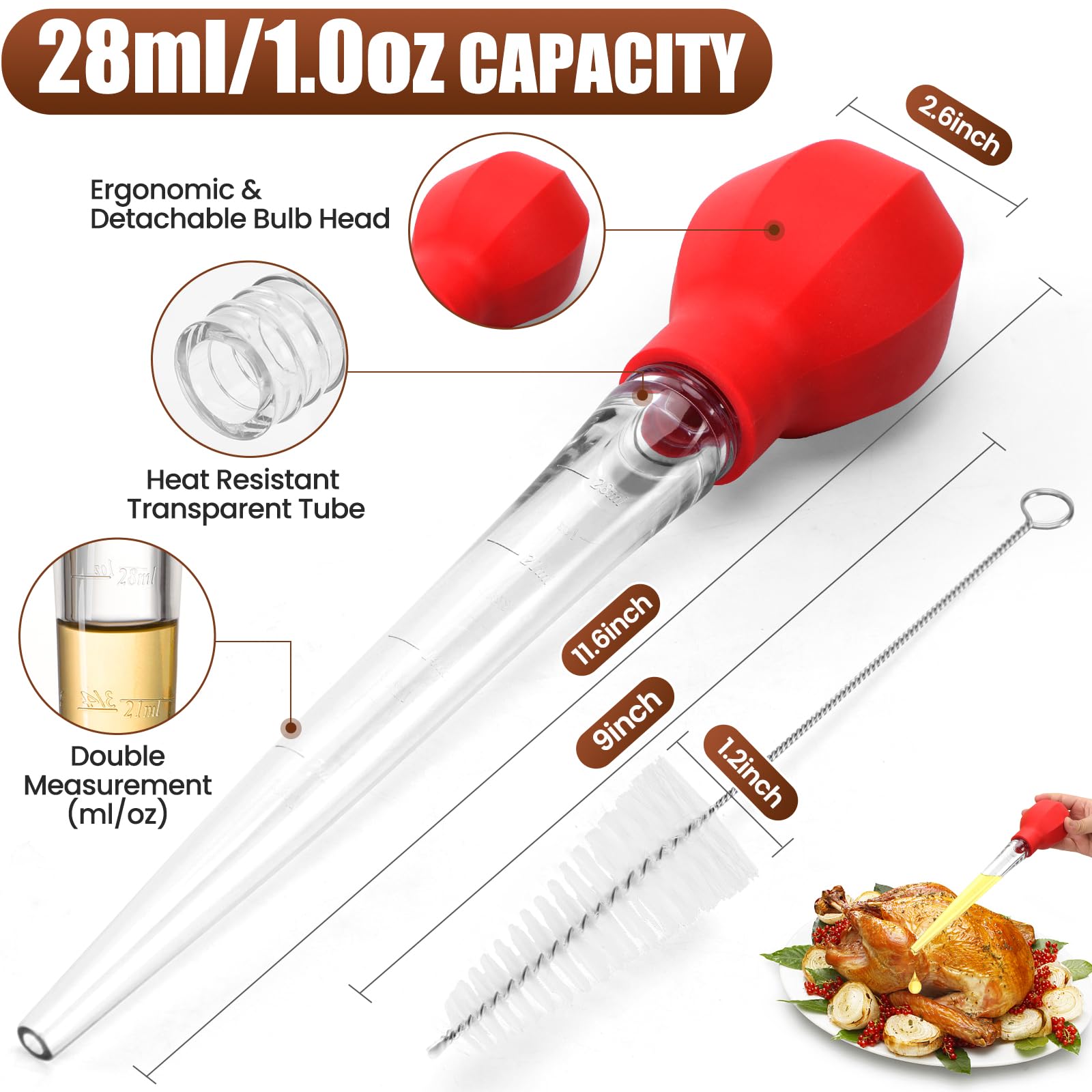 PREMIUM MATERIAL: This turkey baster syringe is made of heat-resistant food grade material AS that can bear up to 100℃/212℉. Large capacity(28ml/1oz) and double scale(ml/oz) design help you easily and precisely suck up juice in daily time. Hand wash your turkey baster with water(Cleanning brush is included) or place it in the dishwasher. Easy to clean and dishwasher safe!