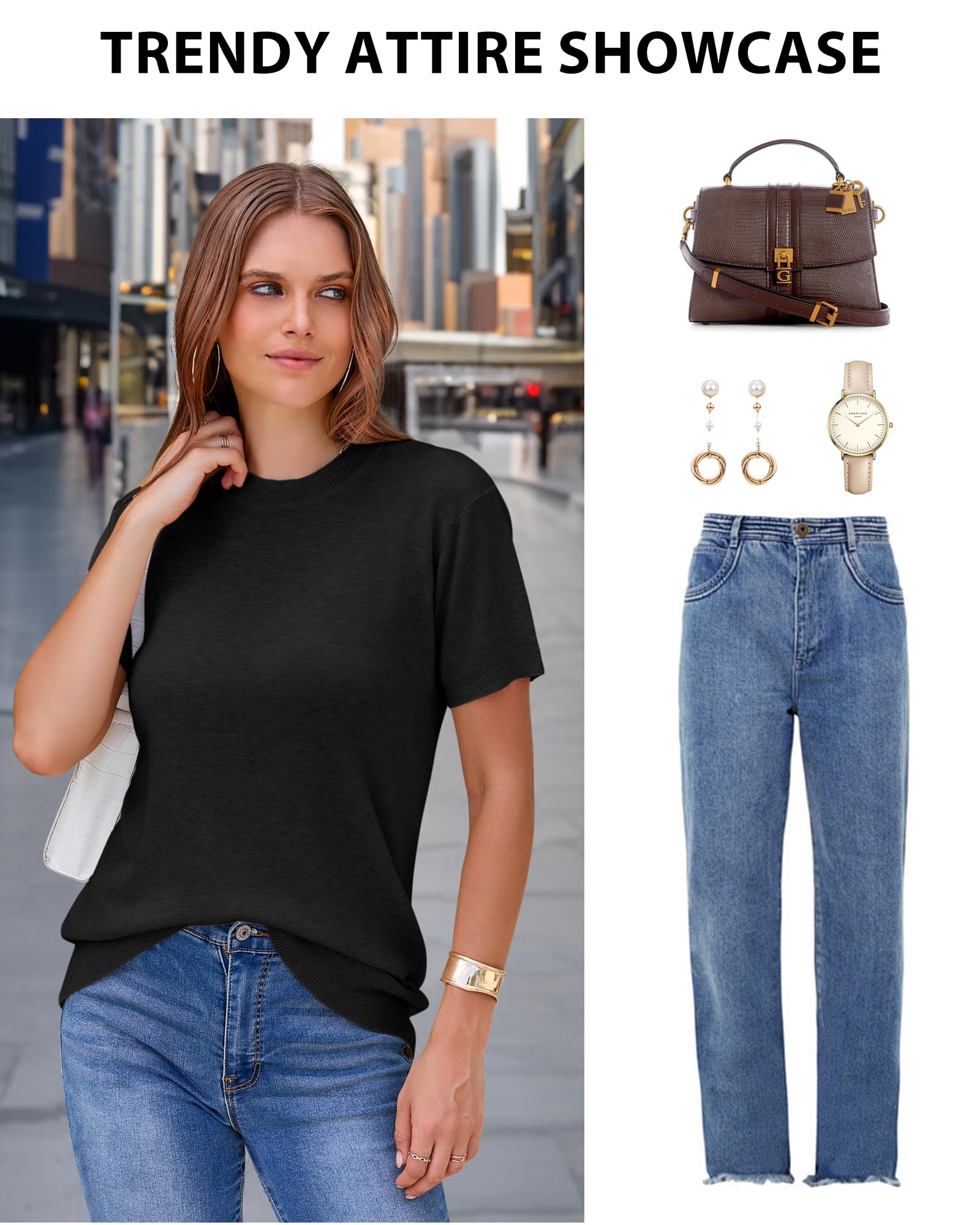 Features: Women's Summer Tops/ Essential Pullover Sweater/ Classic/ Loose Fit/ Short Sleeve/ Crew Neck/ Elastic Hem/ Solid Color