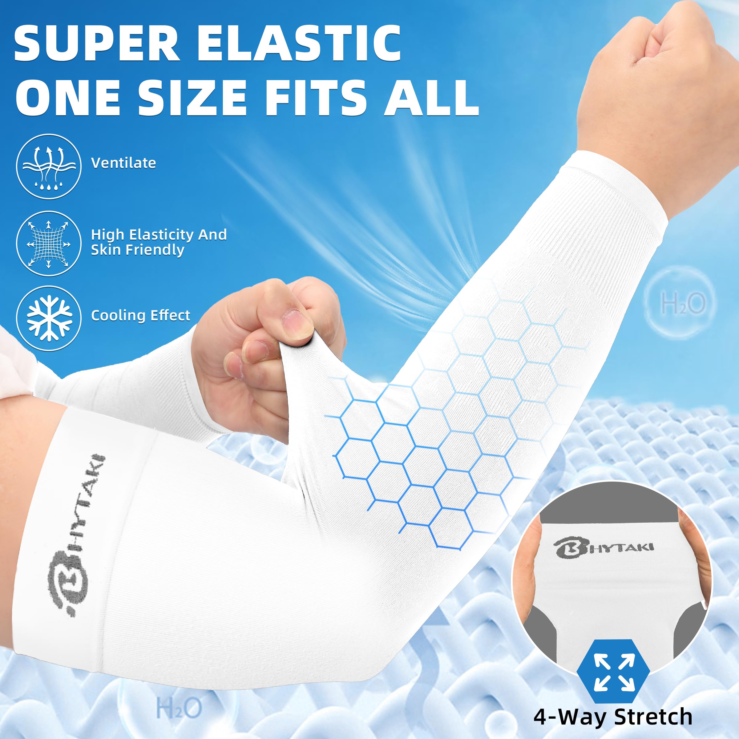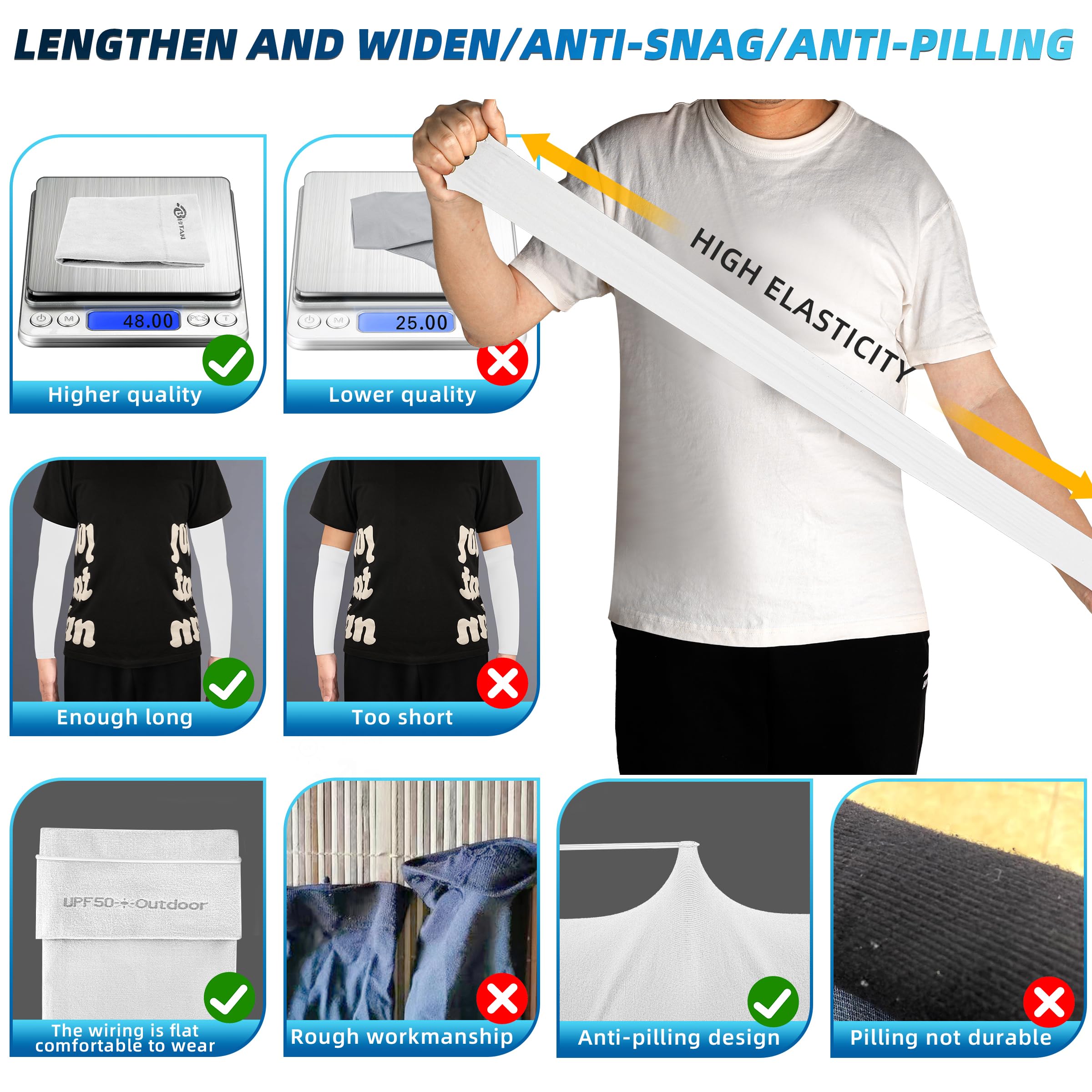 【Large Elastic Fit for Most】We broke the conventional cooling sleeves size and added elastic fibers, the length of the sun sleeves from 16.3 inches to 48 inches, and the width from 4 inches to 9.8 inches, can be stretched to the length you want, with high elasticity, it doesn't feel like it's strangling your arms when you wear it, and arm sleeves are more comfortable to wear. The arm sleeves circle of the upper arm has been designed to be widened to prevent slipping off during wearing.