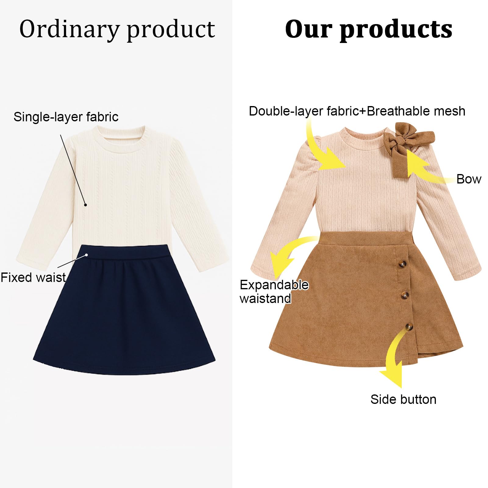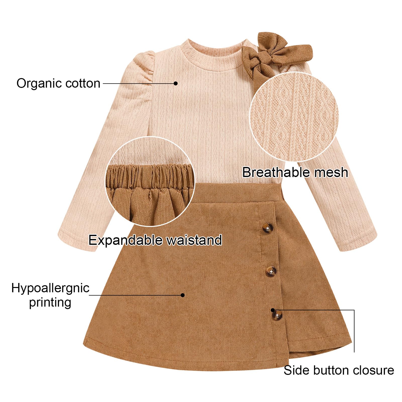 MATERIAL: Toddler girl shirt sweater top is made of cotton and polyester, bottom skirt is made of cotton blend and polyester, soft, breathble, and comfortable, sweet toddler baby girl 2 piece skirt set, cute baby girl clothes.