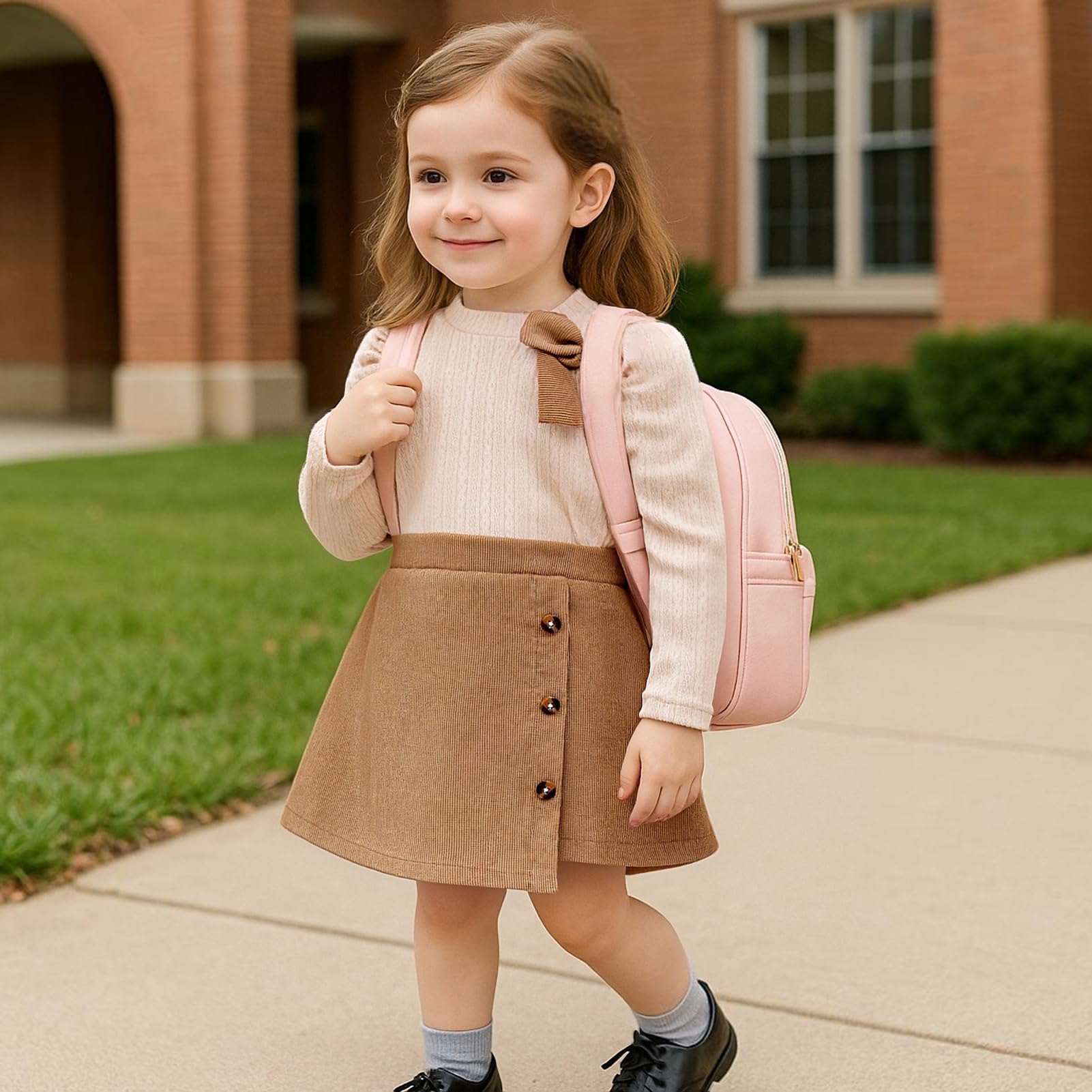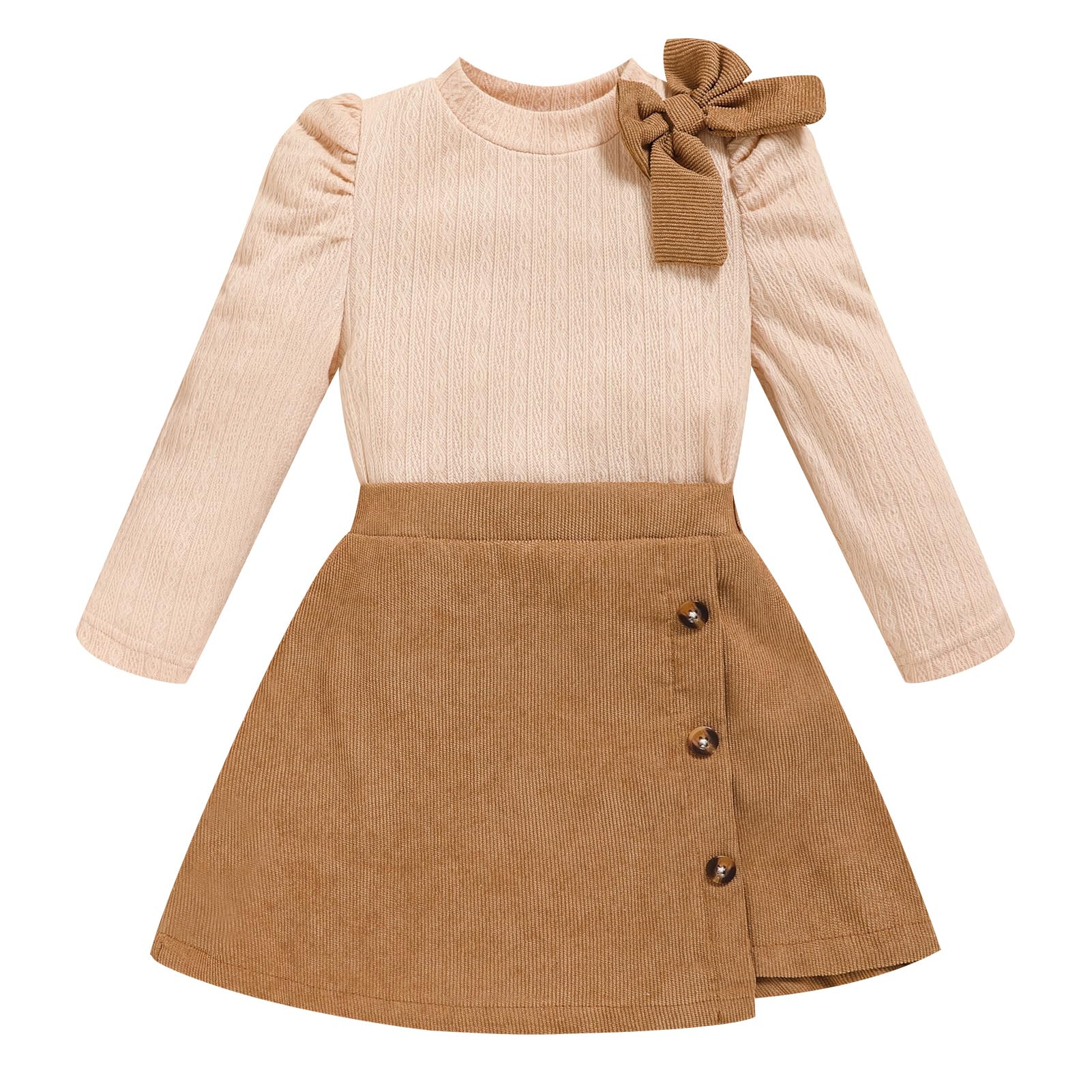 Design: Kids Little girl spring fall winter skirt set,knitted cotton long sleeve solid color top, button mini skirt with elastic waist , winter fashion warm toddler girls clothes outfits.