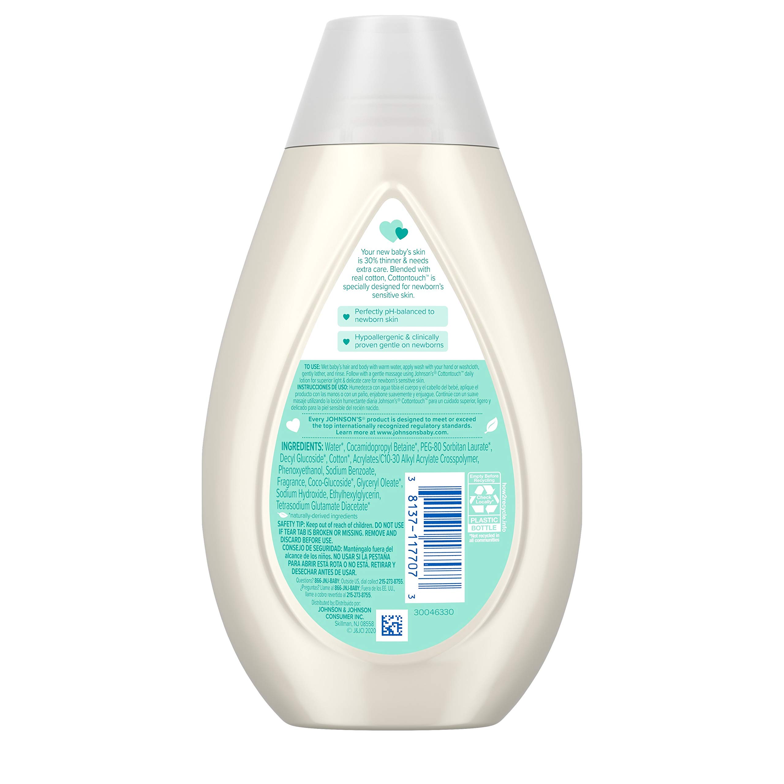 Gently cleanse your baby's skin and hair with Johnson's CottonTouch Newborn Baby Wash and Shampoo. Specially formulated to be gentle on your newborn's sensitive skin, this nourishing baby wash and baby shampoo leaves skin and hair clean and touchably soft. The Johnson's No More Tears won't irritate your baby's delicate eyes during bath time. The light, velvety texture of the wash rinses easily and leaves your baby's hair and skin feeling clean and moisturized. From Johnson's, the number-one choice of hospitals, this tear-free baby wash and shampoo is pH balanced, hypoallergenic, free of parabens, phthalates, sulfates, and dyes. The baby bath wash is blended with real cotton and is soft on a newborn's skin as it gently washes away dirt & germs. Our safety assurance process is designed to meet or exceed governmental regulatory cosmetic standards around the world, so you can feel good about using CottonTouch Newborn Baby Body Wash and Shampoo on your little one.