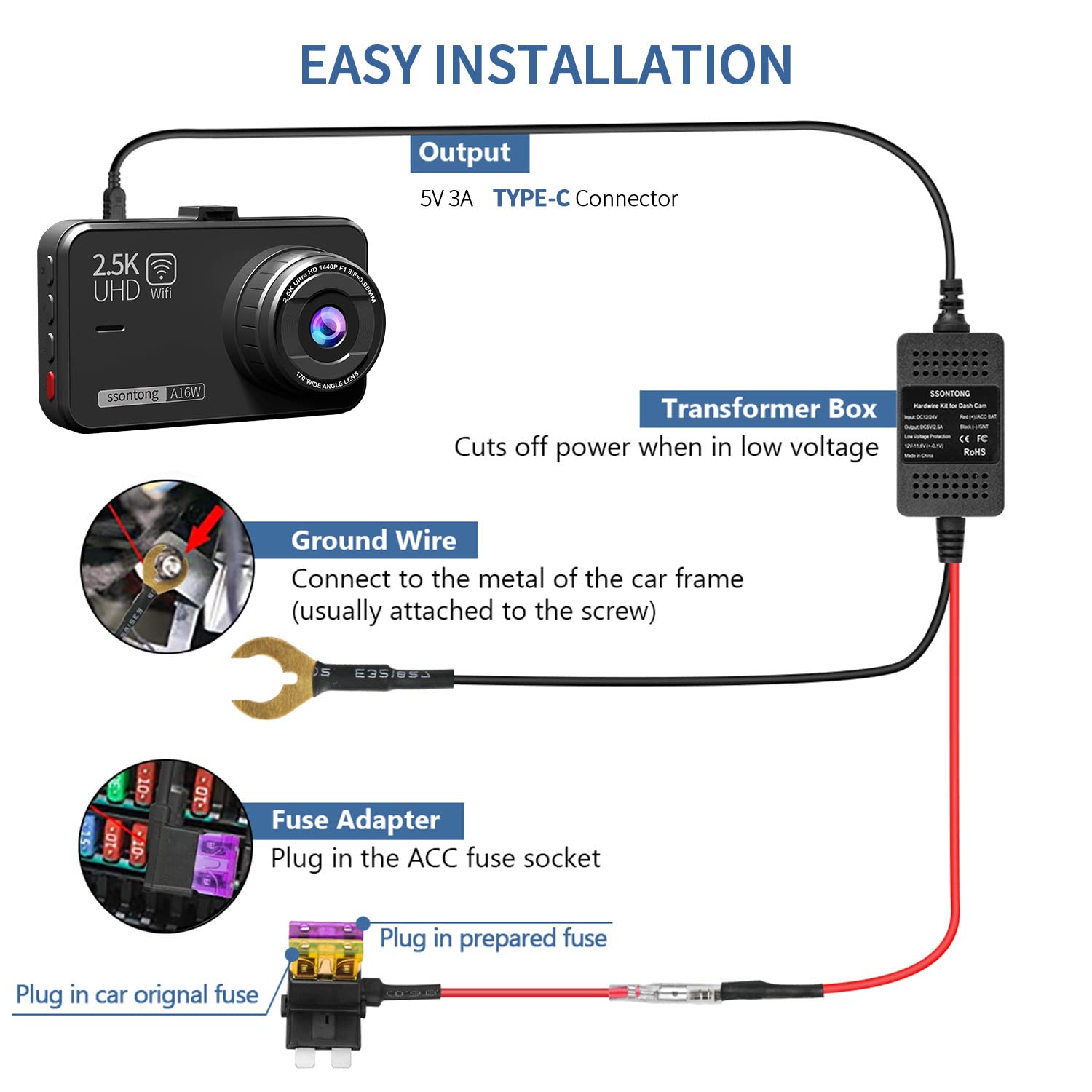 ❖{24 Hour Surveillance Dash Cam Hardwire Kit Type C}: The hard wire kit for dash cam with Mini, ACS, ATO, Micro2 add a circuit fuse holders. The dash cam hardwire connected to car battery or fuse box power, can uninterruptedly supply power for dash camera for 24 hours. Keeps it powered even after engine off, protect your car all day. The prerequisite can only be met if the car's battery capacity is sufficient to support it. It will not work under low voltage conditions