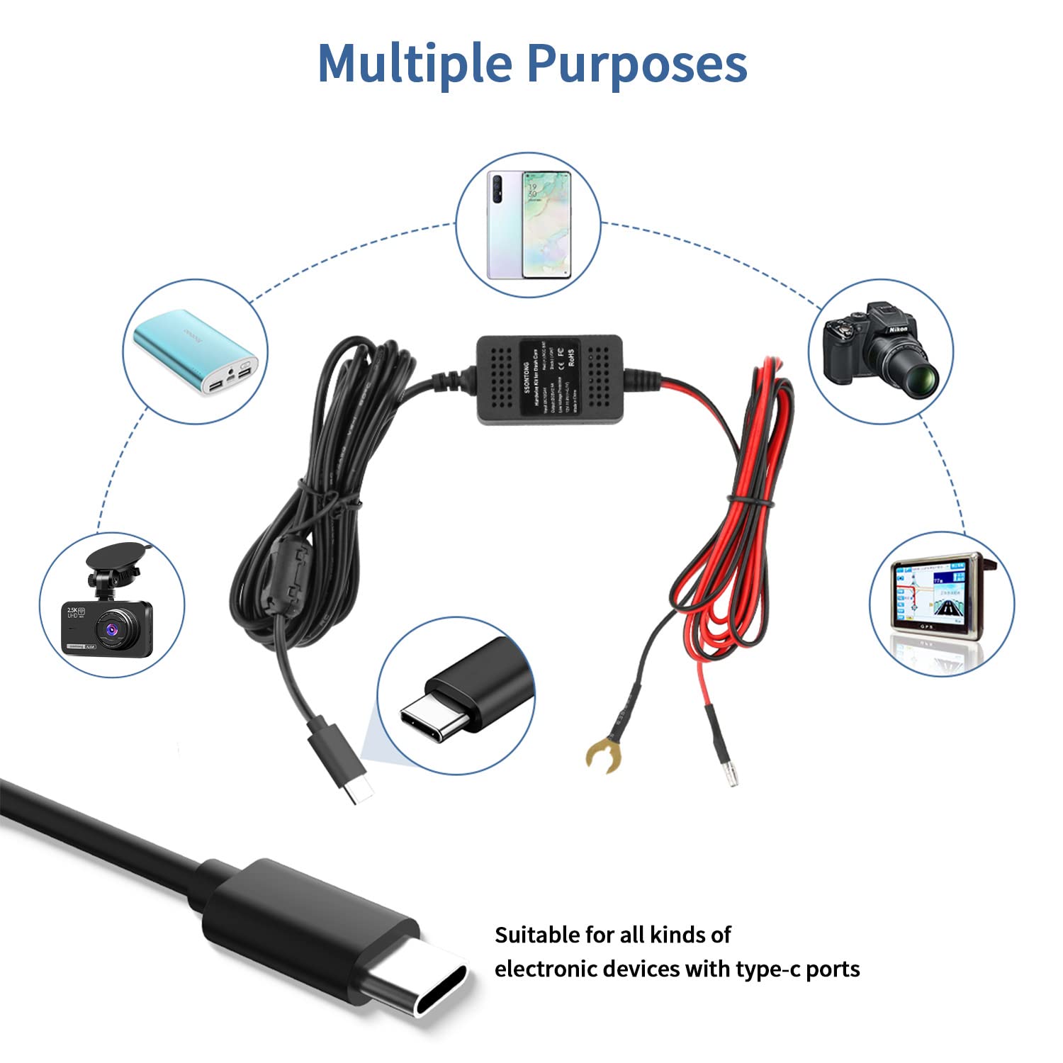 ❖{Broadly Compatibility Type C Hardwire Kit for Dash Cam} : TYPE-C PORT PLEASE CHECK YOUR DASH CAM PORT. Input:12V-24V; Output:5V/3A (also fits for 1A). The dash cam hardwire kit compatible with all of dash cams Car DVR, GPS Navigator, Radar Detectors and More. Also comes with Low-Profile Mini, Mini, ATO (Regular) and Micro2 fuse adapter, suitable for most cars. Leads come with protective sleeve to cover the crimps
