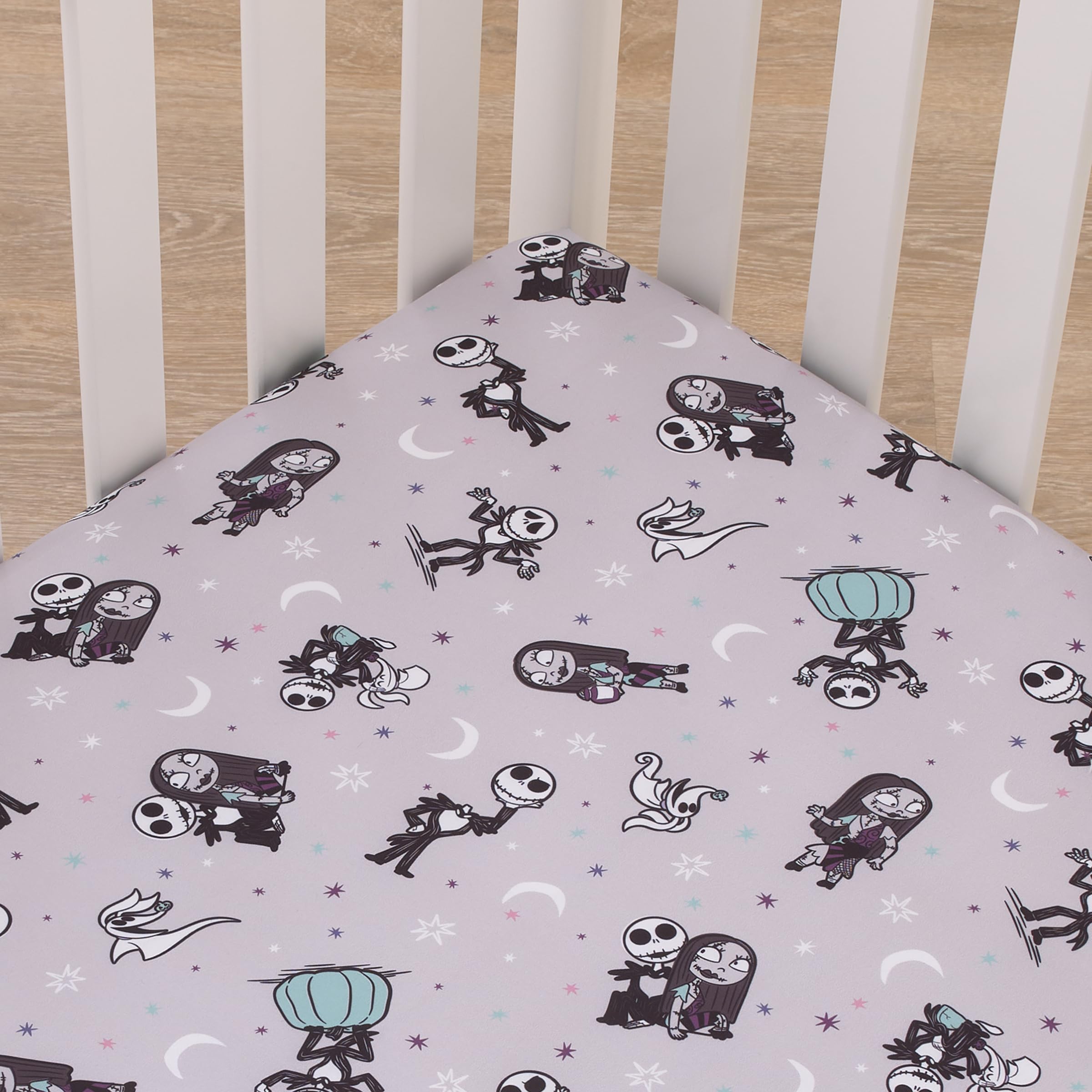 The Disney Nightmare Before Christmas Fitted Mini Crib Sheet features a scarry fun allover pattern with Jack Skellington, his dog Zero, and Sally! Designed in shades of black, white, gray, with accents in light blue. Jack Skellington, The Pumpkin King is with Sally and his Ghost Dog Zero, surrounded with moon, stars, and pumpkins! Your little one will sleep soundly on this mini crib sheet's cozy surface. Measures 24" x 38" x 5" and includes full elastic edges for a safe and snug fit and fits a standard size mini crib mattress. A fun and playful pattern for your baby’s nursery!