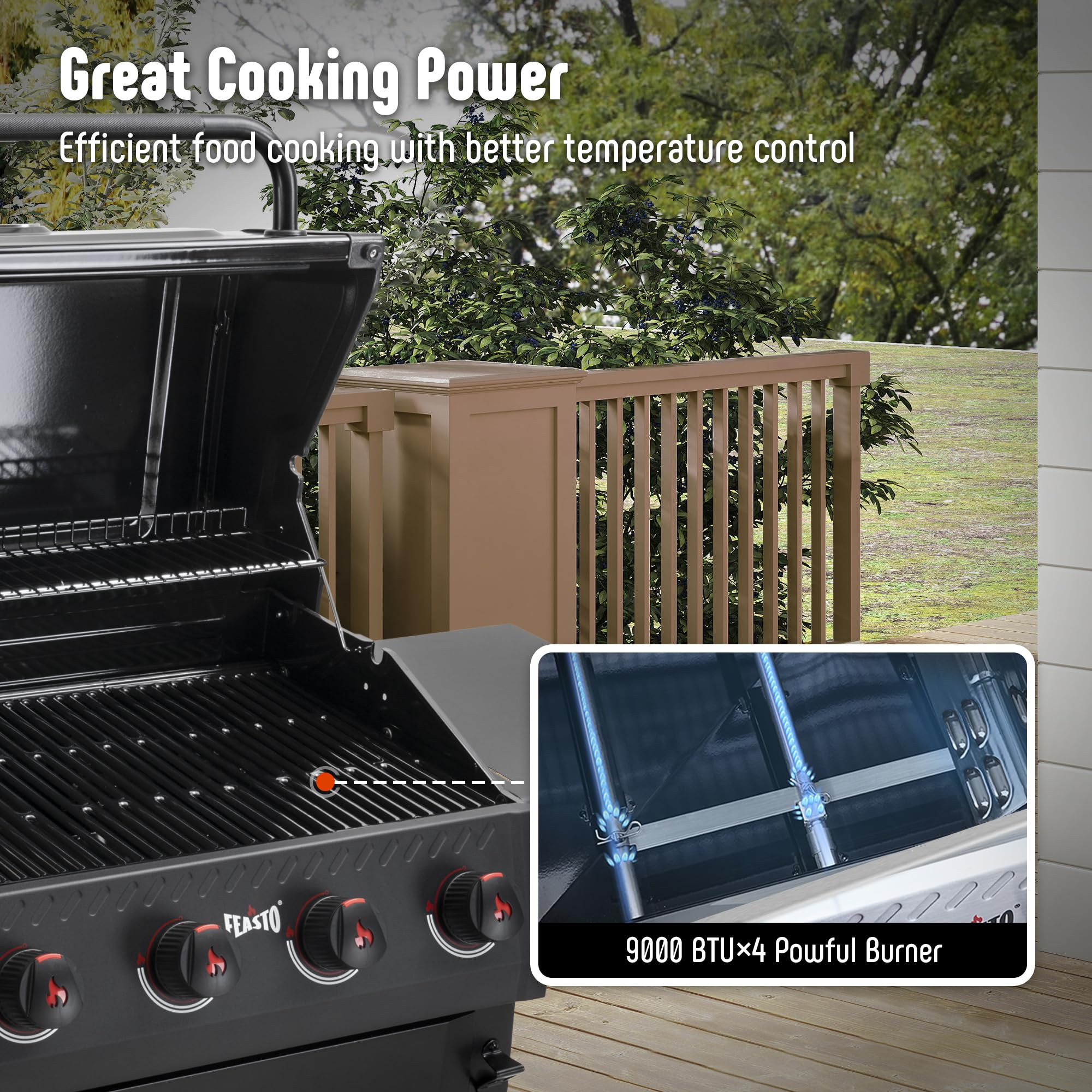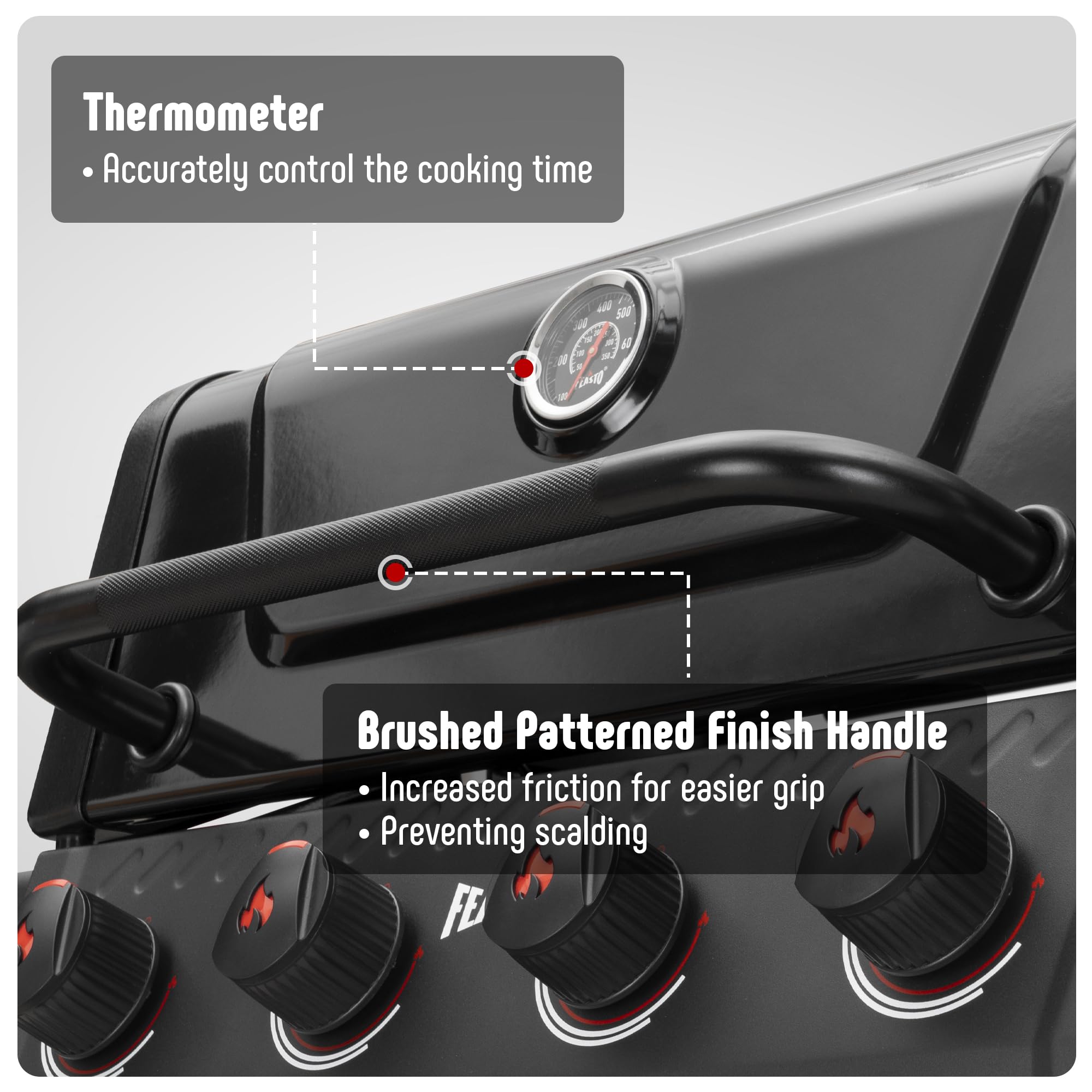 Stainless Steel Burner: The propane BBQ grill got 4 durable stainless steel burners with a total output of 36,000 BTU,ensuring long-lasting performance and even heat distribution