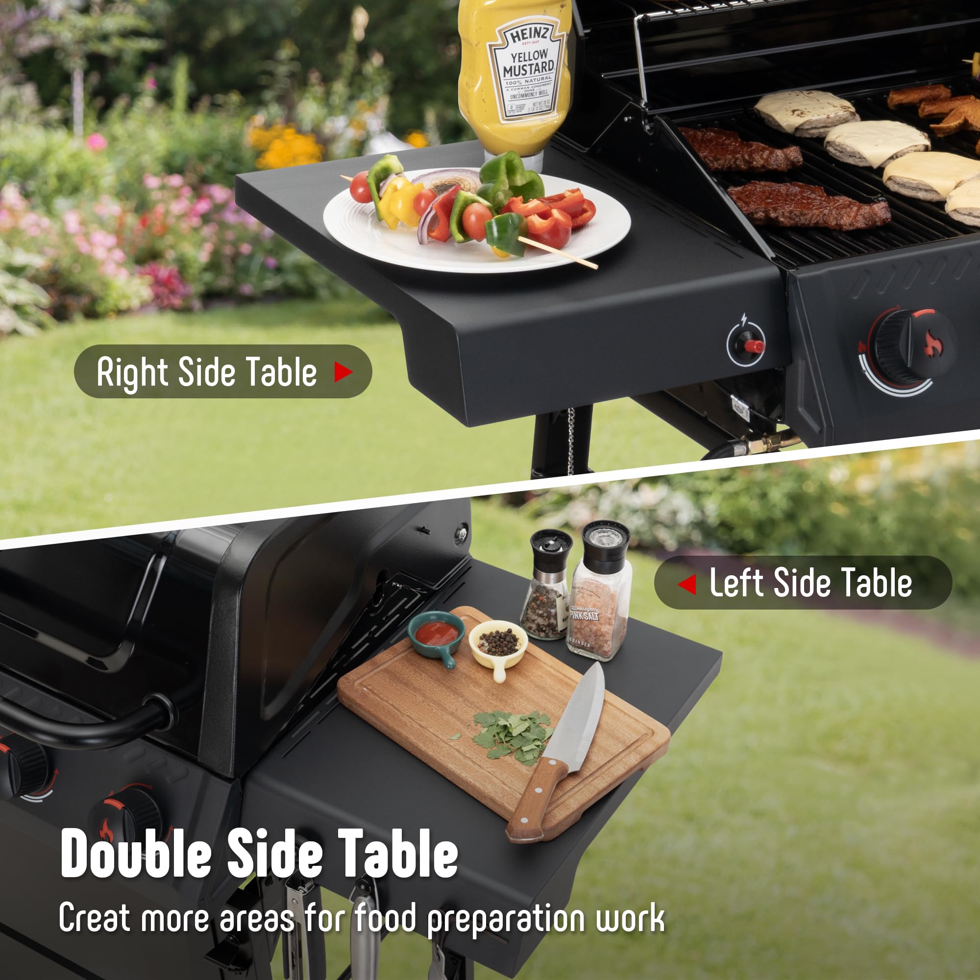 User-Friendly Design: Equipped with 2 side tables for extra cooking space, a propane tank holder, 3 tool hooks, non-slip handles, and a built-in thermometer for accurate control. The wheels make movement easier