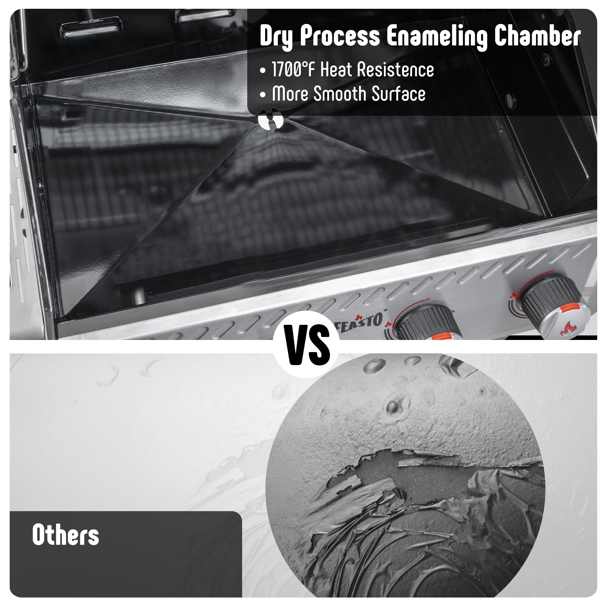 Porcelain Enamel Body: This outdoor propane grill got premium porcelain enameled stove body, which can withstand temperatures up to 1700°F, offering excellent heat retention. Also prevents surface peeling, enhancing the stove's durability and overall aesthetic appeal