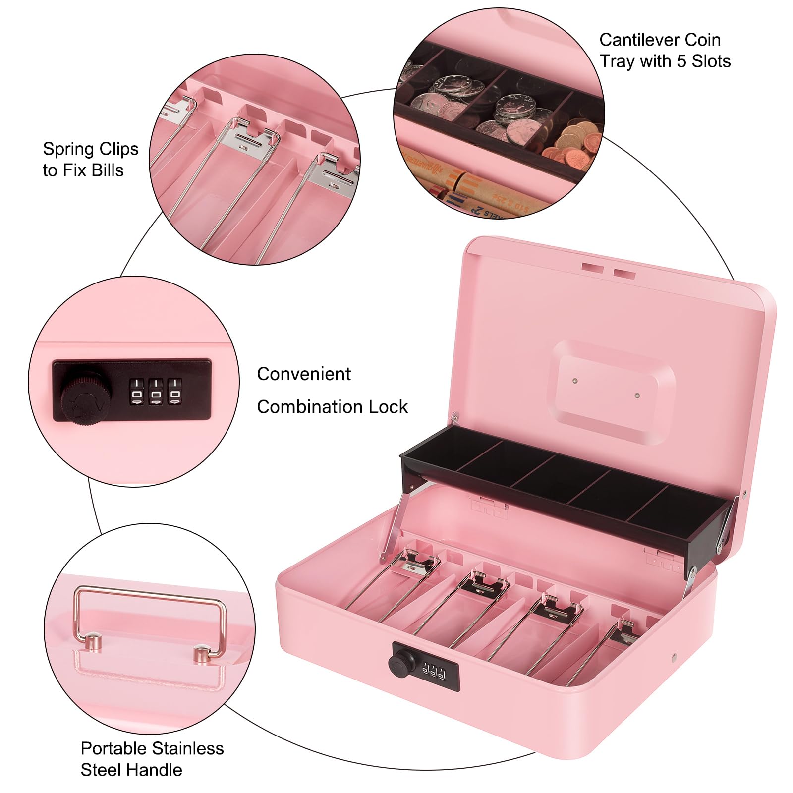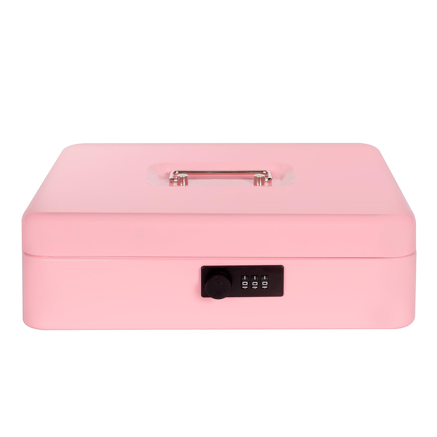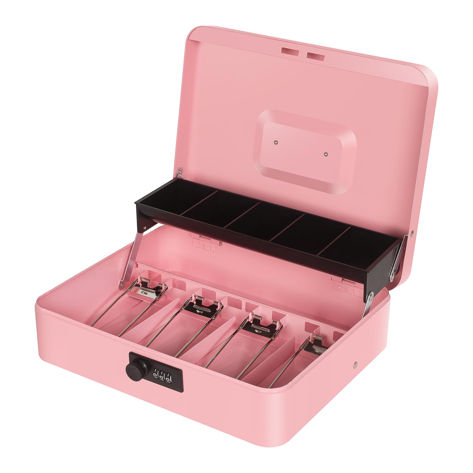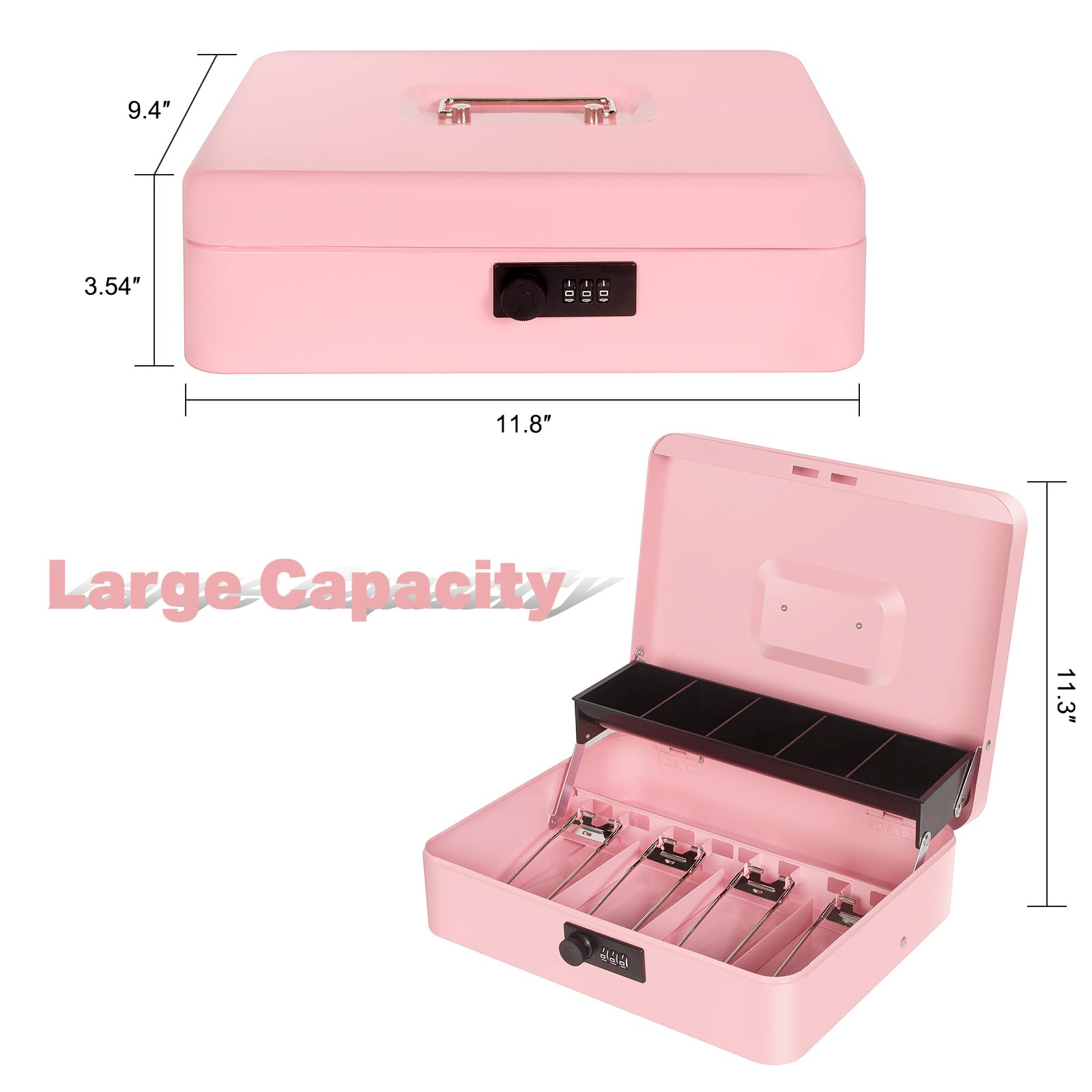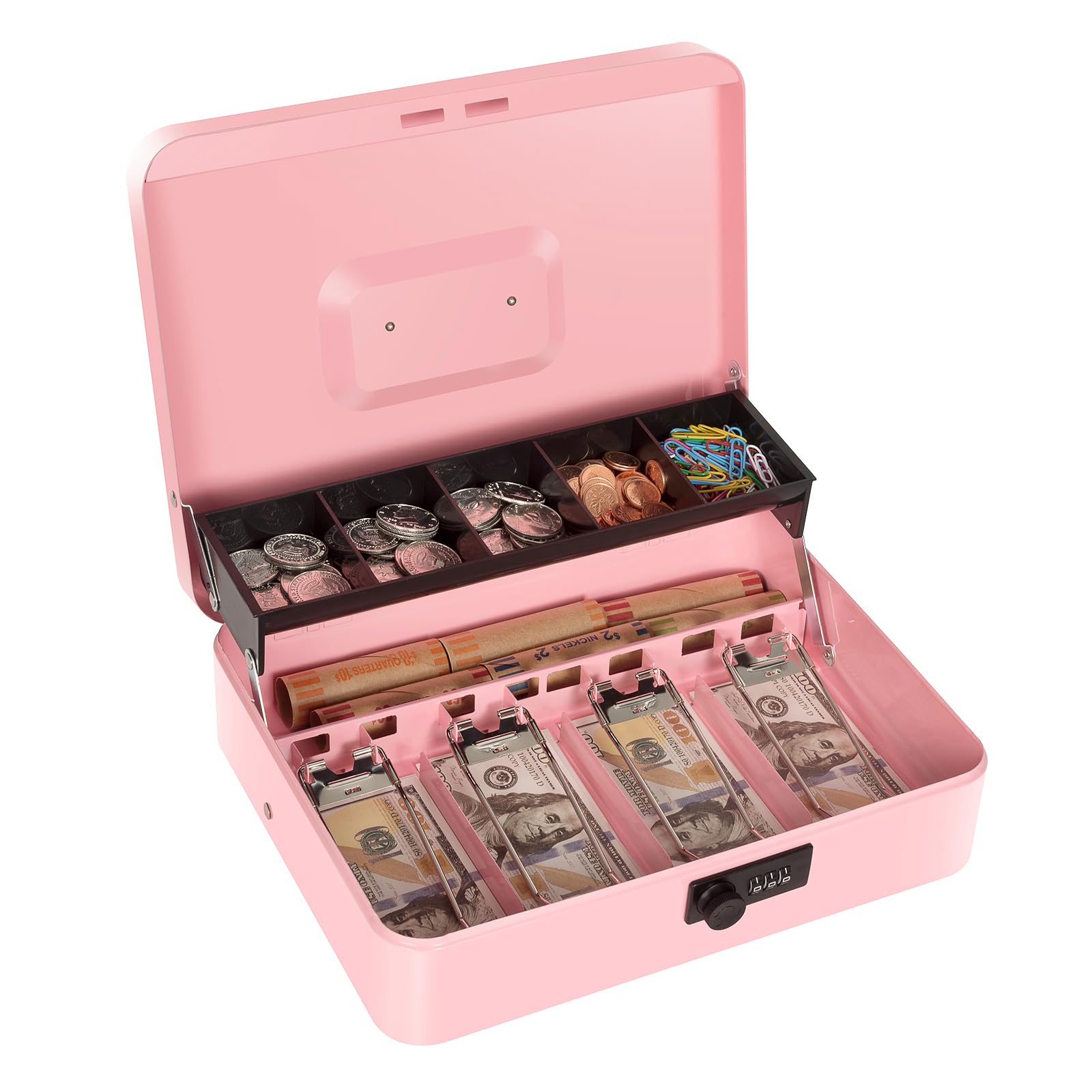 LARGE SPACE: our pink cash box with money tray and lock is designed with 3 parts: coin storage area, bill storage area, notes and receipts storage area, which providing large space to storage cash, coins, valuables and keep them well organized