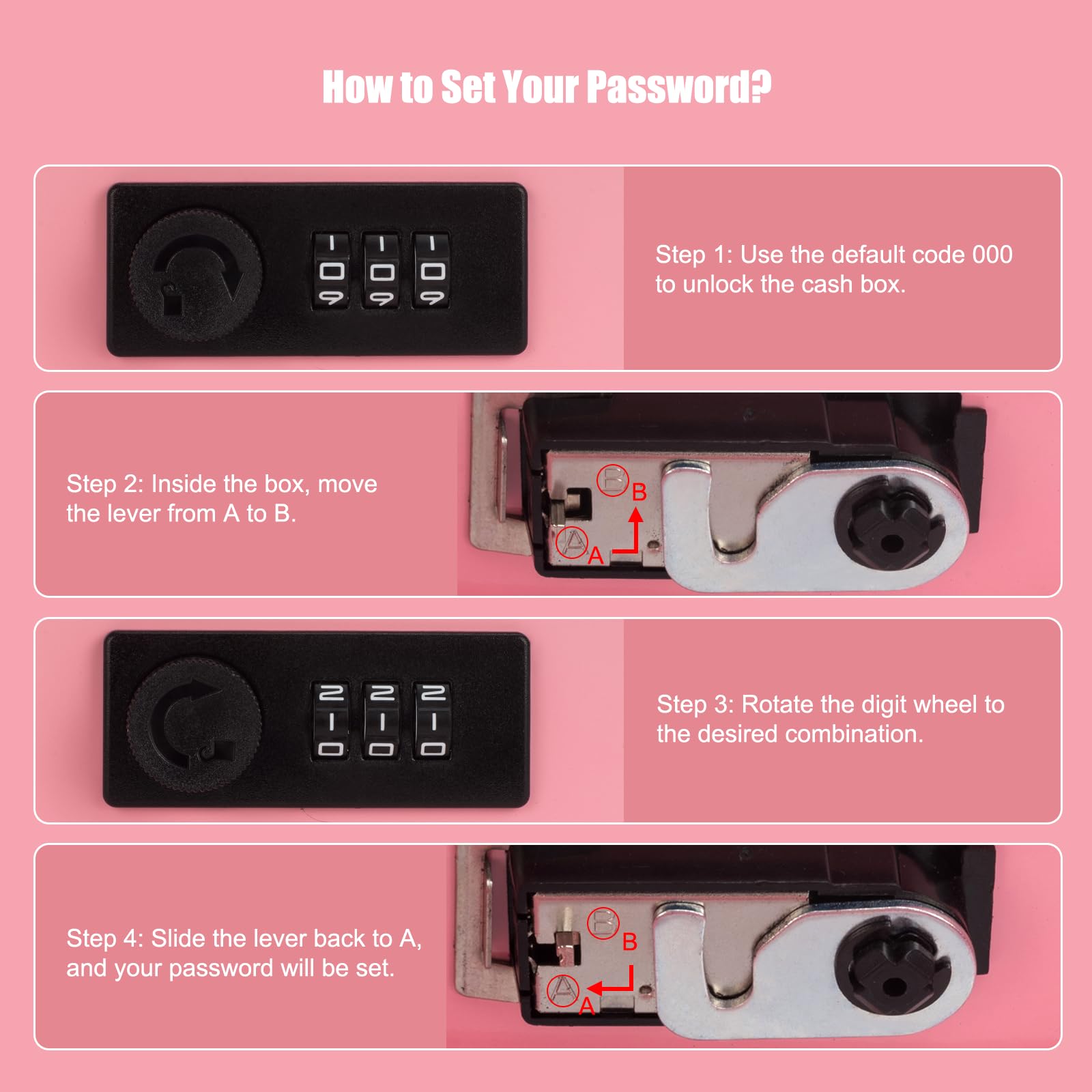 CONVENIENT COMBINATION LOCK: the metal cash box with combination lock is equipped with a three-digit combination lock, which can be easily set and reset. This safe box for money is highly convenient to use, eliminating the need to worry about losing keys