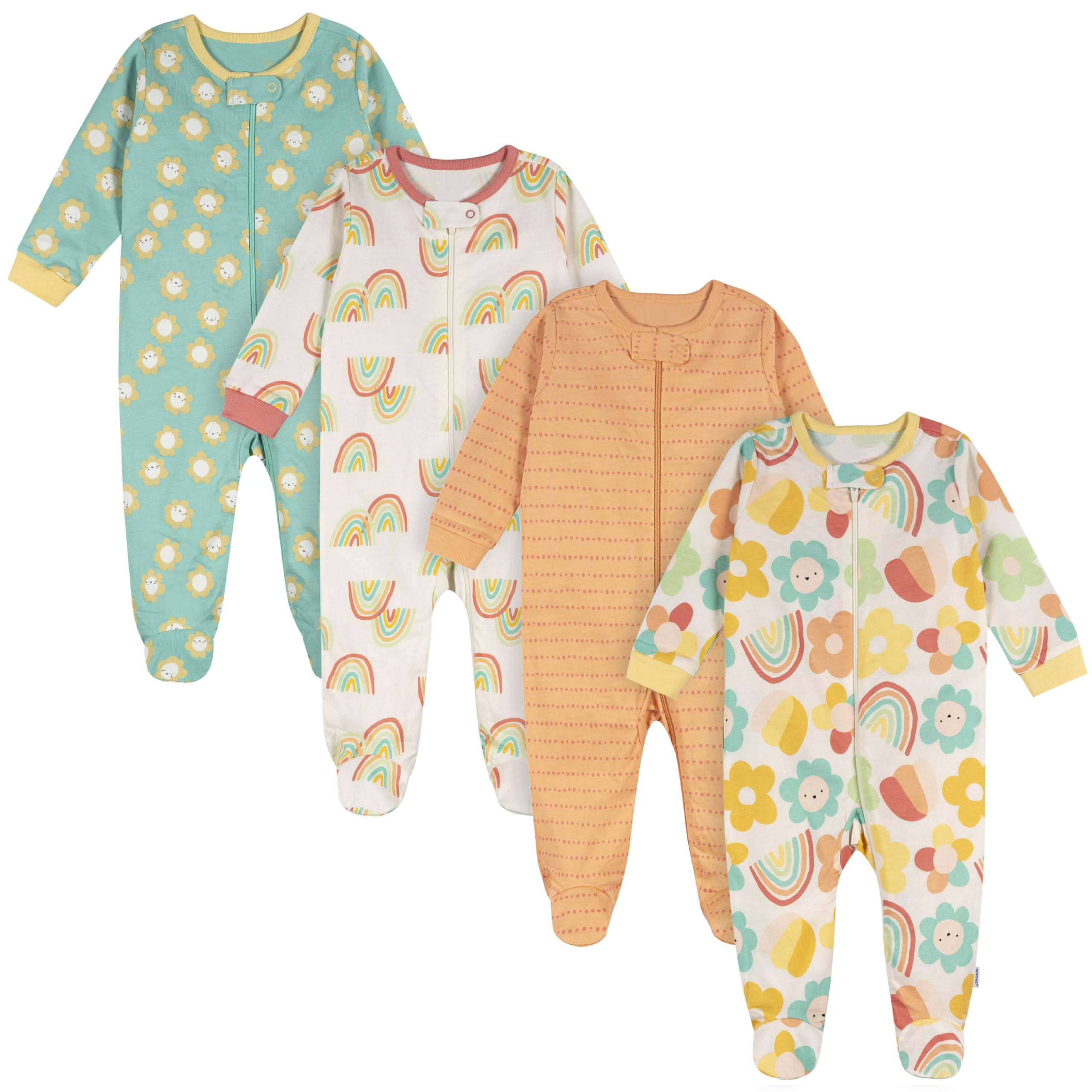 Description Discover bedtime comfort with this four-pack of Sleep 'N Plays, perfect for your little one’s all-day adventures and nap time needs. Crafted from 100% cotton, these adorable outfits are gentle on sensitive skin, providing a soft, breathable fit that’s perfect for every activity. The full-length zipper makes dressing and diaper changes quick and easy, while the ribbed neckline with a zipper protector ensures a snug, irritation-free fit. With their footed style, these Sleep 'N Plays offer an extra cozy touch, keeping your baby warm and comfy whether they’re playing, napping, or just lounging around.