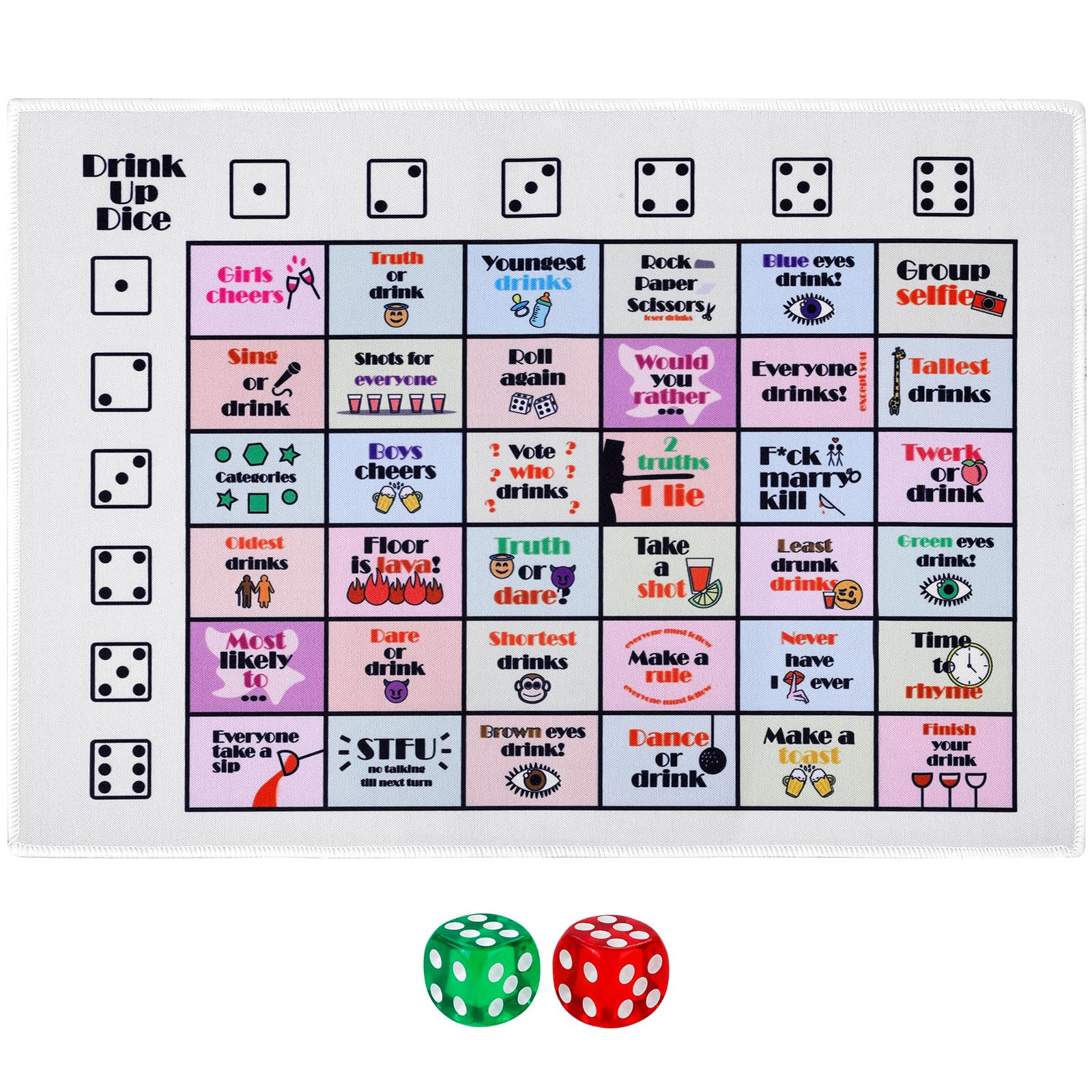 Includes: 1 piece rubber drinking games mat, 2 dices. Play mat size: 15.0 inches L* 11.0 inches H. Recommended for ages 21 and up. This game is for adults only.