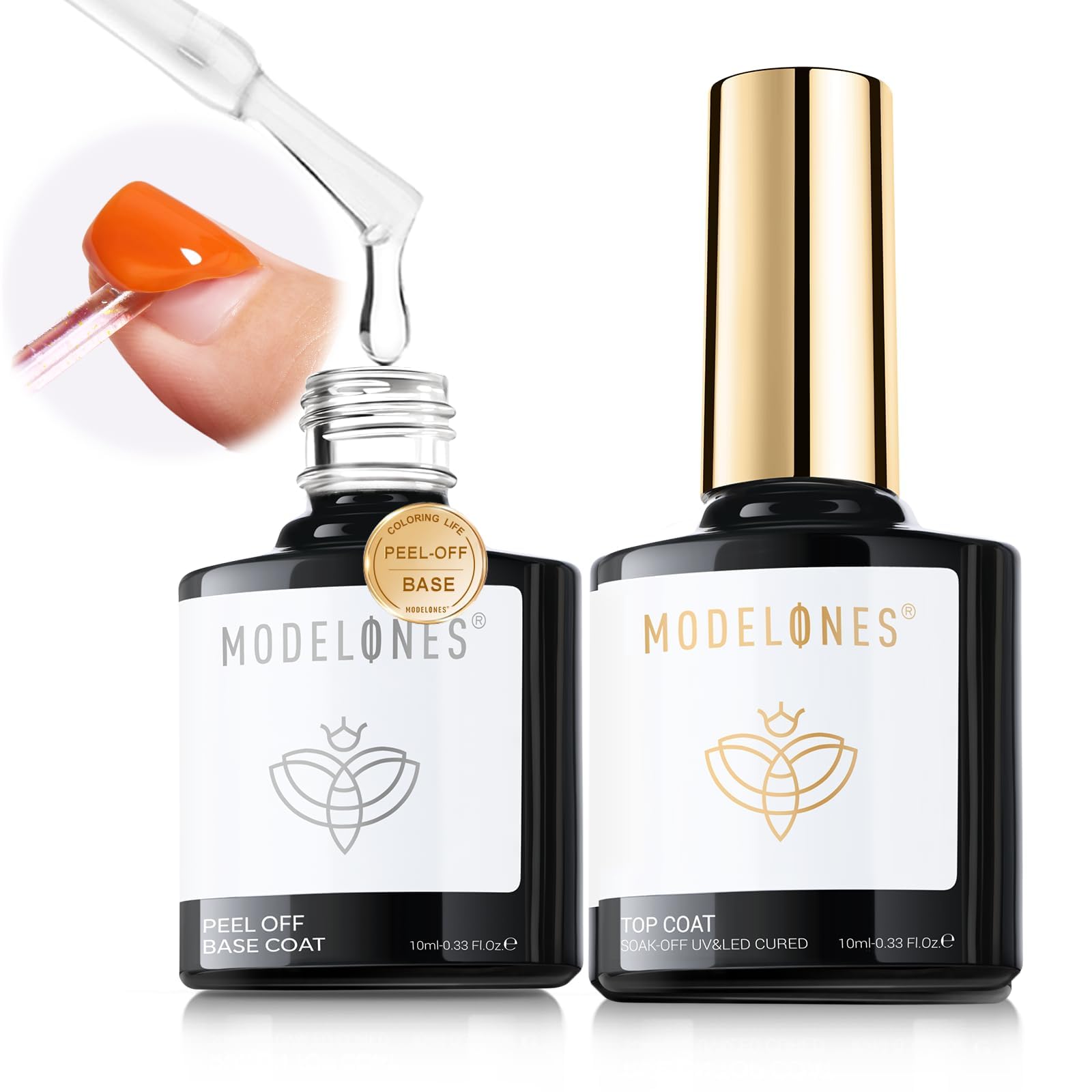 Upgraded Formula Must-haves Set for Nail Art: modelones upgraded manicure essential kit includes 1*10 ml peel-off base coat+ 1*10 ml gel top coat. Delivers a high-gloss, bubble-free finish with lasting durability. Acid-free and non-yellowing to protect and strengthen nails. Ensures chip-resistant wear with brilliant shine day after day