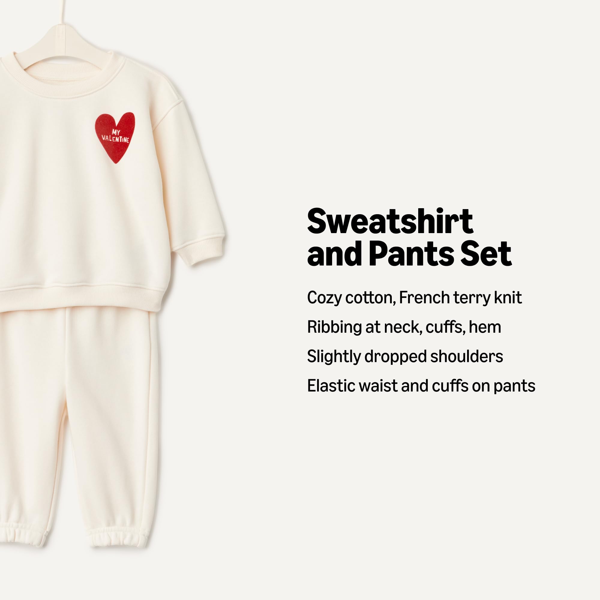 DETAILS: Sweatshirt features slightly dropped shoulder and soft ribbing at neck, cuffs and hem. Pants feature elastic waist and cuffs