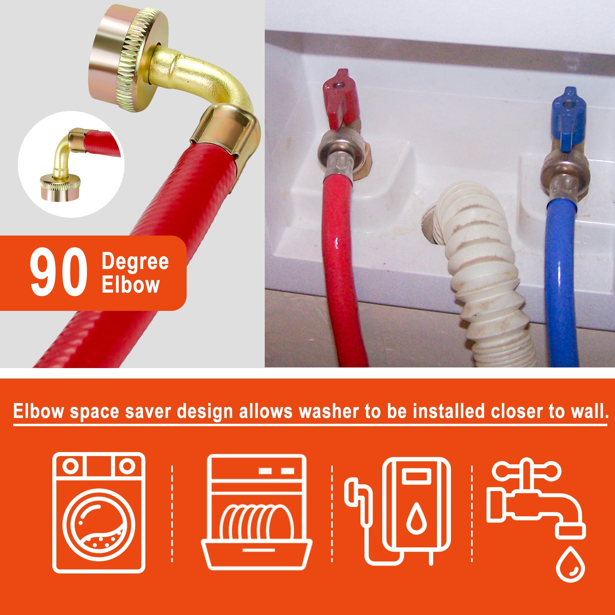 𝟵𝟬° 𝗘𝗹𝗯𝗼𝘄 𝗛𝗼𝘀𝗲𝘀: Compared to straight washer hoses, 90 degree elbow washing machine hoses are more practical, the elbow design is more space-saving, allowing the laundry to be installed closer to the wall, suitable for more narrow spaces, elbow hose is more durable, will not be damaged by long-term bending