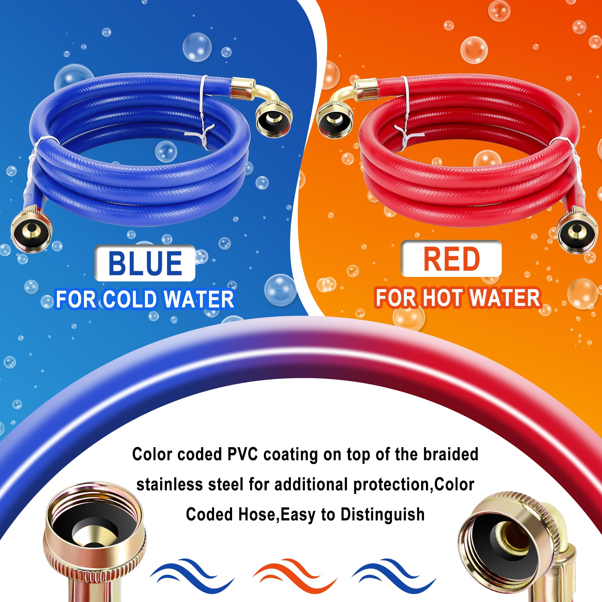 𝗛𝗼𝘁 𝗮𝗻𝗱 𝗖𝗼𝗹𝗱 𝗛𝗼𝘀𝗲𝘀: In each package we are equipped with a red hot and a blue cold washer machine hoses. The superior quality hose is better to withstand high pressures and temperatures, and can supply water during cold weather. Whether you are replacing a worn out hose or upgrading your washing machine, the 6ft washing machine hoses will be a great choice for any home