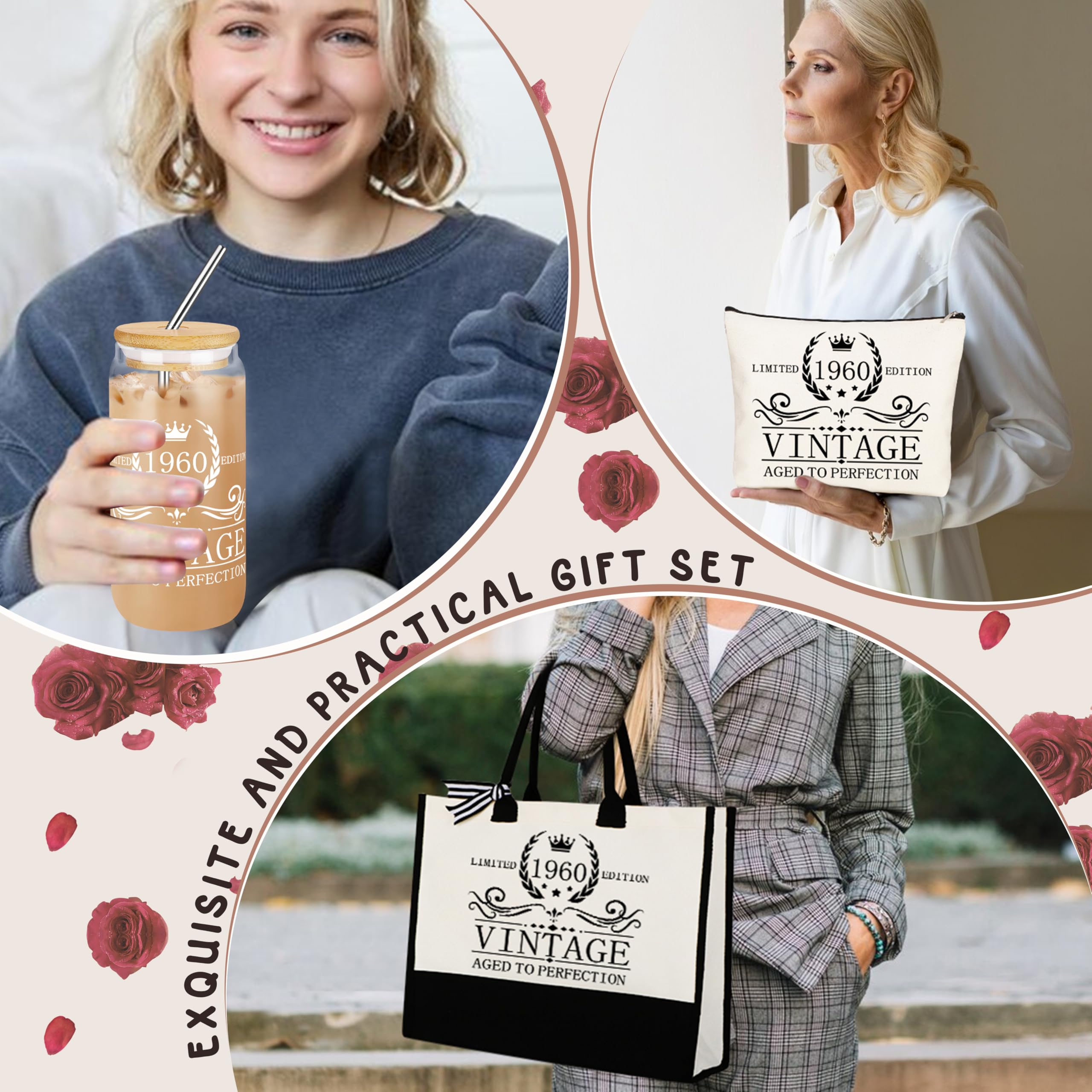 VINTAGE 1960 BIRTHDAY GIFTS FOR HER: The unique 1960 vintage tote bag and 1960 cosmetic bag are the perfect gift for a woman's 65th birthday. Designed for a woman born in 1960, the 65th Birthday tote combines practicality and style while also demonstrating care for her unique milestone age. The texture and delicate details of the canvas highlight the high quality and elegant style that perfectly reflects her maturity and confidence