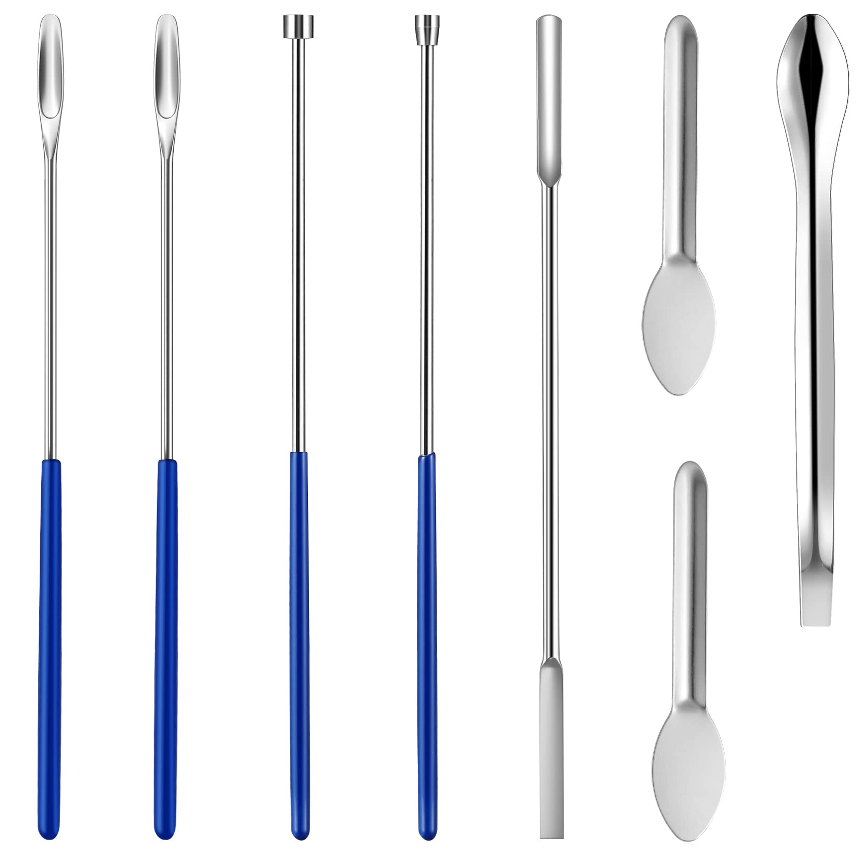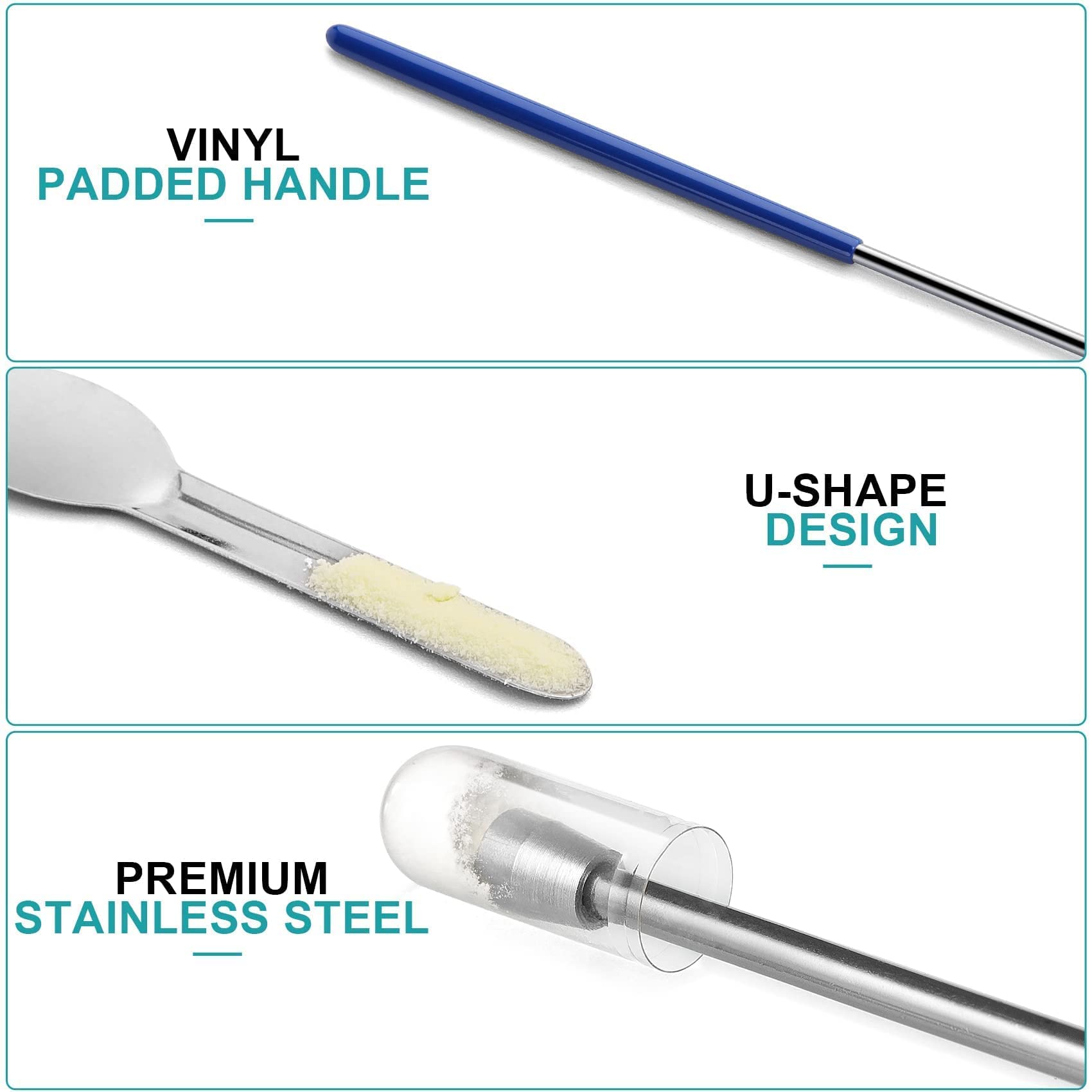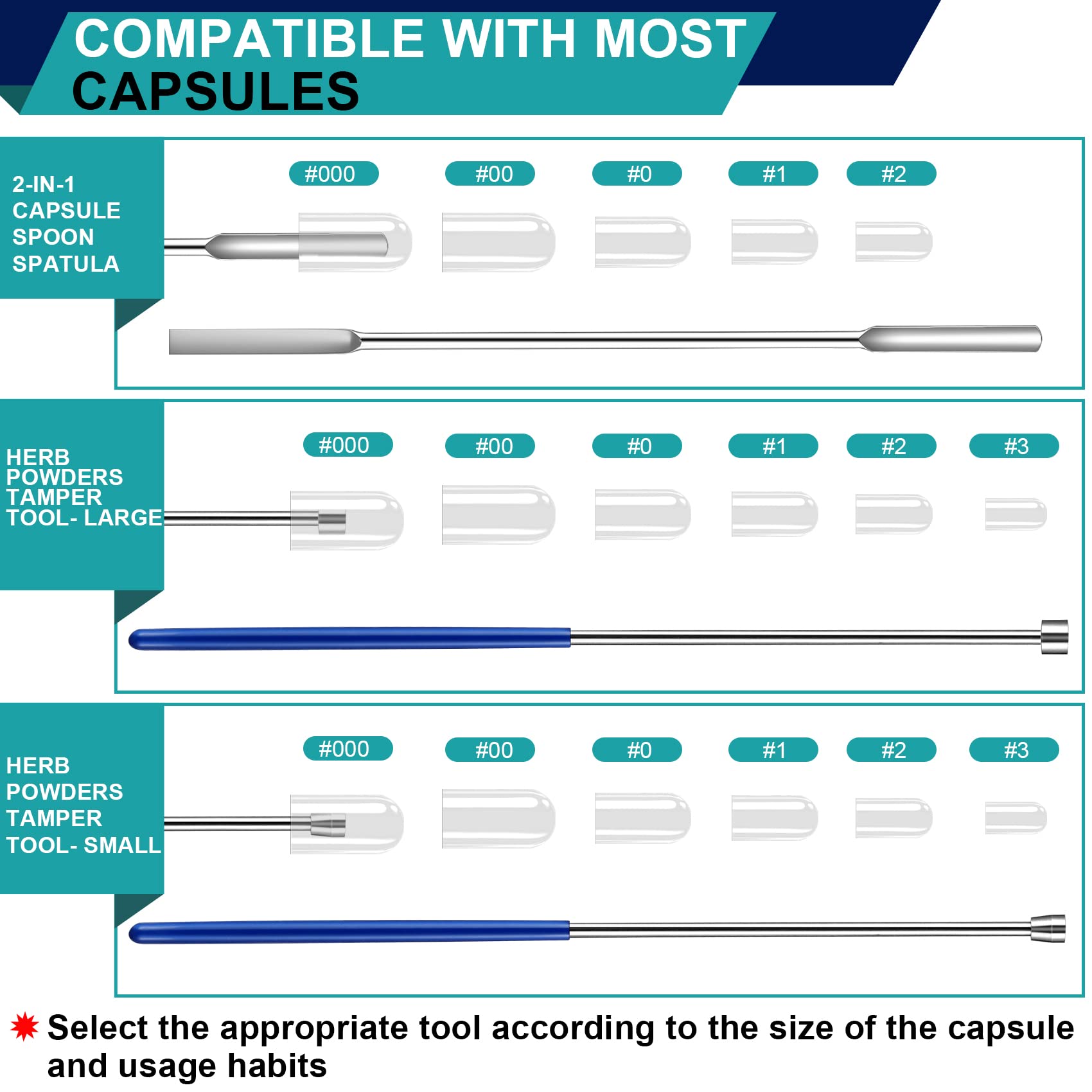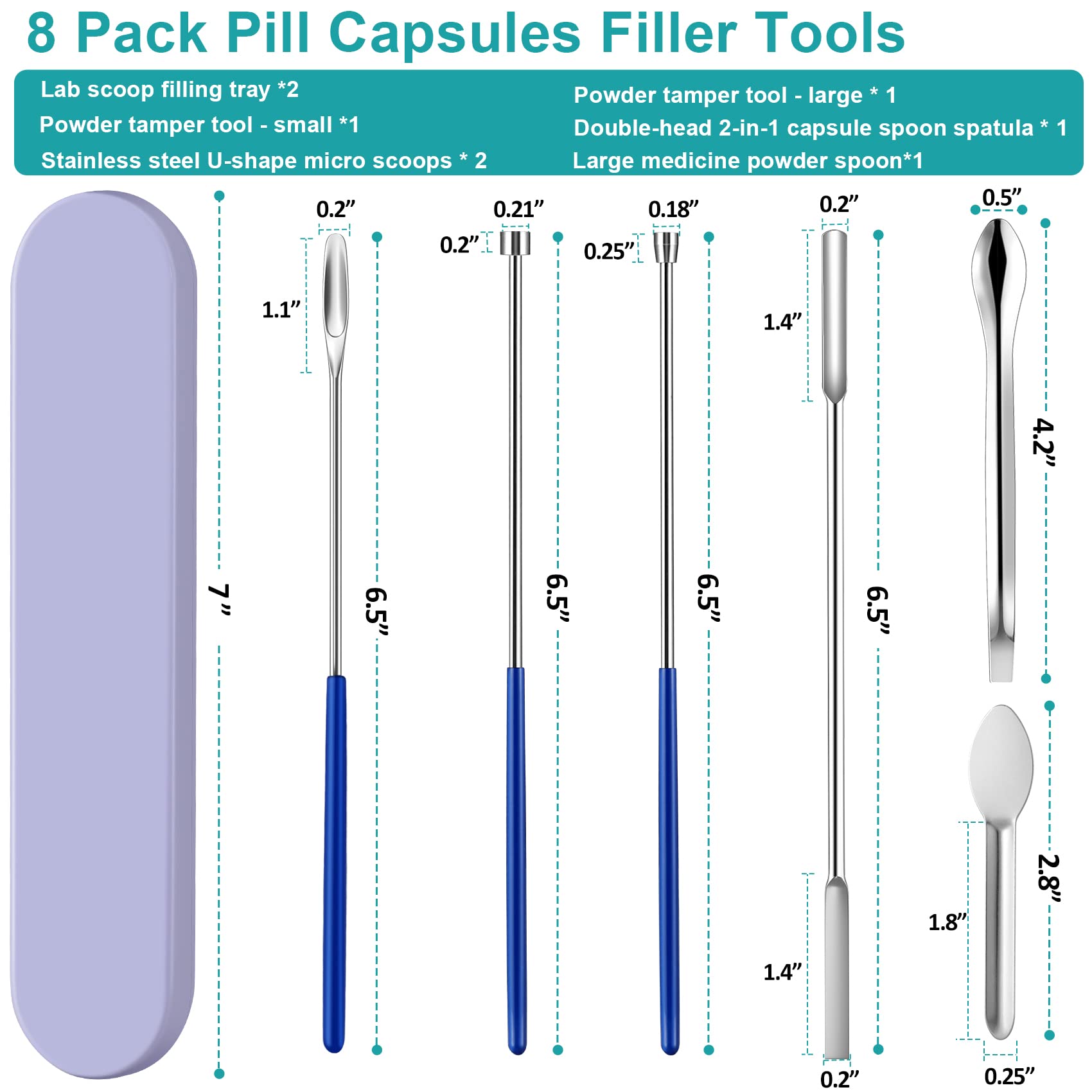 8 Pack spatula Tools -Select the appropriate tool according to capsule size and usage habits. 2 x lab scoop filling tray with good grip vinyl handle + 1 x powder tamper tool - small with good grip vinyl handle + 1 x powder tamper tool - large with good grip vinyl handle + 1 x double-head 2-in-1 capsule spoon spatula + 2 x stainless steel U-shape micro scoops + 1 x large powder spoon