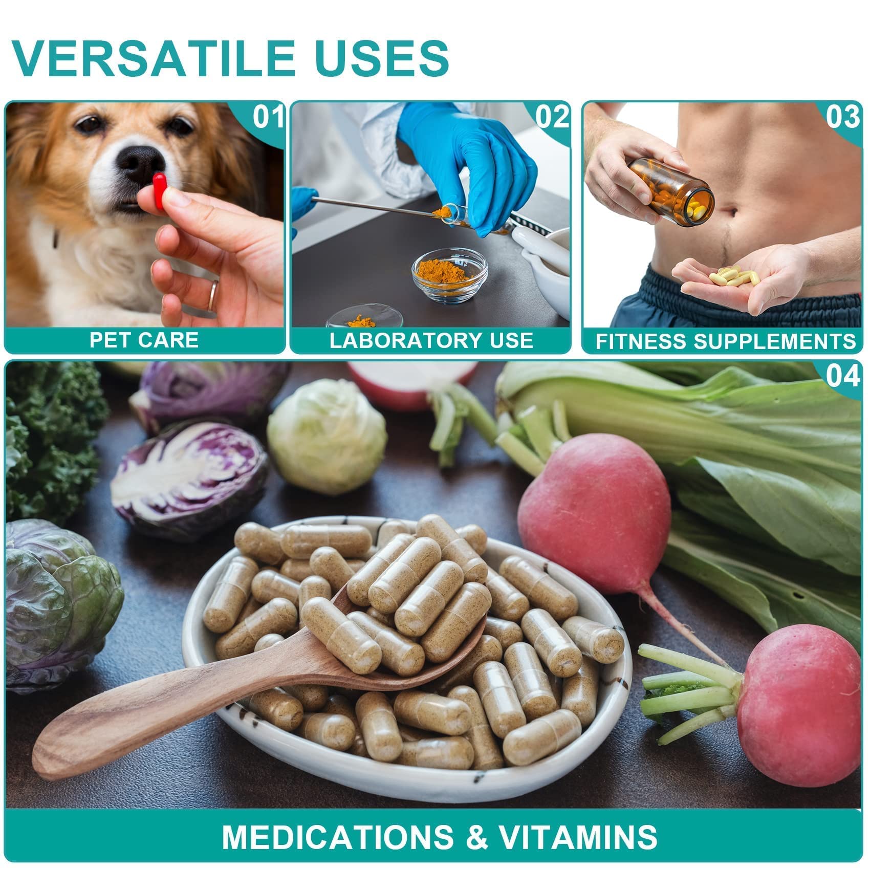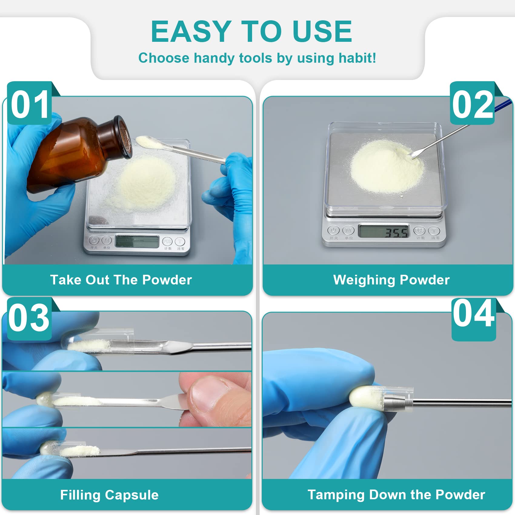 The lab scoop filling tray, stainless steel U-shape micro scoops or double-head 2-in-1 capsule spoon spatula help you weigh powder. The tamper tool helps you compact the powder and increase the capacity of the capsule.