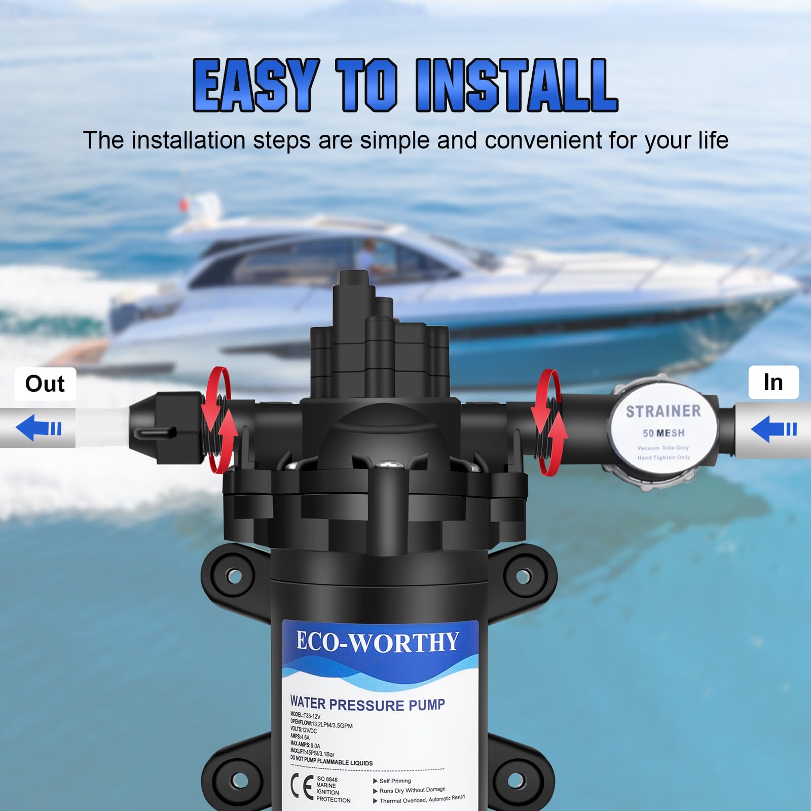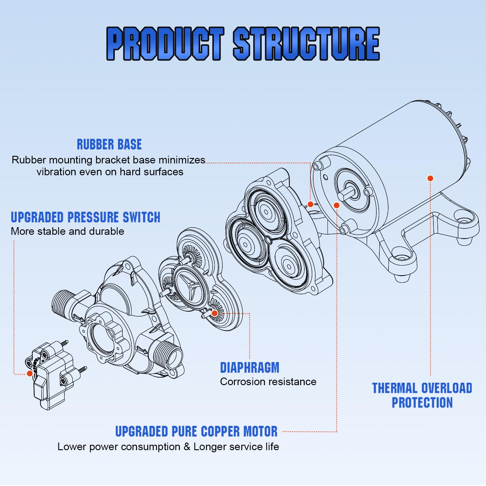 【Pump Features】: 12V DC water pump provides 3.5 gallons per minute water flow, the pressure switch is set to 50PSI, Self-Priming up to 9.8 vertical feet, lift up to 98 feet. 8 Max amps, It has built-in thermal overload protection