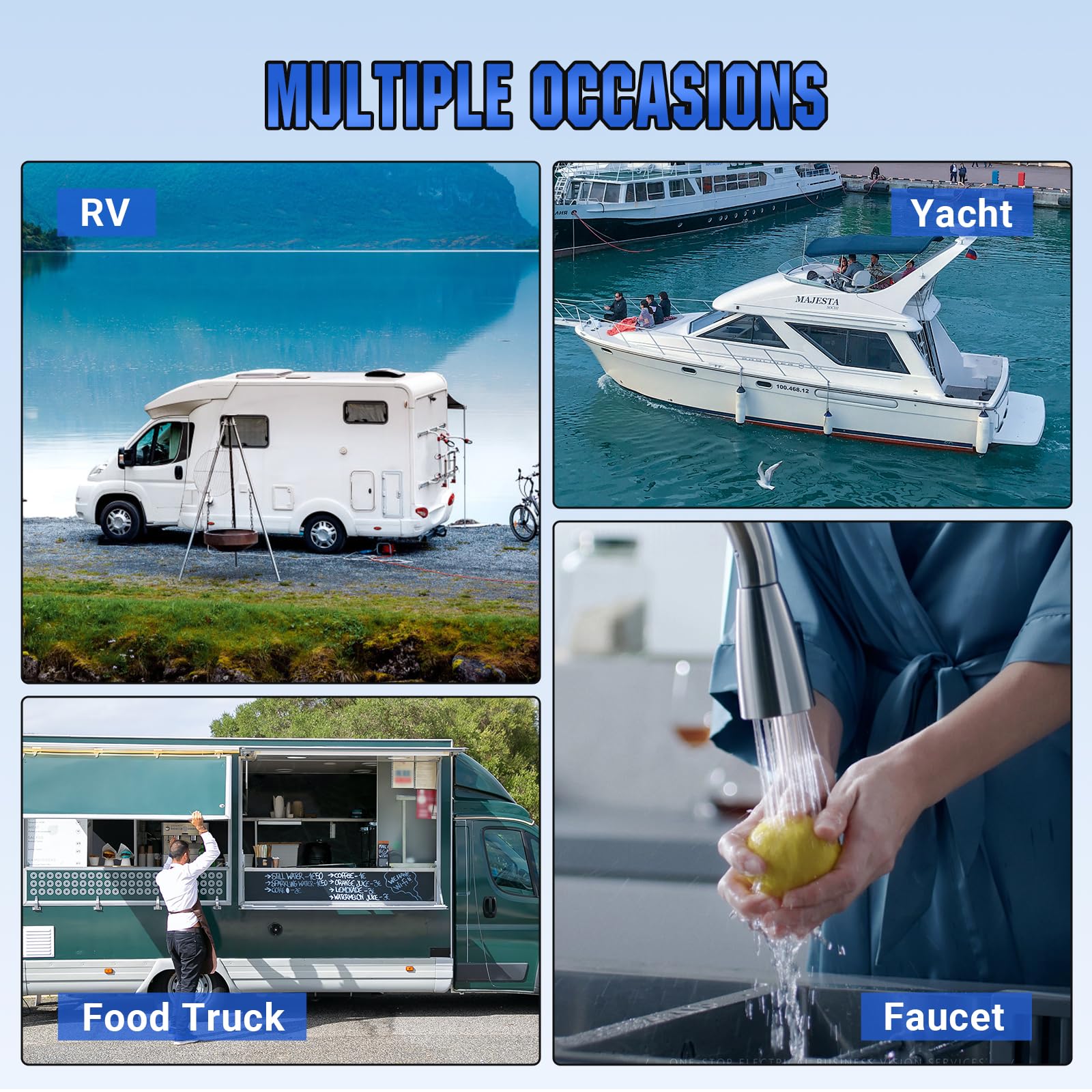 【Widely Applications】: The water pressure pump is easy to install and carry. It can be widely used in many fields, like RV, Yacht, Camper, Food Truck, etc