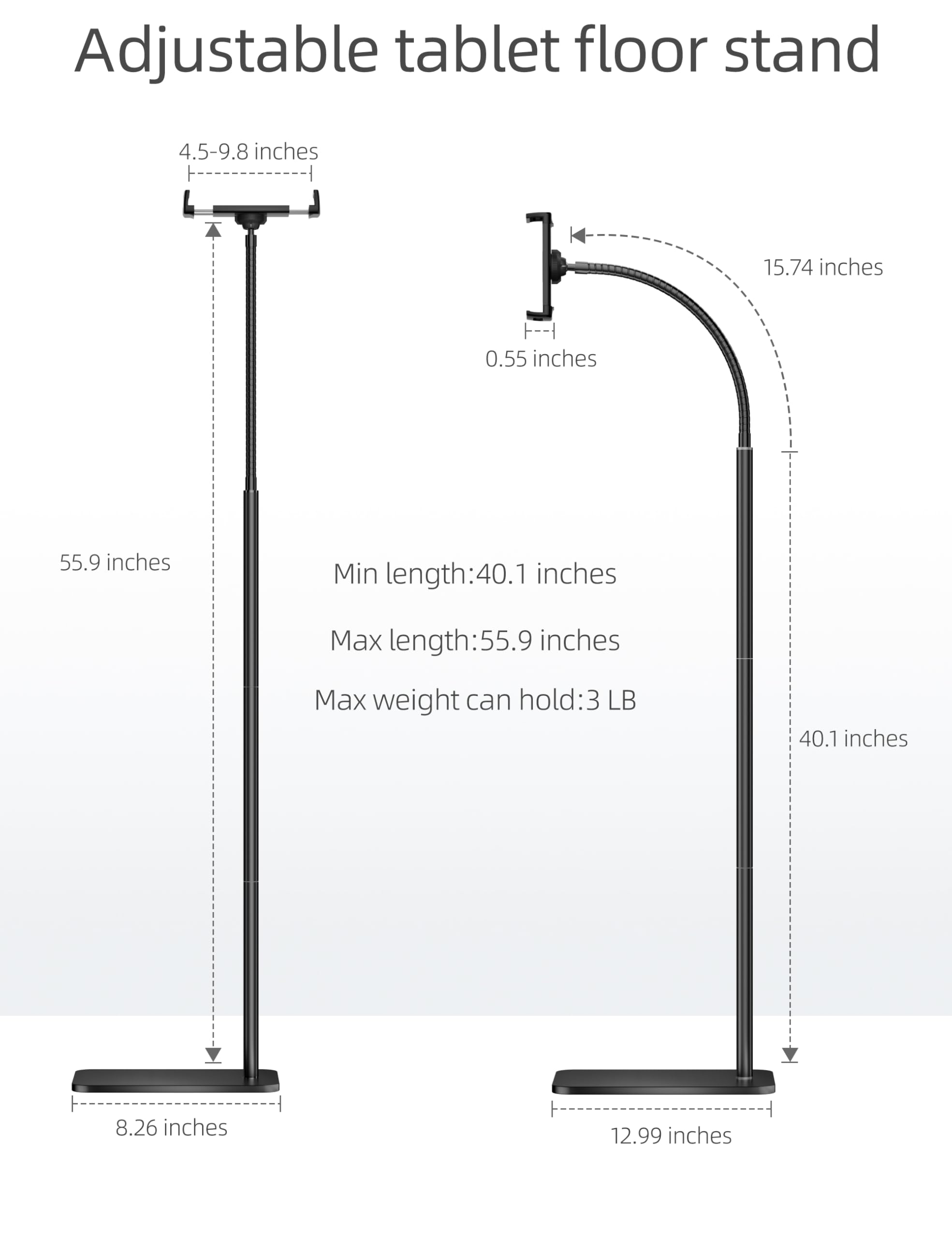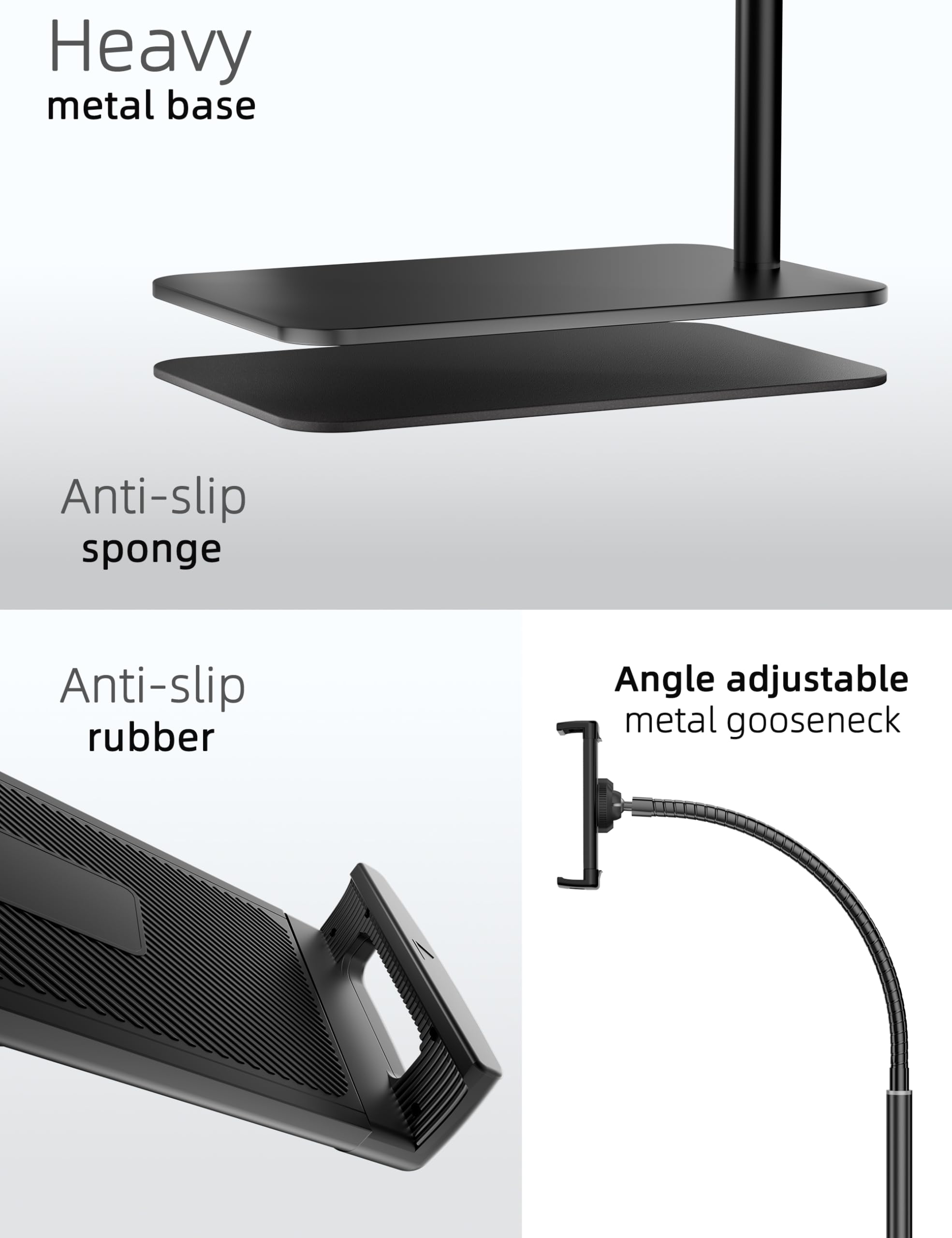 Strong Stability: Our iPad stand floor is designed to be stable and reliable, with a super heavy and wide base weighing 1.8kg. The gooseneck arm and extension tube are more durable than usual, providing safe and secure support for your device