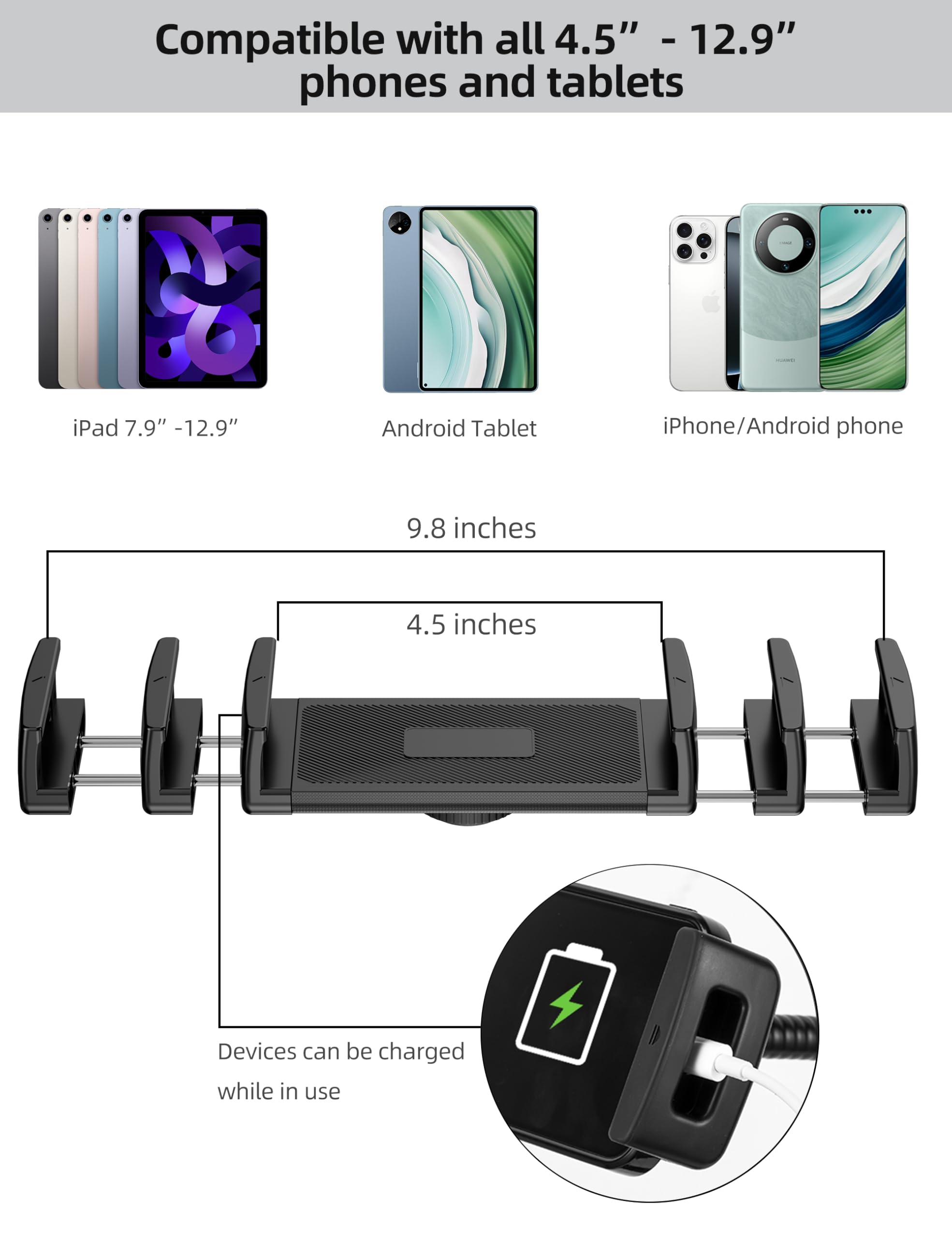 Wide Device Compatibility: Our iPad holder stand is universal and can hold smartphones and tablets between 4.7-13 inches, Compatible with iPad Mini Air Pro, Galaxy Tab, Kindle, and Cell Phones . Please refer to the above Compatible Devices and Compatible Phone Models