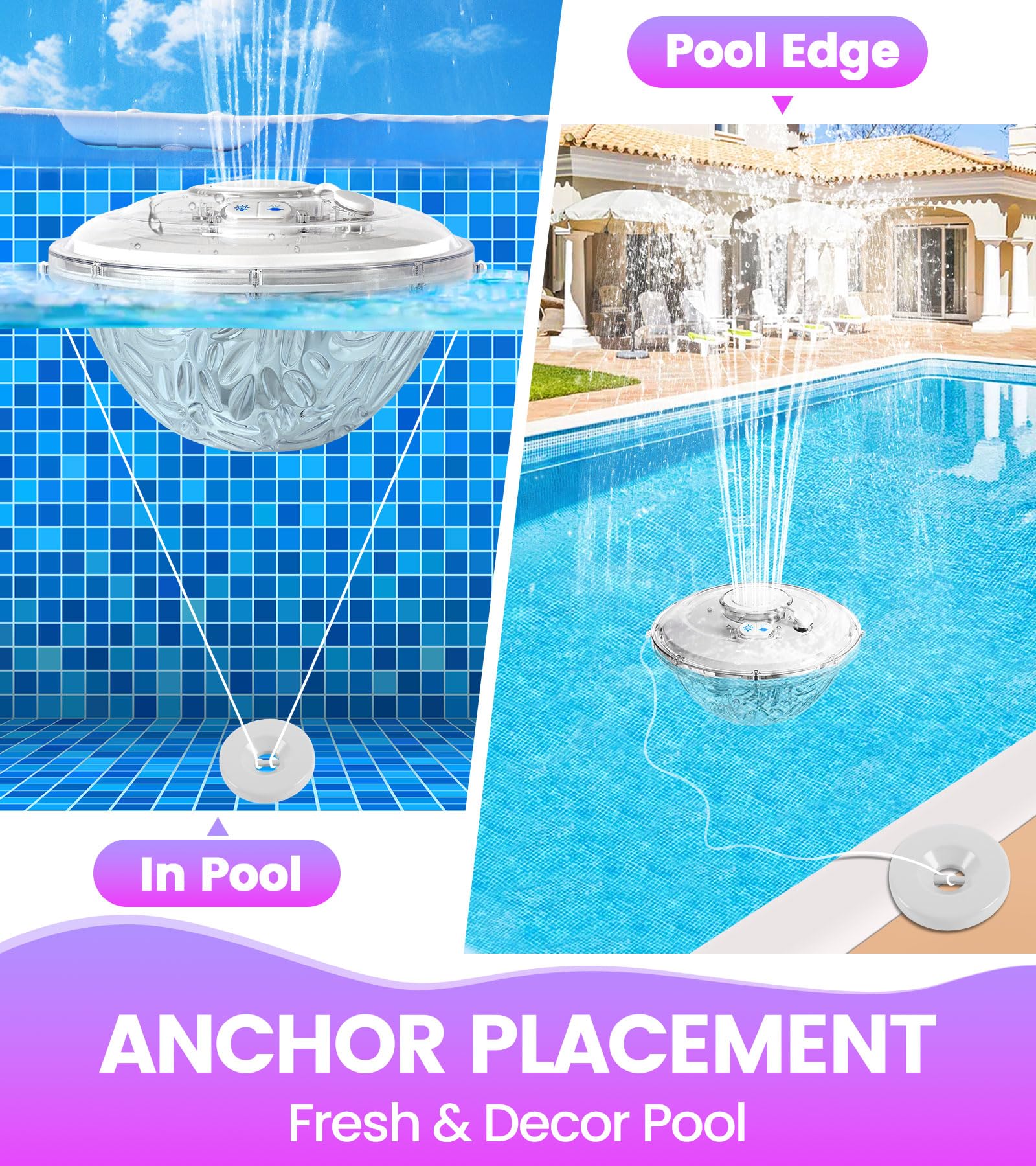 FIXABLE DESIGN: LanAqua pool fountain comes with a 120g anchor and a nylon string, you can place the anchor in the pool or secure it to the edge of the pool for easy reach. This not only effectively prevents the pool fountain from swaying from side to side and overflowing the pool, but also keeps the pool fountain in place wherever you want it in the pool