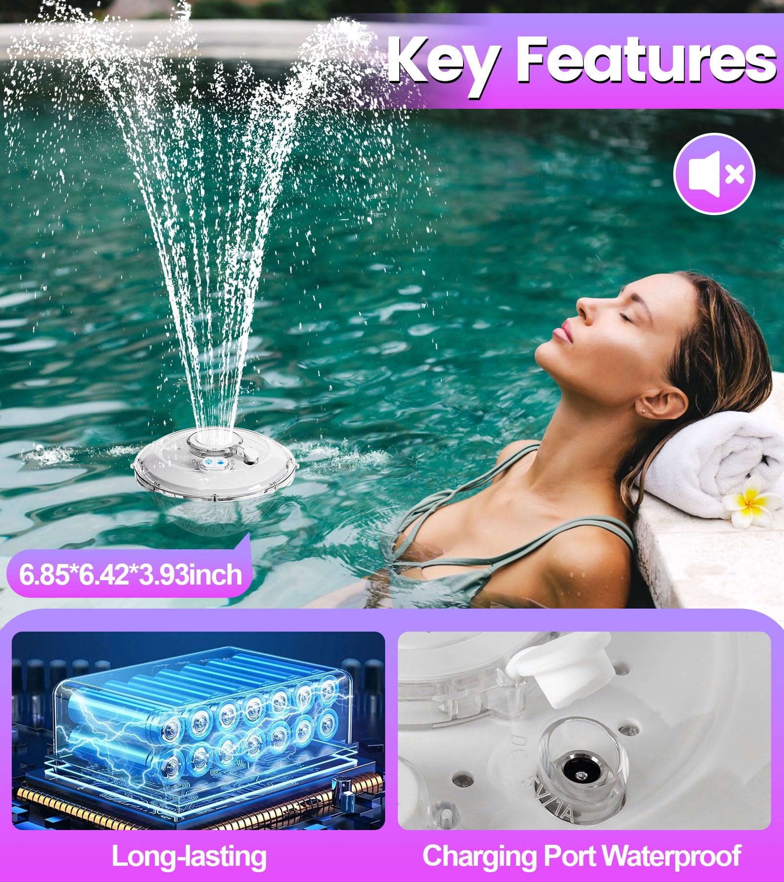 EASY TO USE: LanAqua pool fountains with no assembly required, features charge and use simplicity. The floating fountain pump has two simple buttons: Water Spray Mode and Light Show Mode. Long press the light button to turn off the light, long press the fountain button to turn off the water - so convenient! What's more, you can enjoy the fountain's highest spray mode and random spray mode. Dive into crystal-clear, fresh water, revitalizing your body and mind with each stroke